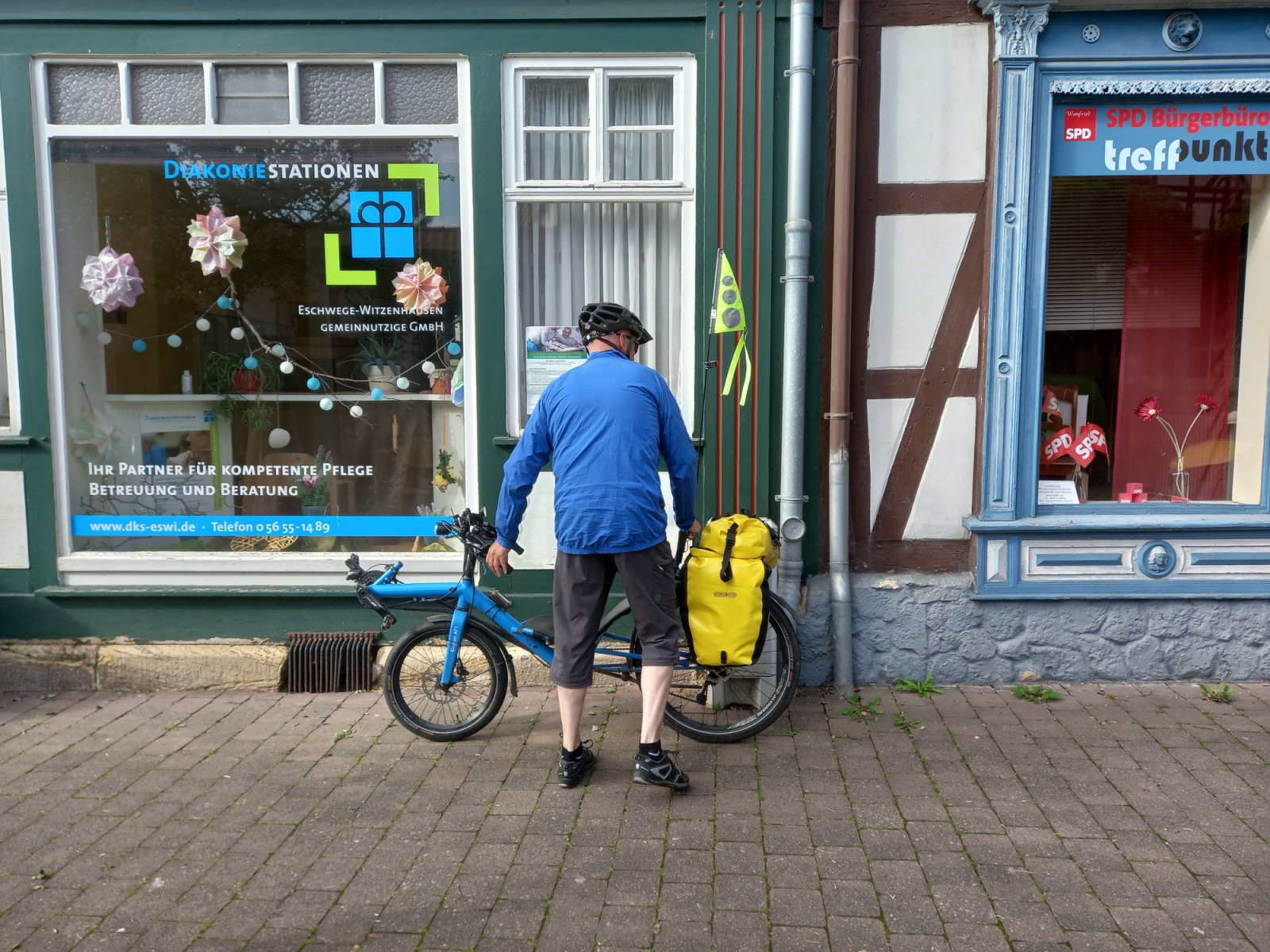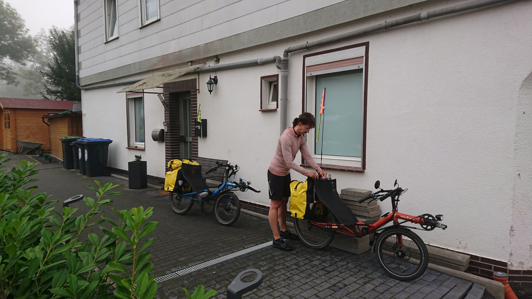 Unsere Übernachtung im Hotel „bike und hike“ sieht von außen nicht sehr einladend aus. Der Haupteingang ist auf der Rückseite in einer kleinen Seitenstraße. Alles sieht ein wenige schmuddelig und vernachlässigt aus, an allen Fenstern im Eingangsbereich sind die Rolläden heruntergelassen. Ganz anders dann das Innere: Saubere Zimmer mit guter Ausstattung, nettes Ambiente, freundliches Personal. Auch das Frühstück am nächsten Morgen ist voll okay, wir finden alles, was wir uns wünschen.