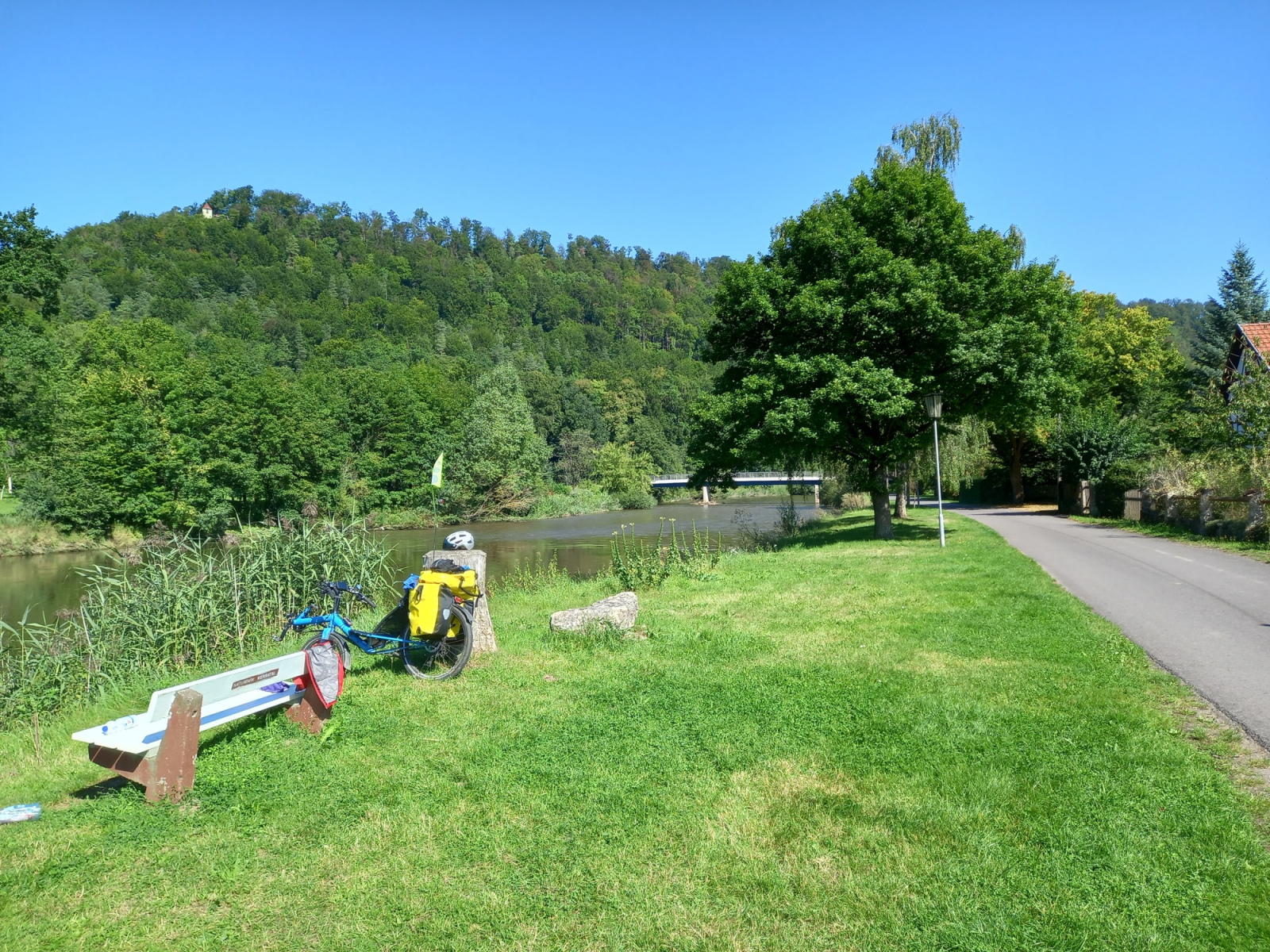 In Buchenau nach rund 44km machen wir eine erste Pause auf einem Rastplatz an der Werra. Früher war hier eine hölzerne Brücke. Ein älteres Ehepaar, das eine Tagestour entlang der Werra unternimmt, erzählt uns einiges über das Land, die Leute, und wo es was zu sehen gibt und wo man gut essen könne.