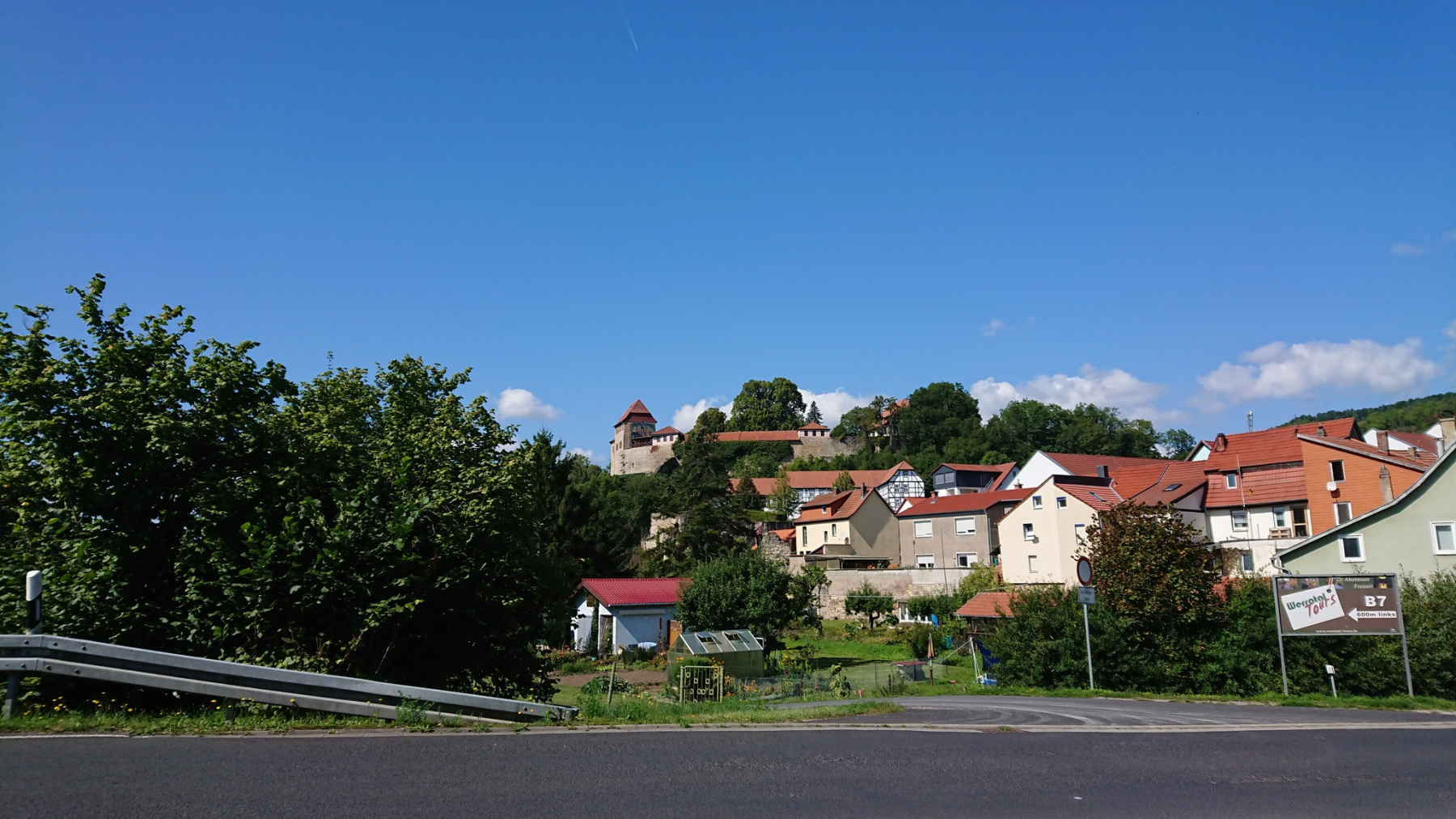 In Creuzburg verpassen wir die Abfahrt zur alten Werrabrücke, fahren zunächst entlang der Bundesstraße weiter, aber den Blick von der alten Werrabrücke wollen wir dann doch genießen. So drehen wir um.