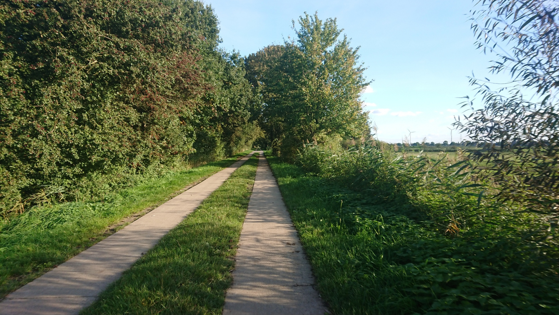 und wir merken, das es merklich abkühlt. Aber wir haben auch nur noch rund 10k bis nach Hause. Und den Marschenbahndamm haben wir auch überwiegend ganz für uns alleine. Auf diesem alten Bahndamm mit einer Länge von rund 30km kann man entspannt radeln, denn bis auf einige Straßenquerungen ist man von Verkehr auf den Straßen entkoppelt, kann auf den Wiesen im Sommer den einen oder anderen Storch oder auch mal Rehe sehen und am Himmel kreist schon mal ein Geifvogel.