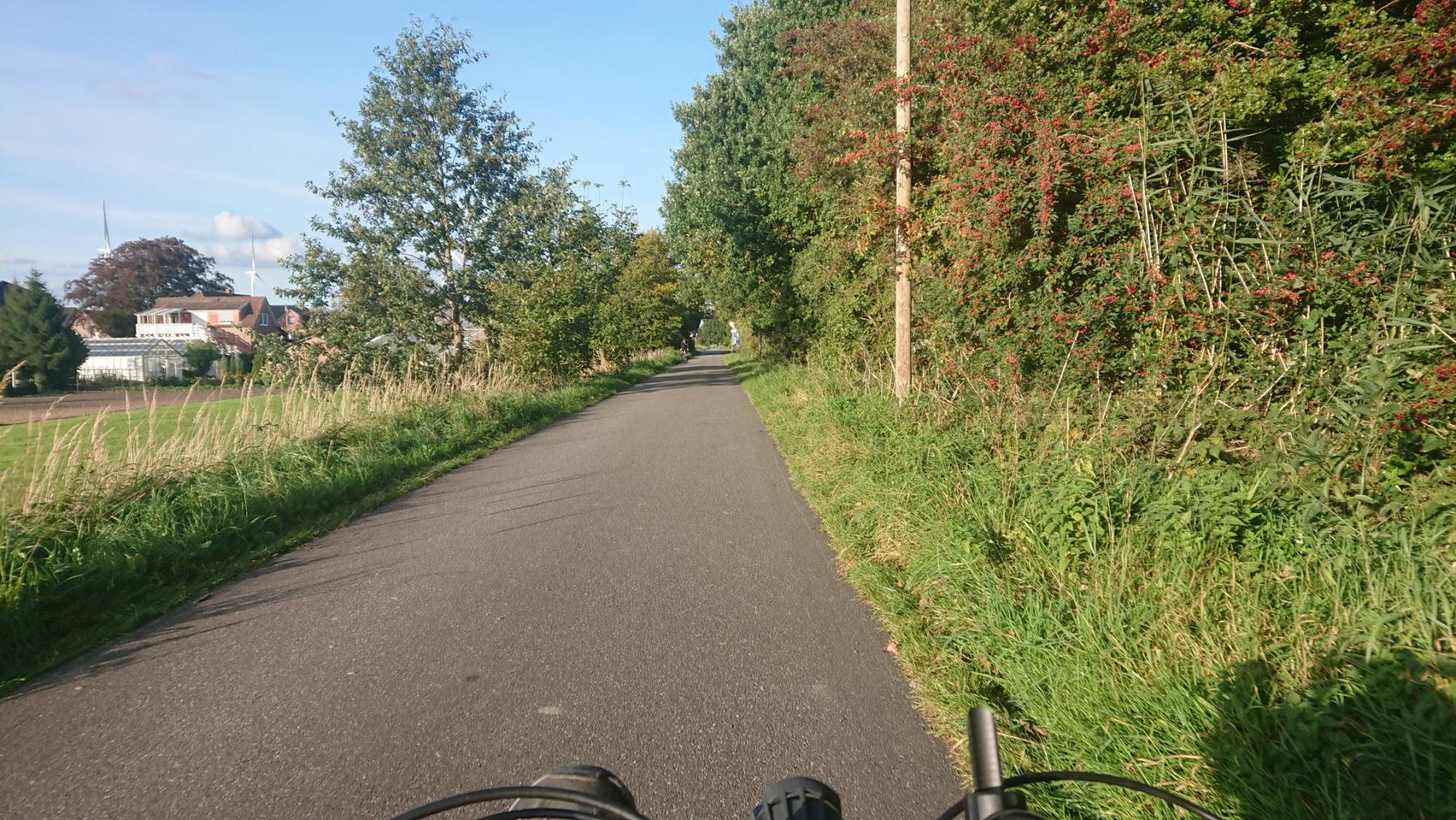 Ein tolles Gefühl aber schnell wird es kühler, nach rund einer halben Stunde muss ein zweites T-Shirt zwischen gezogen werden. Und in Tatenberg wechsel ich die Weste gegen die leichte Windbreaker-Weste aus. Auf dem Marschenbahndamm dann auch hin und wieder mal Bäume und Sträucher, die sich langsam bunt verfärben.