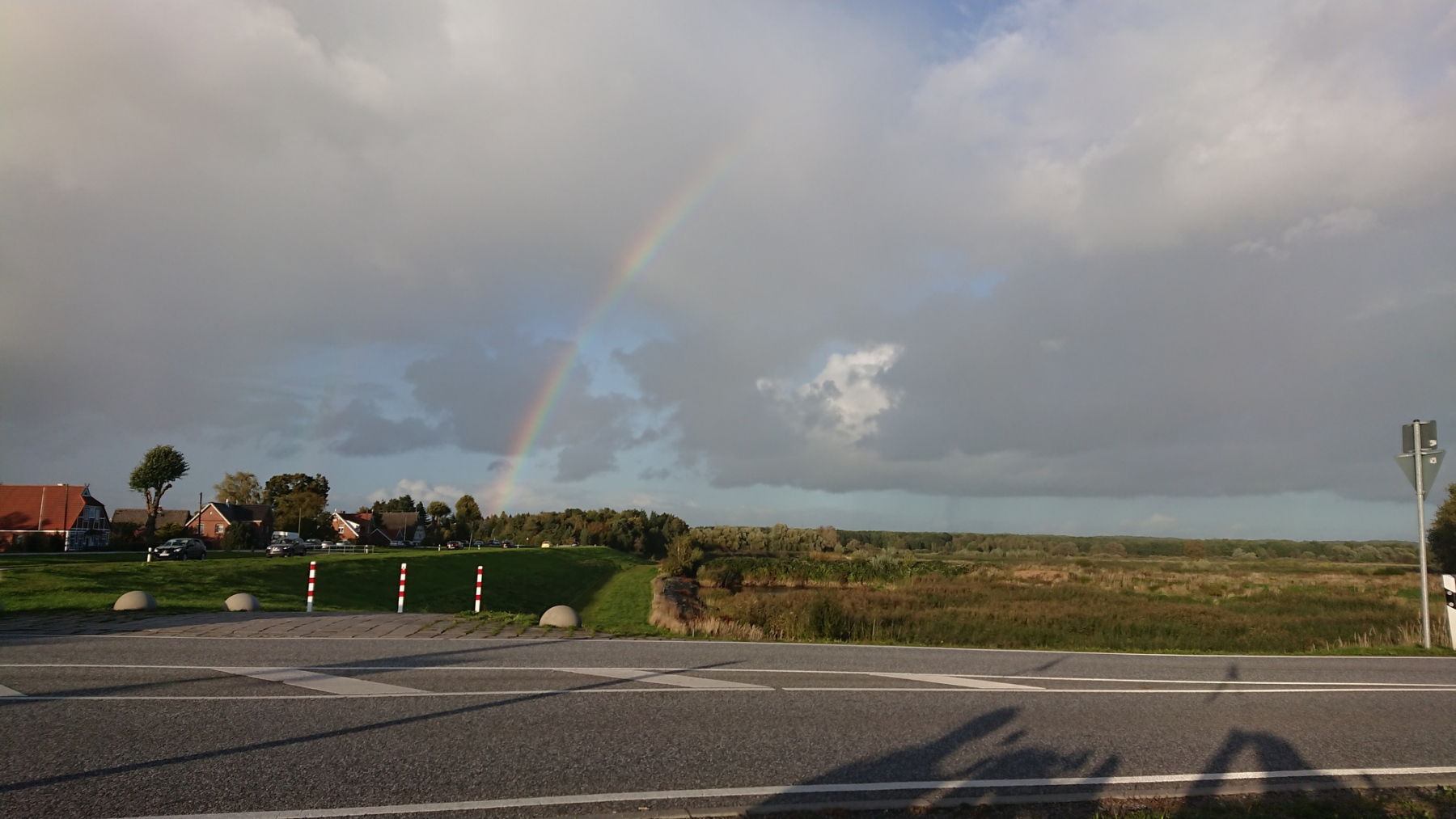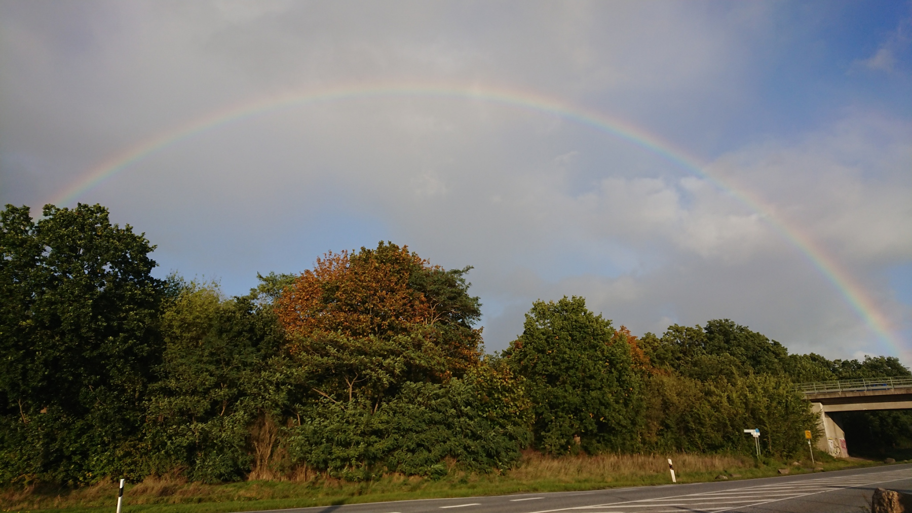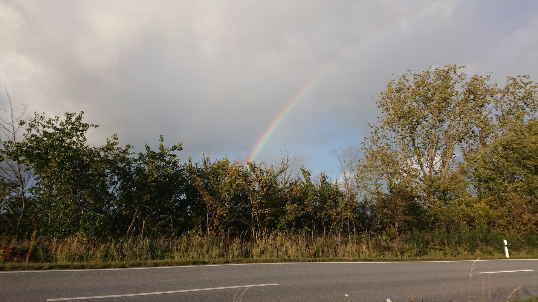 Es kommt ja nicht oft vor aber diese Woche hatten wir es zwei mal : Regenbogen. Am Dienstag war ich unterwegs, die Wolken waren dick und dunkel und links und rechts von mir sah ich, dass sie ihren Regen auf die Erde niedergehen ließen. Aber genau bei mir waren die Wolken nicht ganz so dicht und es blieb auch trocken. Auf der Rücktour sah ich immer wieder Teile einen Regenbogens. Wo ein Regenbogen entsteht, scheint die Sonne und irgendwo muss es regnen, damit die Regentropfen das Sonnenlicht in die Spektralfarben aufspalten können. Ein Blick in den Spiegel zeigte hinter mir dunkle Wolken. Ich habe es nicht mehr geschafft, trocken nach Hause zu kommen.