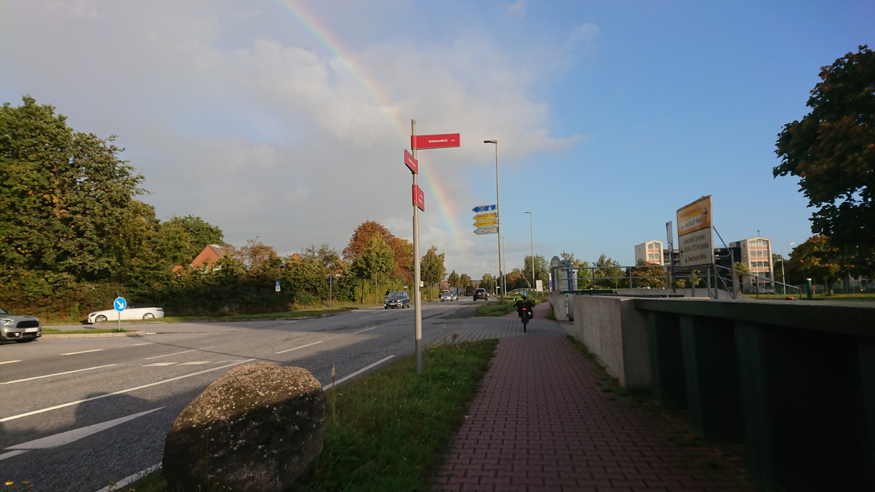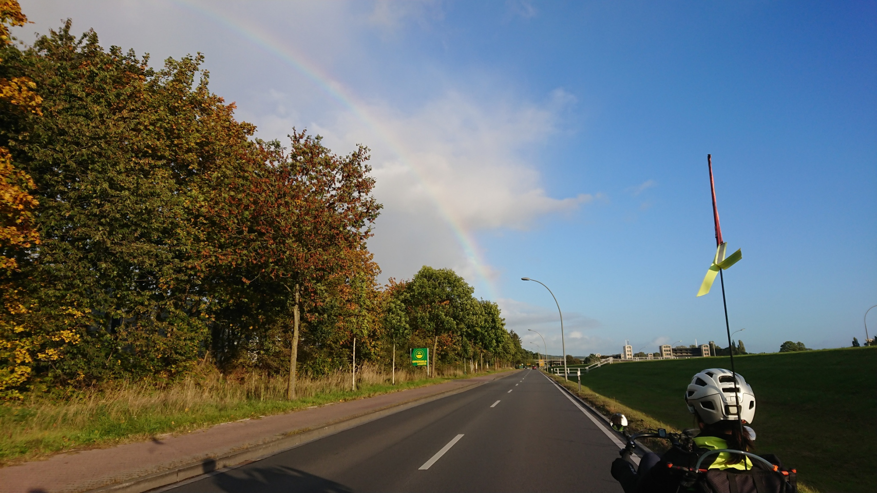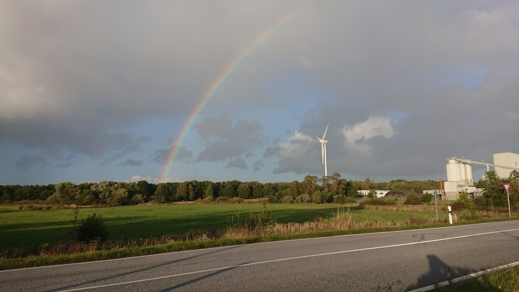 Es kommt ja nicht oft vor aber diese Woche hatten wir es zwei mal : Regenbogen. Am Dienstag war ich unterwegs, die Wolken waren dick und dunkel und links und rechts von mir sah ich, dass sie ihren Regen auf die Erde niedergehen ließen. Aber genau bei mir waren die Wolken nicht ganz so dicht und es blieb auch trocken. Auf der Rücktour sah ich immer wieder Teile einen Regenbogens. Wo ein Regenbogen entsteht, scheint die Sonne und irgendwo muss es regnen, damit die Regentropfen das Sonnenlicht in die Spektralfarben aufspalten können. Ein Blick in den Spiegel zeigte hinter mir dunkle Wolken. Ich habe es nicht mehr geschafft, trocken nach Hause zu kommen.