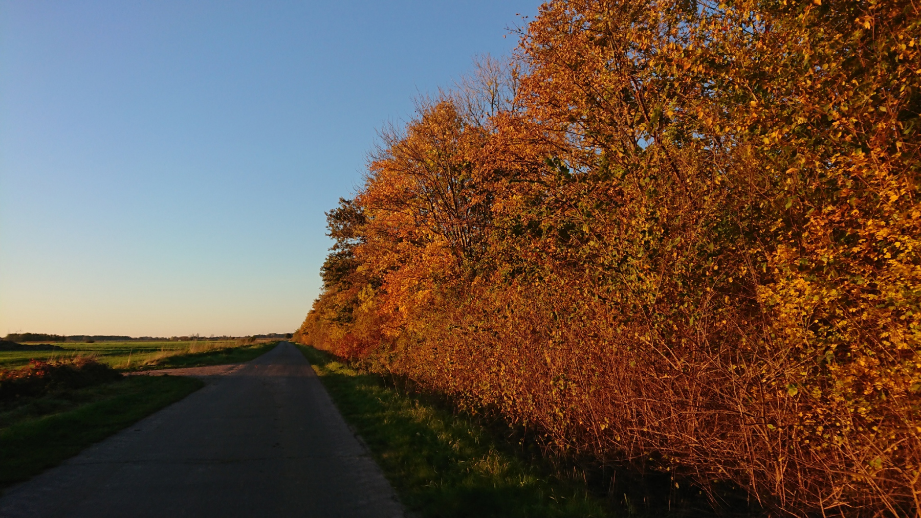 Die Bäume haben schon viel von ihrem Laub verloren und die Blätter sind schon nicht mehr ganz so farbenfroh, aber schön anzusehen ist es dennoch und erholsam außerdem, denn die Route heute führt mich meist abseits der Straßen. Am Ilmenaudeich kann ich mich für 1.5 km an eine Rennradler dranhängen, dann trennen sich unsere Wege wieder und ich bin wieder allein unterwegs. Die Sonne nähert sich schnell dem Horizont und für die tollsten Bilder bin ich fast schon zu spät dran.