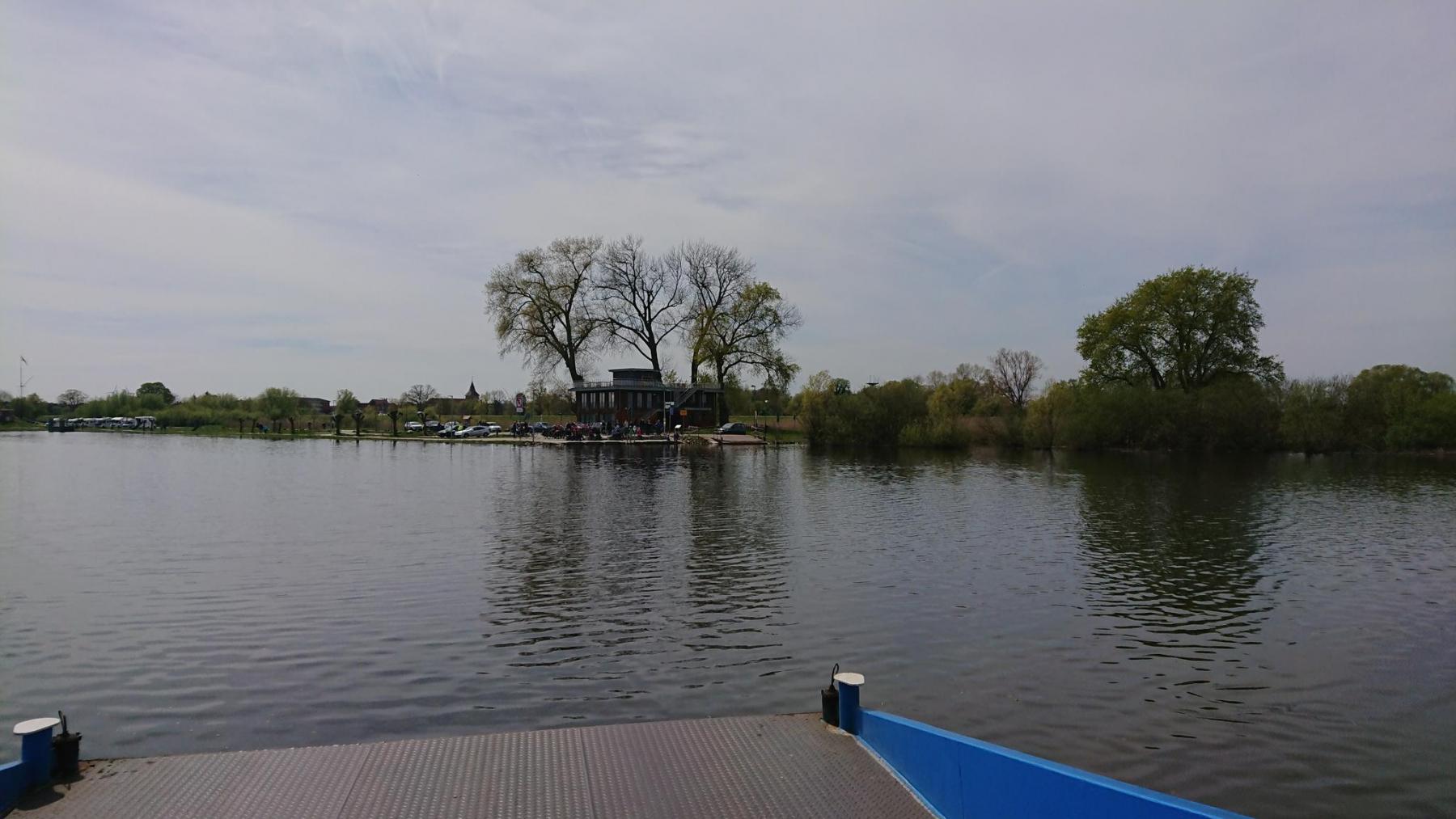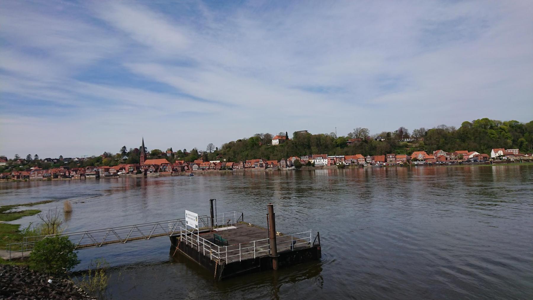 Die Elbe hat Hochwasser und ist gerade noch in Ihrem Bett. Bei normalem Wasserstand geht man eine Rampe runter bzw rauf, wenn man auf die Fähre oder von der Fähre geht. Heute können wir ohne Höhenunterschied auf die Fähre und auch wieder hinunter.