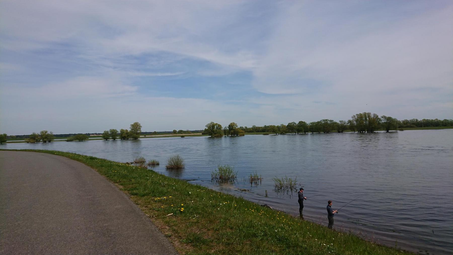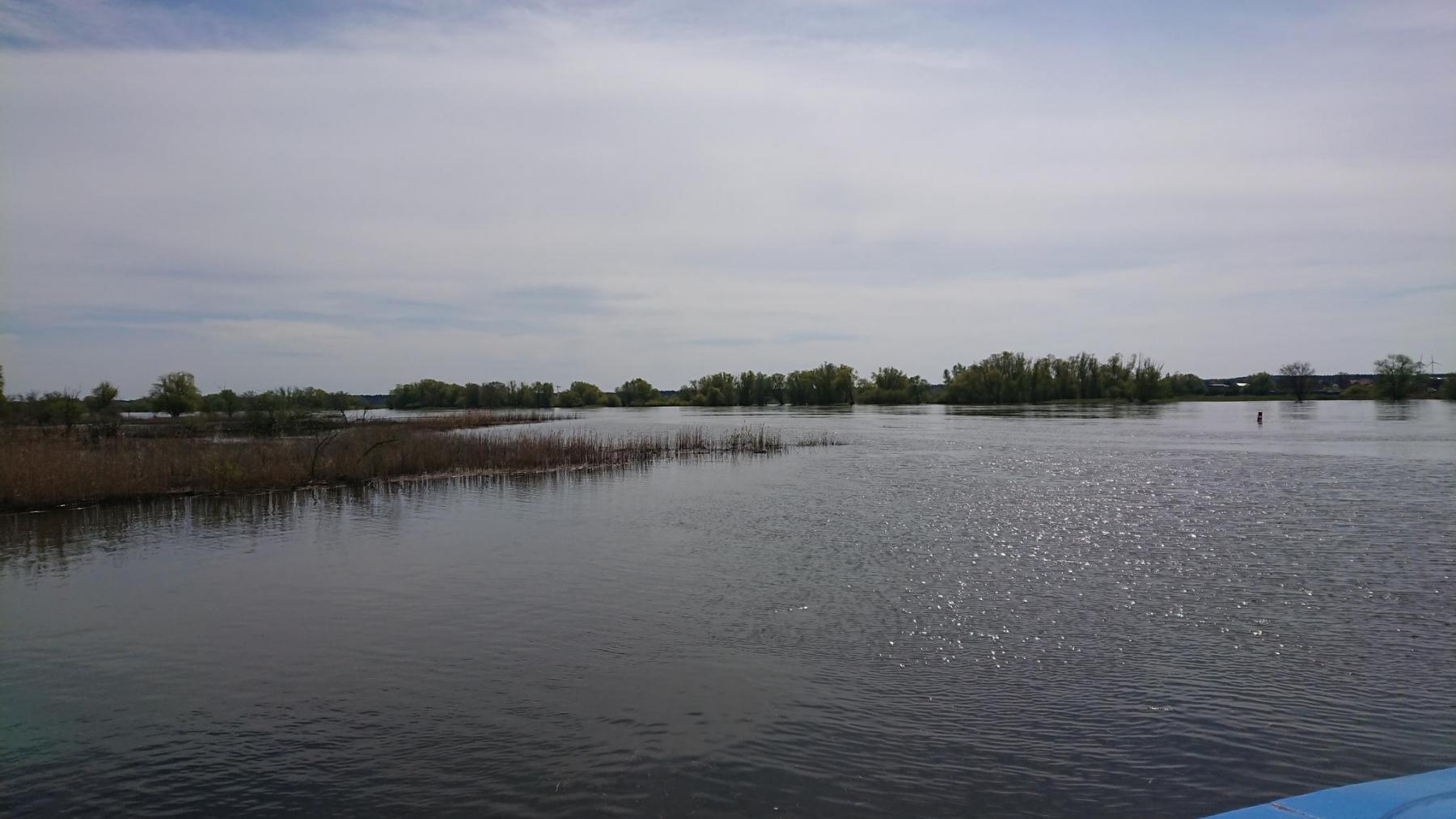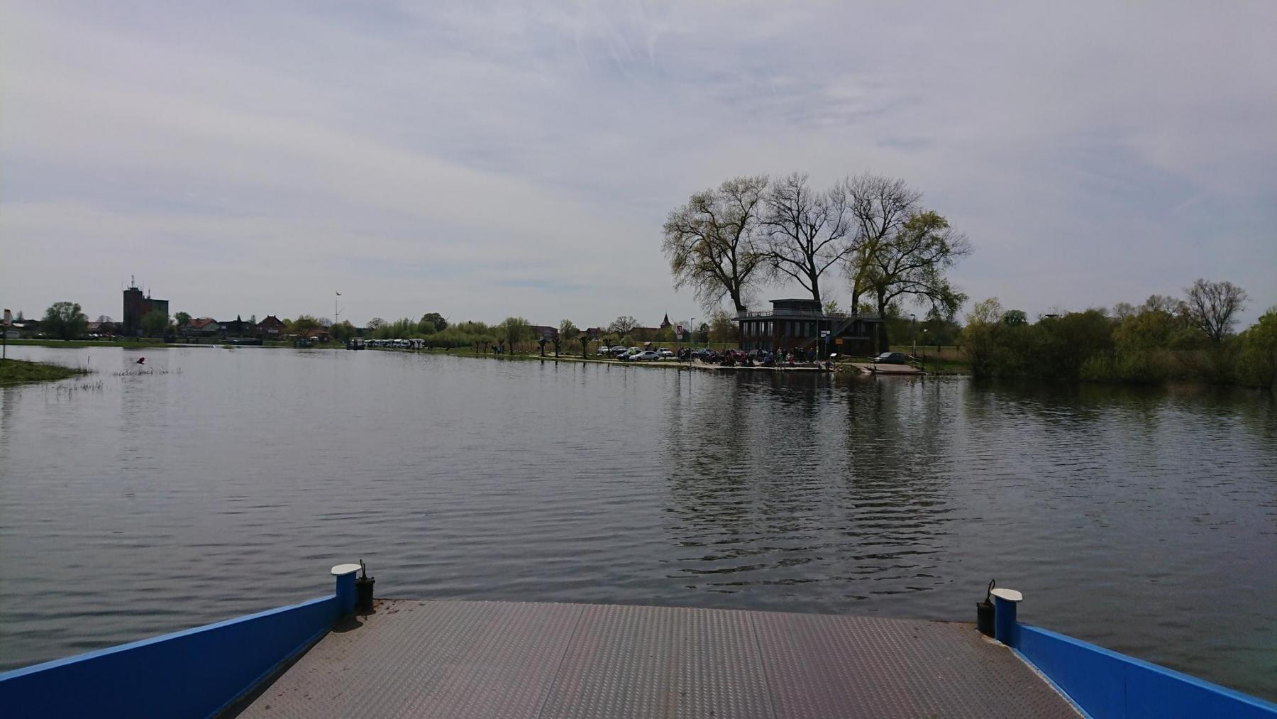 Die Elbe hat Hochwasser und ist gerade noch in Ihrem Bett. Bei normalem Wasserstand geht man eine Rampe runter bzw rauf, wenn man auf die Fähre oder von der Fähre geht. Heute können wir ohne Höhenunterschied auf die Fähre und auch wieder hinunter.
