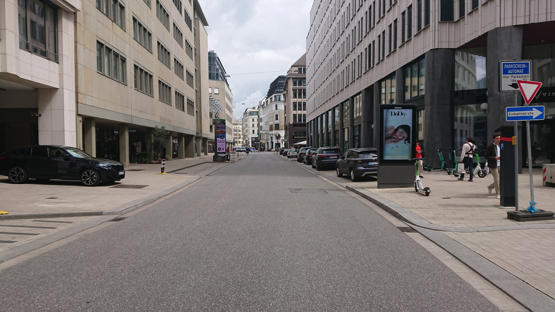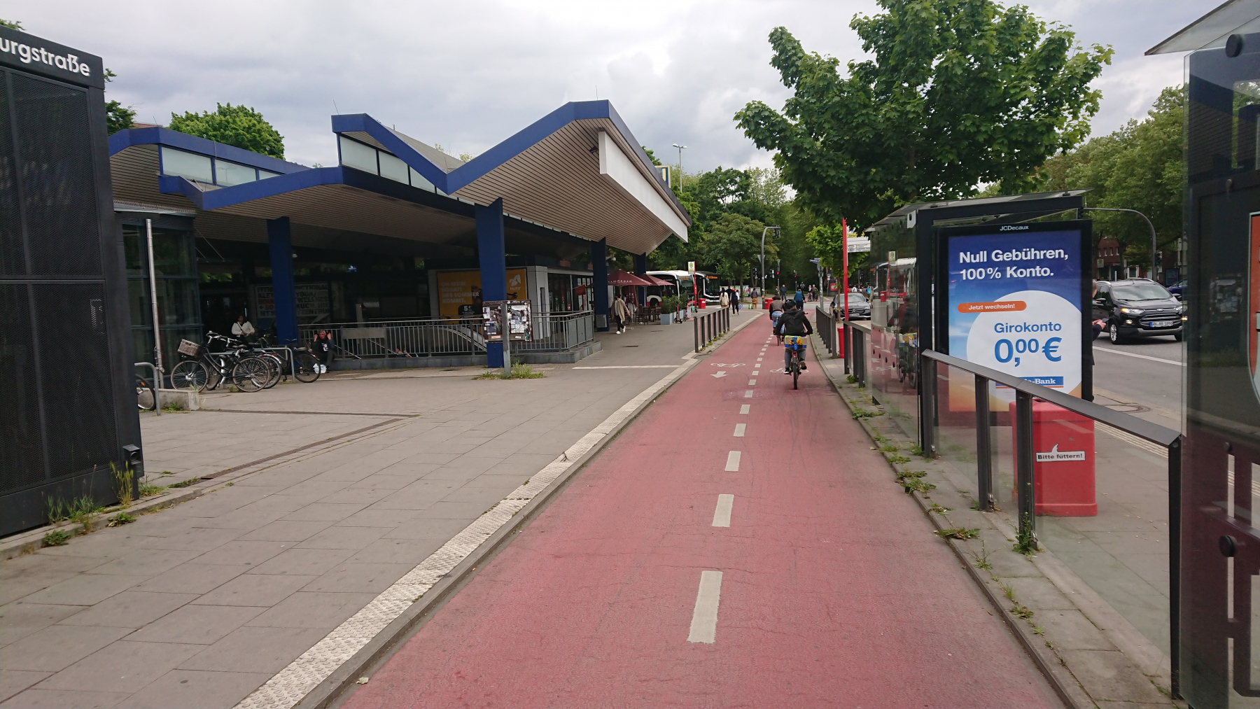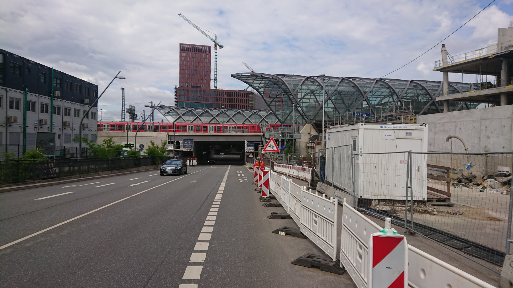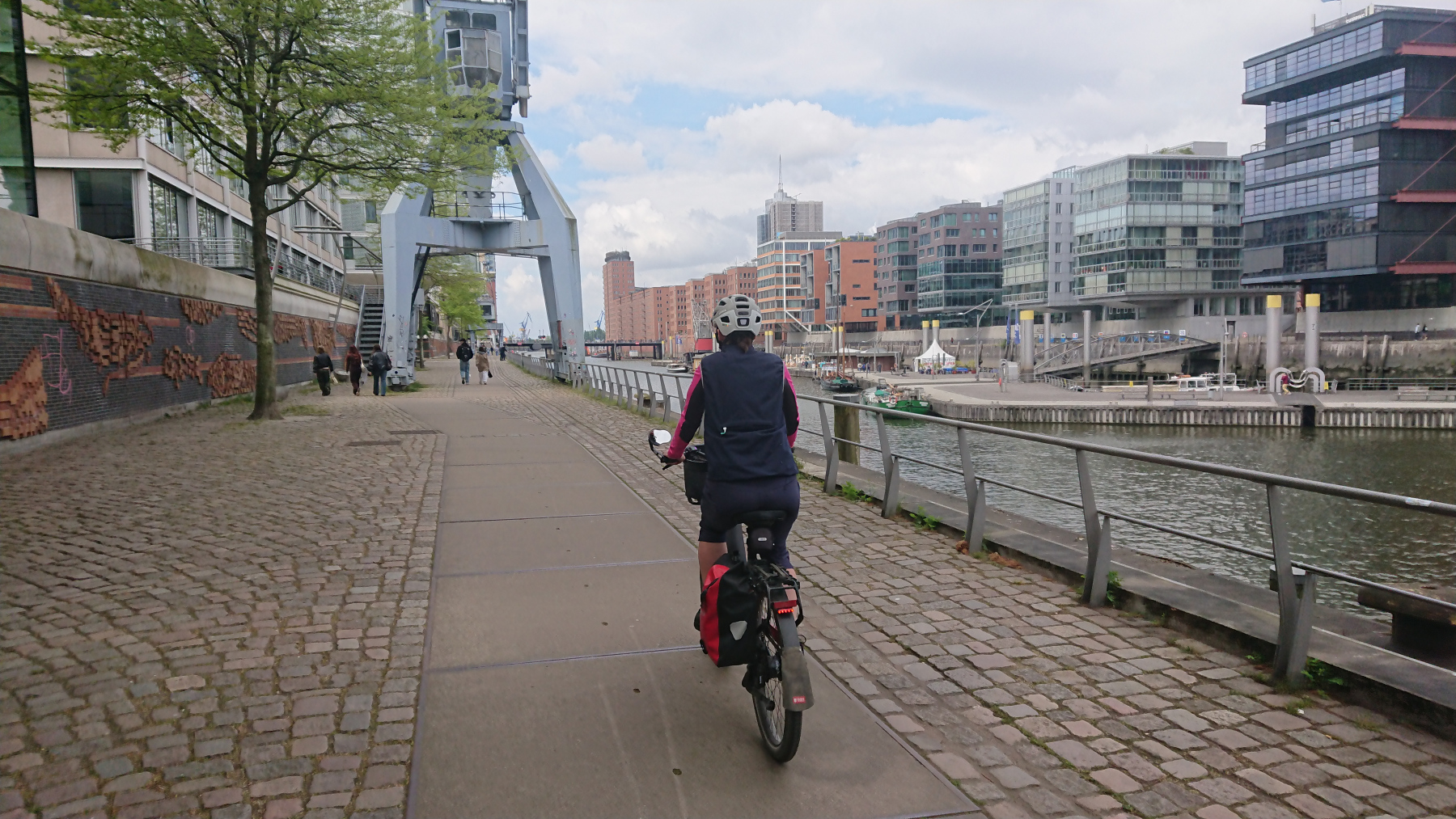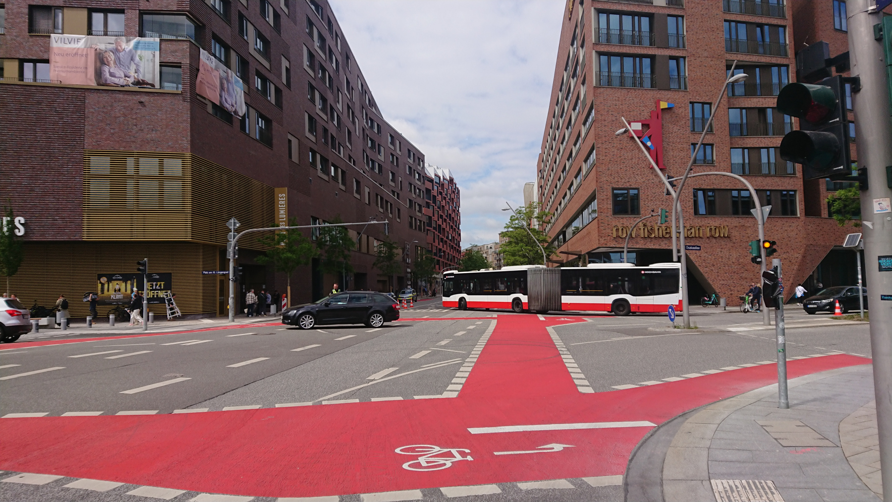 Vorbei am Elbtower. Unter dem Bahnhof Elbbrücken hindurch und rein in das Neubaugebiet Baakenhafen geht es netlang der Versmannstraßen in Richtung Hafen-Universität und Hafen-City. Die Überseeallee ist halbseitig gesperrt, im und um das Überseequartier findet der HafenCityRun statt. Überall Läufer. Hamburg hat in der Hafen-City nicht mit Farbe gespart. Überall rote Flächen, die wir manchmal sogar mit dem Fahrrad nutzen können. Am Überseequartier ist wieder Polizei im Einsatz um den Ansturm auf das neue Westfield-Center irgendwie in den Griff zu bekommen.