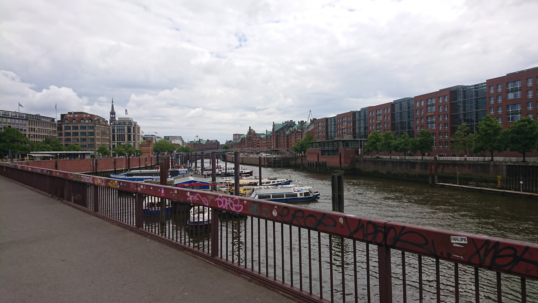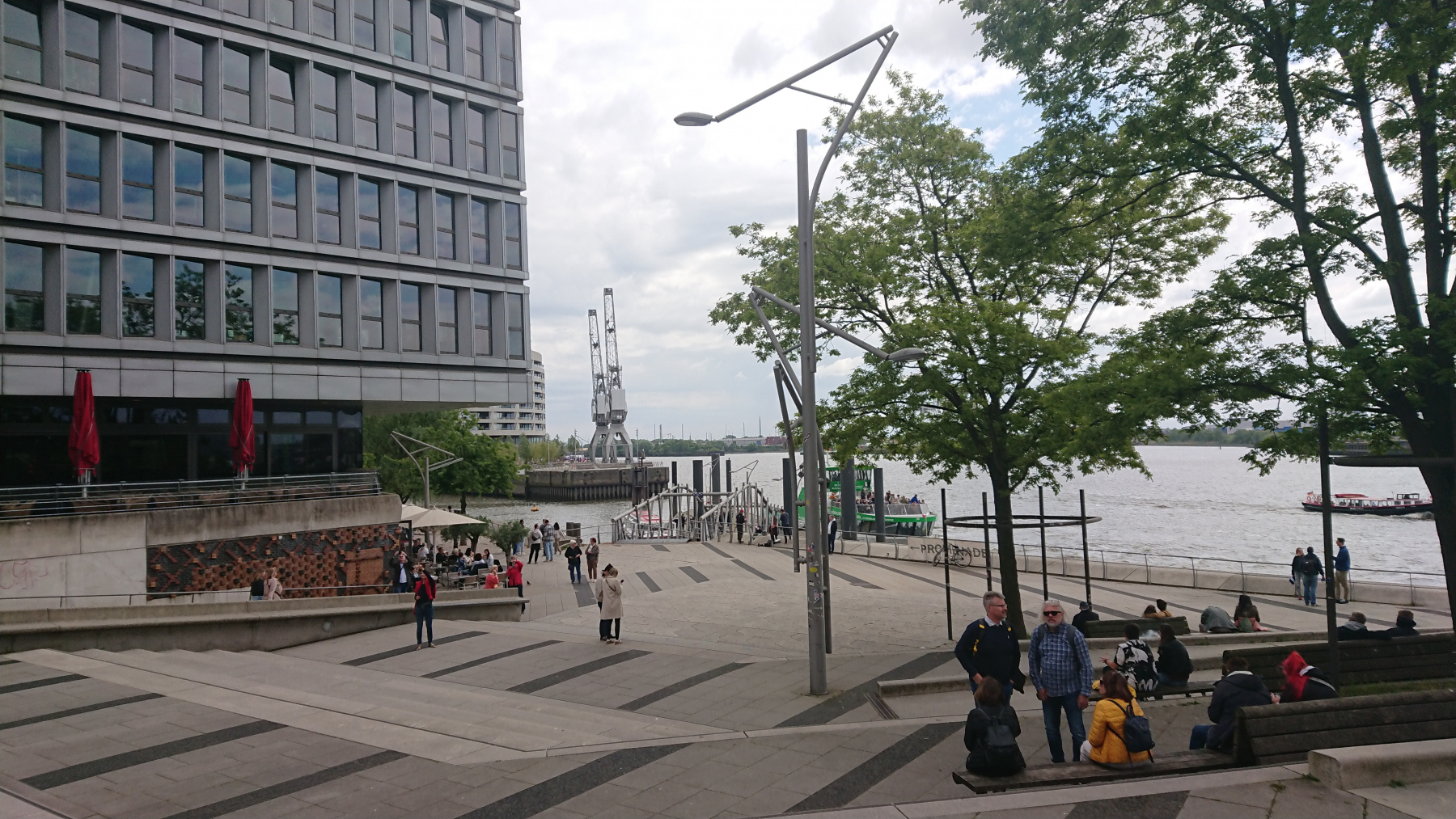 Am Sandtorhafen machen wir eine Rast – Nett gestaltet, aber uns eigentlich viel zu voll. Wir genießen unser Franzbrötchen auf einer Bank an den Magellan-Terrassen und schauen uns das Treiben zu.