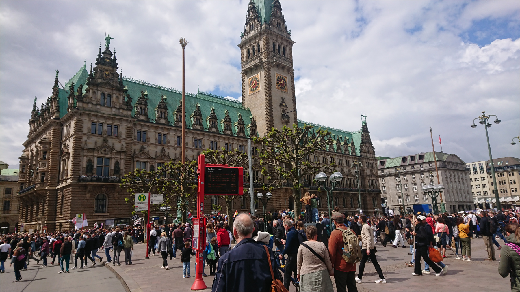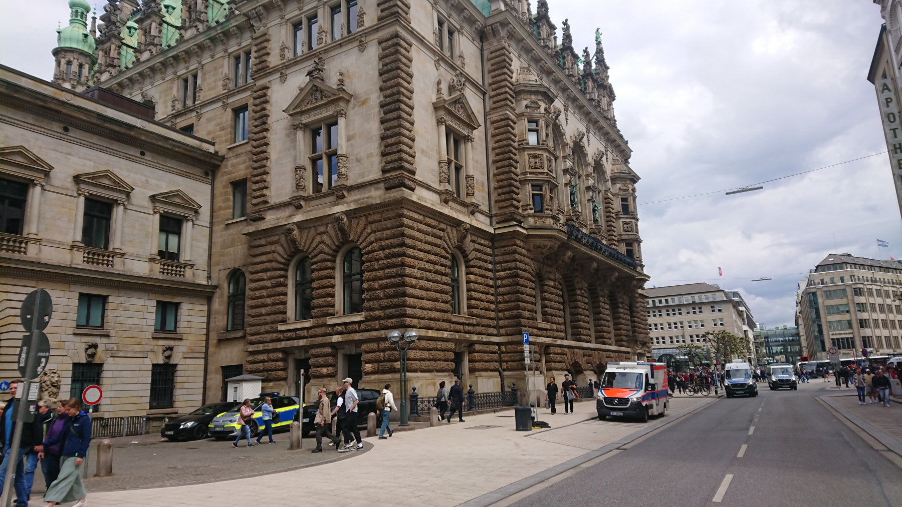 Und auch wenn das noch nicht genug Trubel ist all die Menschen an der Elphie, es soll noch besser kommen. Wir fahren in die Innenstadt. Überall Polizei und Straßensperrungen. Auf dem Rathausmarkt dann die Erklärung : Demo.