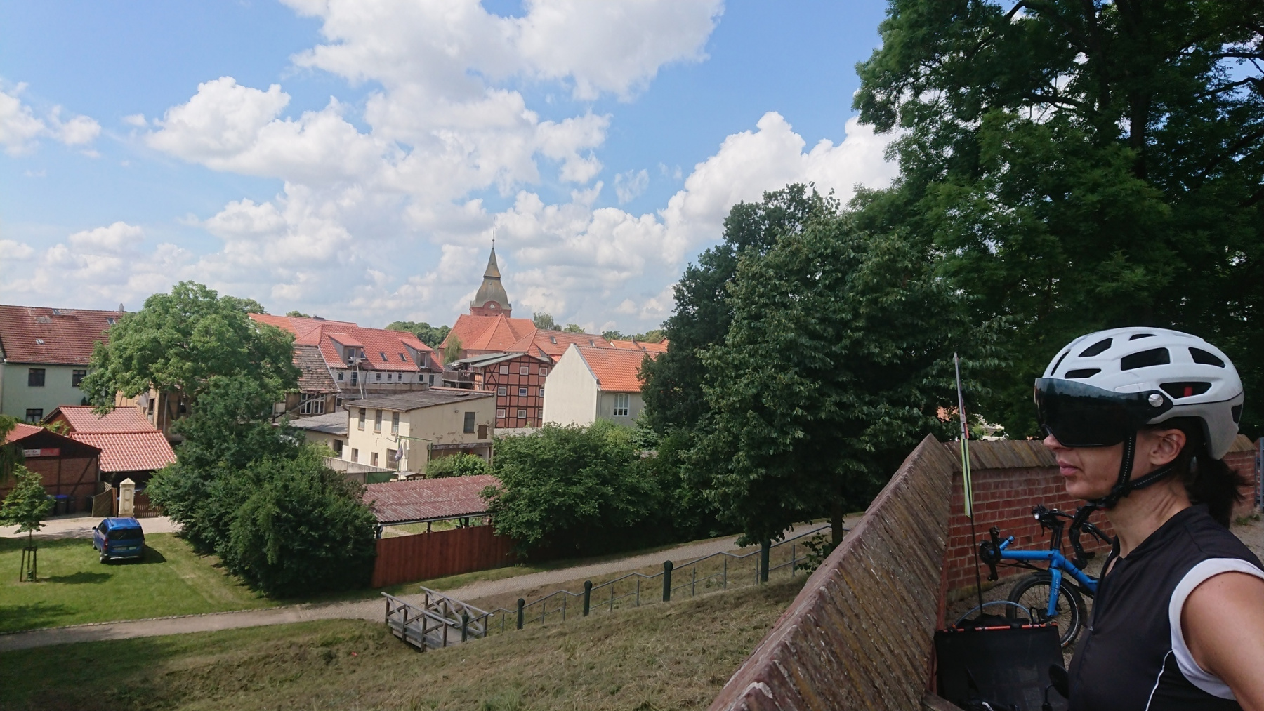 Noch einige km geht es auf diesem ehemaligen Truppenweg weiter, der Rennradfahrer, der uns entgegekommt, hat es sicher nicht leichter als wir, mit seinen schmalen Reifen und vermutlich hohem Druck. Noch einige km werden wir entsprechend durchgeschüttelt, dann kommen wir an die Bundesstraße mit Radweg und fahren nach Salzwedel. Eine alte Hansestadt, deren historische Altstadt trotz massiver Bobenangriffe im zweiten Weltkrieg erhalten geblieben ist.