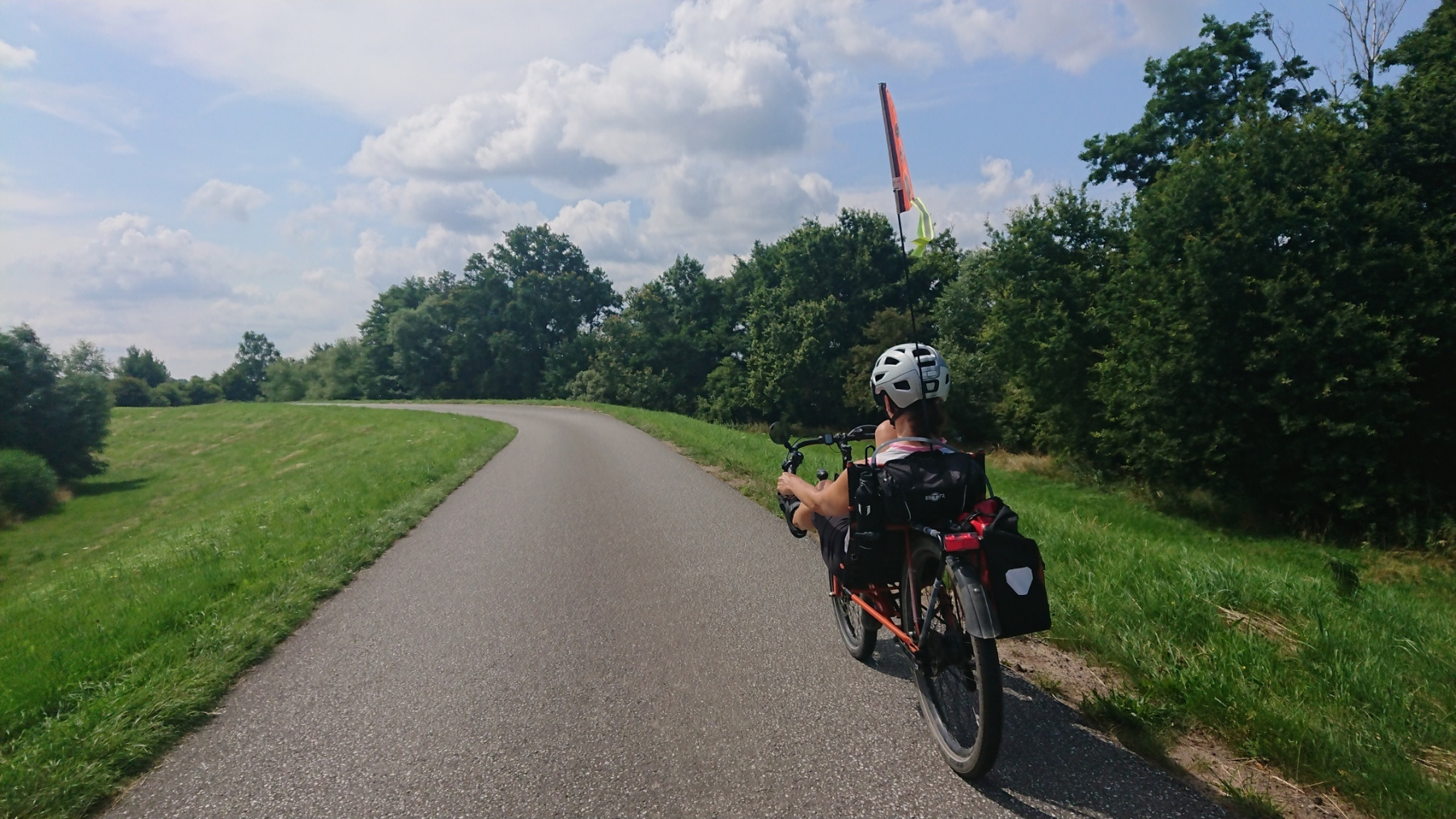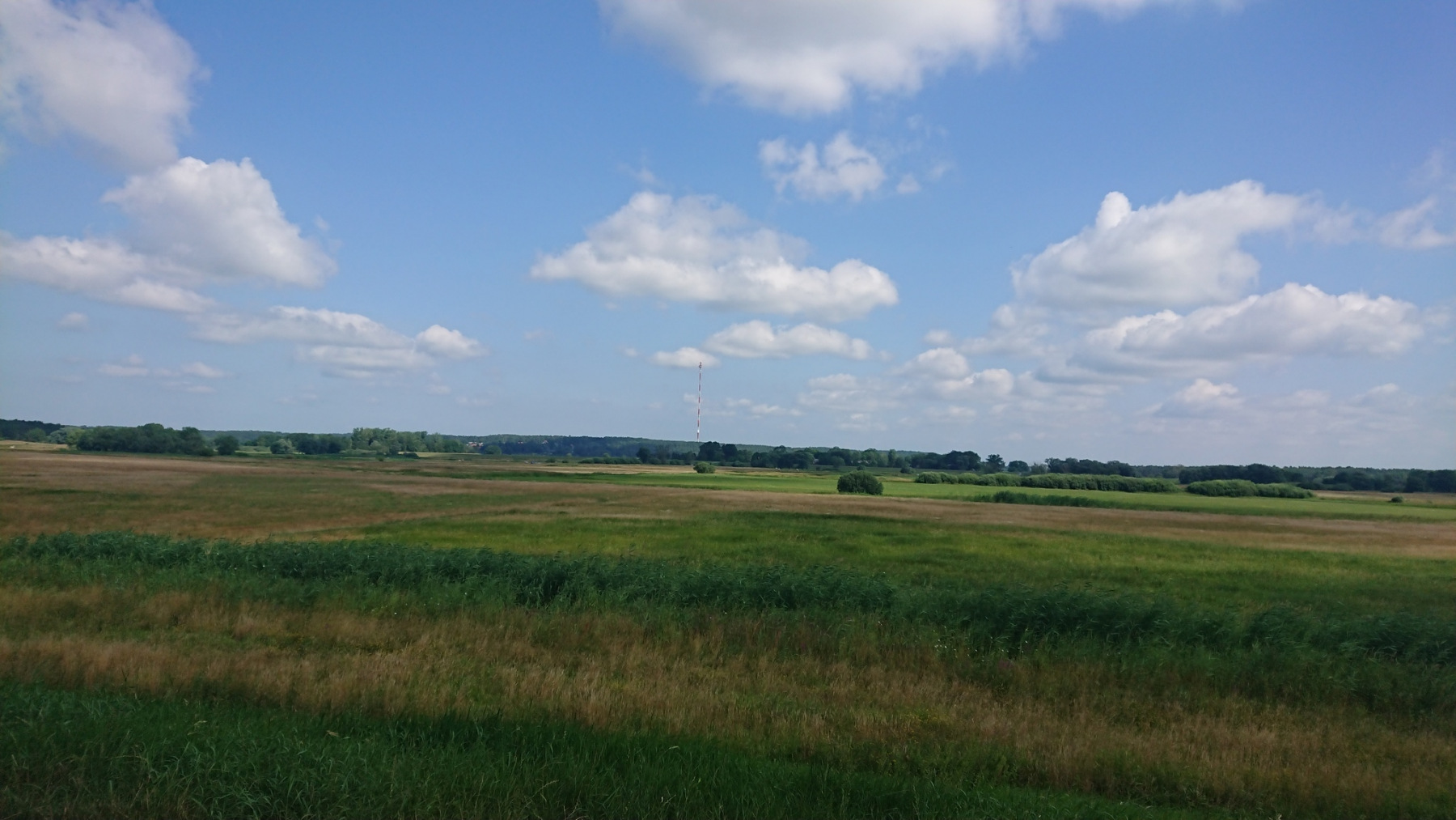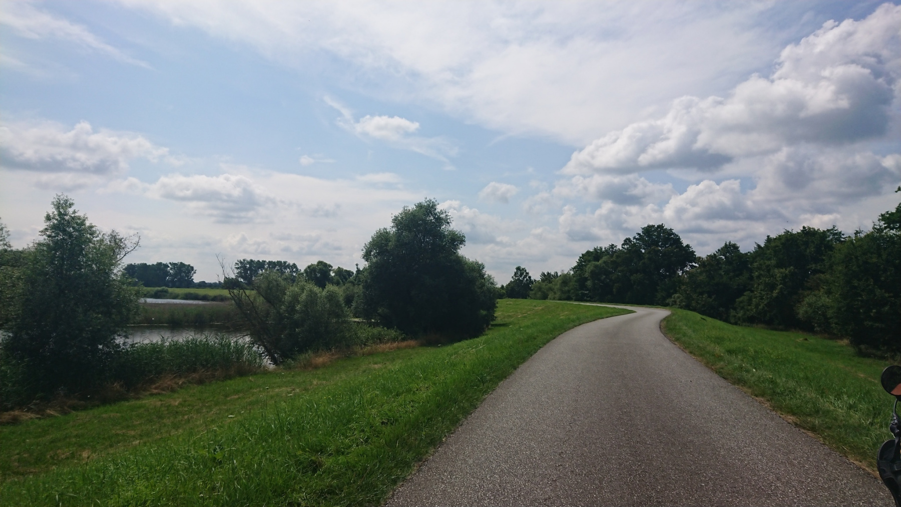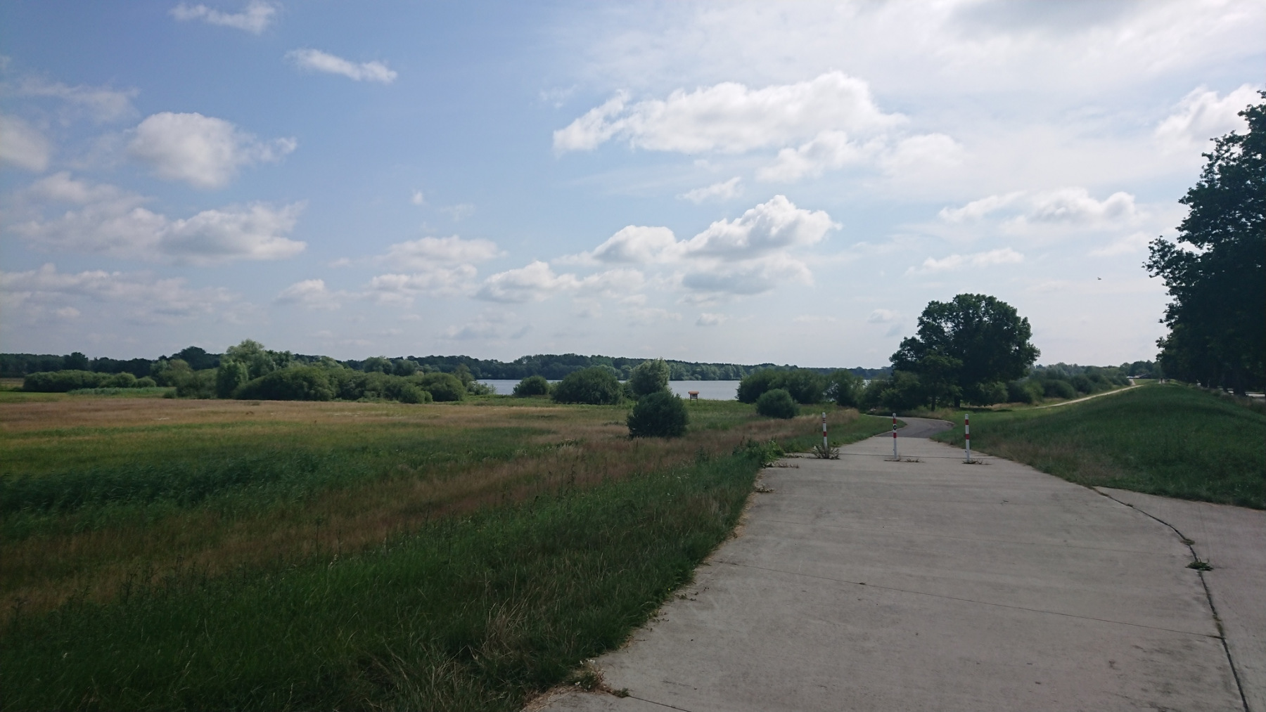 Lange Zeit fahren wir so auf dem Deich. Fast ausschließlich ist auf der Deichkrone ein Sandweg vorhanden. In der Ferne rechts vorab sehen wir wieder der Funkturm in Höhbeck.