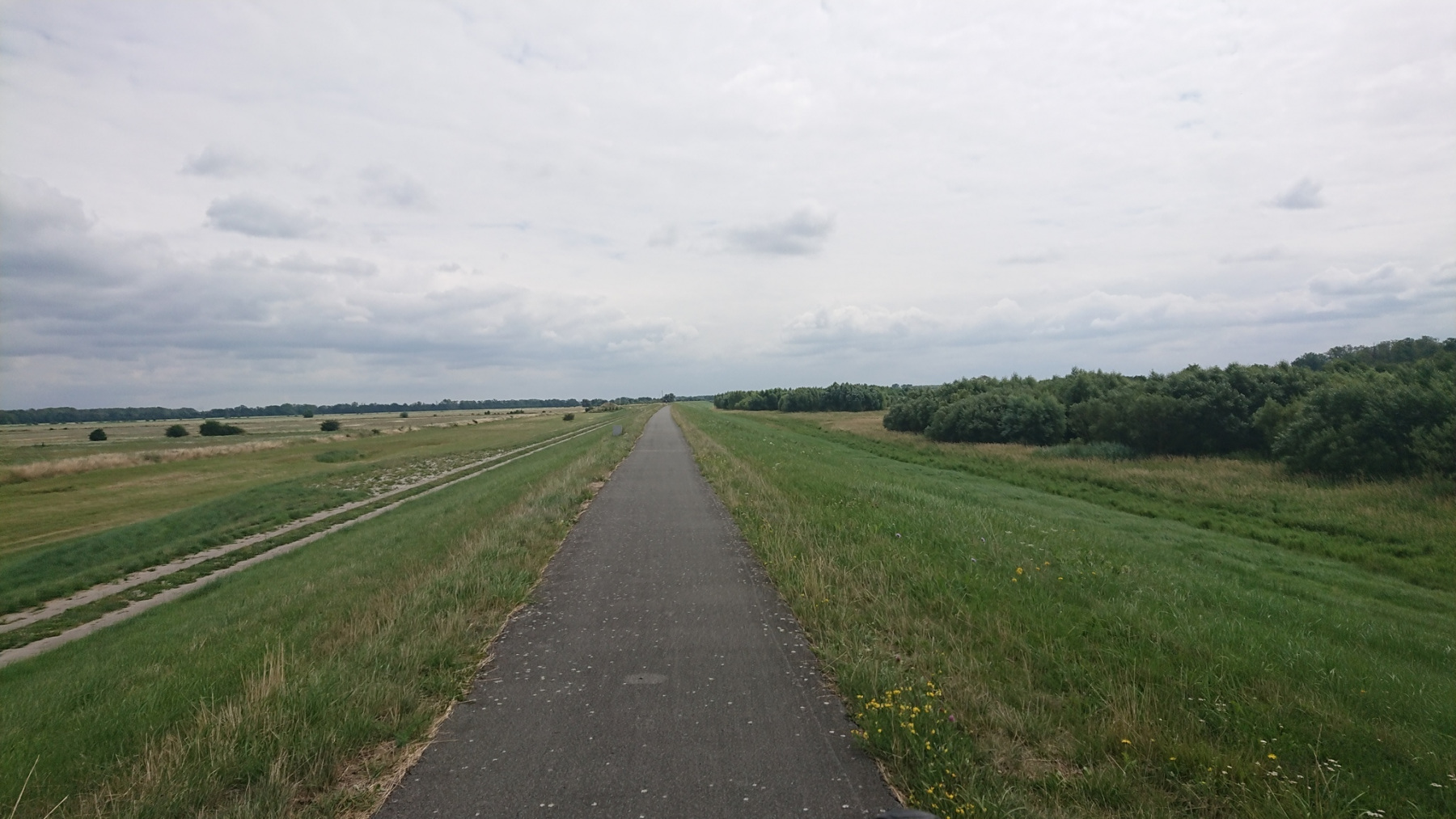 Lange Zeit fahren wir so auf dem Deich. Fast ausschließlich ist auf der Deichkrone ein Sandweg vorhanden. In der Ferne rechts vorab sehen wir wieder der Funkturm in Höhbeck.