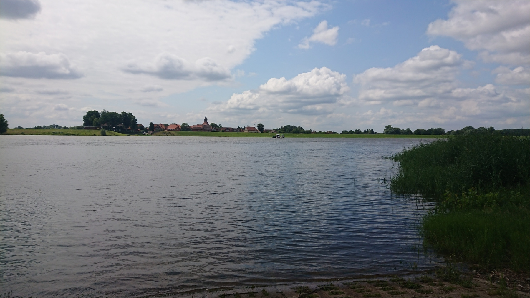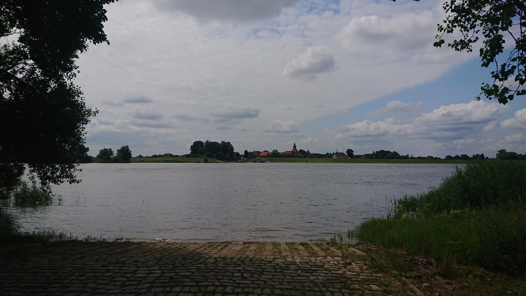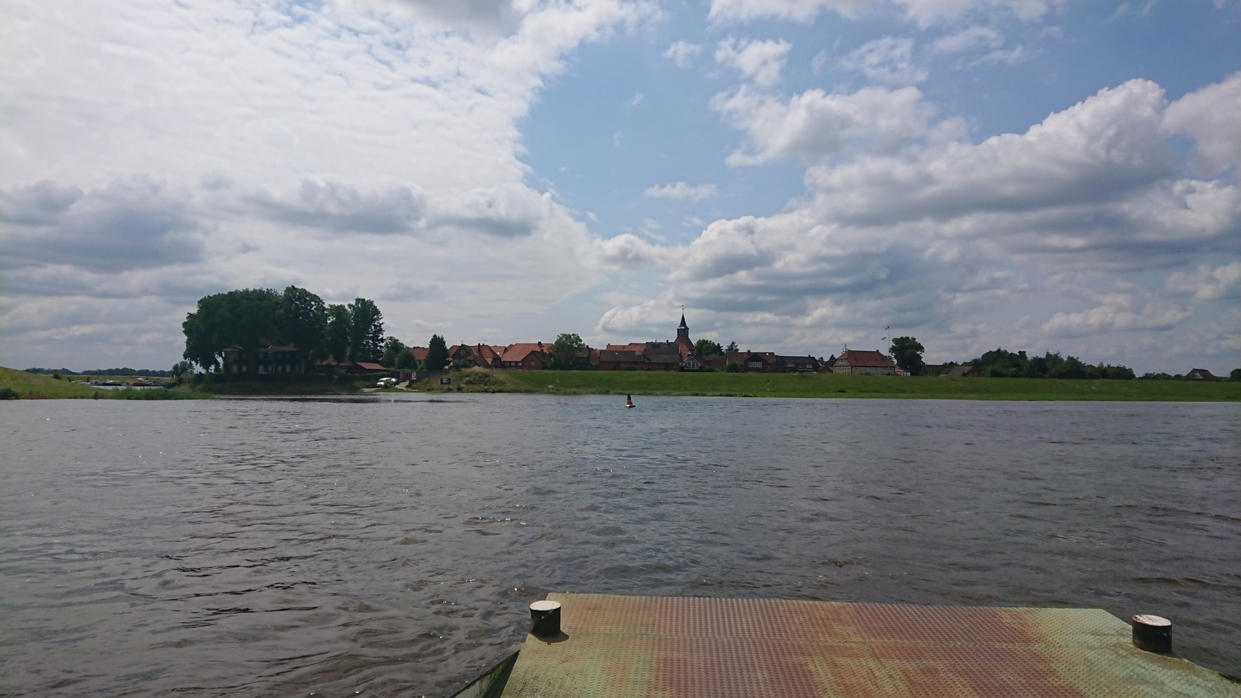 Auf uns macht Lenzen einen verlassenen eindruck. Kaum ein Mensch ist zu sehen, es sei denn sie sind umherirrende Radfahrer. Etliche Geschäfte sind aufgegeben. Wir machen uns auf zurück an die Elbe. Mit Rückenwind geht es nun weiter Richtung Osten und die km fliegen nur so dahin. Schnell ist die Fährstelle gegenüber von Schnakenburg erreicht. Die Fähre ist gerade auf dem Weg nach Schnakenburg, wir nutzen die Pause um ein wenig zu essen, kommen mit anderen Radfahrern in ein kurzes Gespräch. Die Wolken reißen auf und kurzzeitig kommen sogar ein paar Sonnenstrahlen herab.
