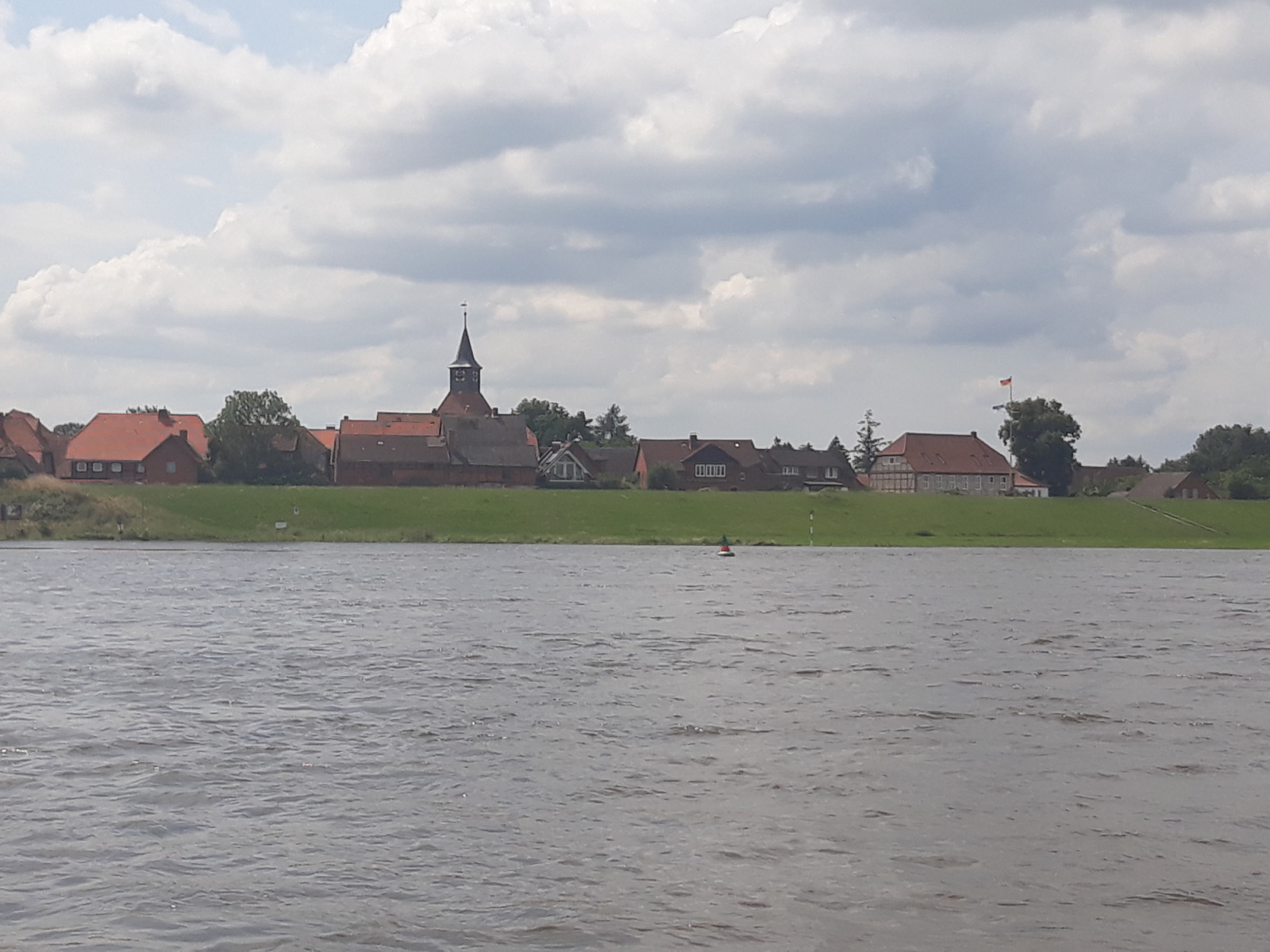 Unser eigentliche Pause machen wir am Deich in Schnakenburg und blicken zurück auf die Elbe.