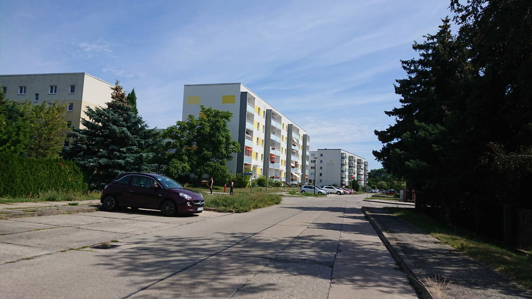 Als die Strecke in einen geschotterten Weg übergeht, entscheiden wir uns von der Strecke ab zu weichen und fahren auf der nahezu parallel verlaufenden Straße weiter nach Herzberg. In Herzberg sehen wir dann auch mal wieder die DDR-Plattenbauten – hier das sanierte Modell.