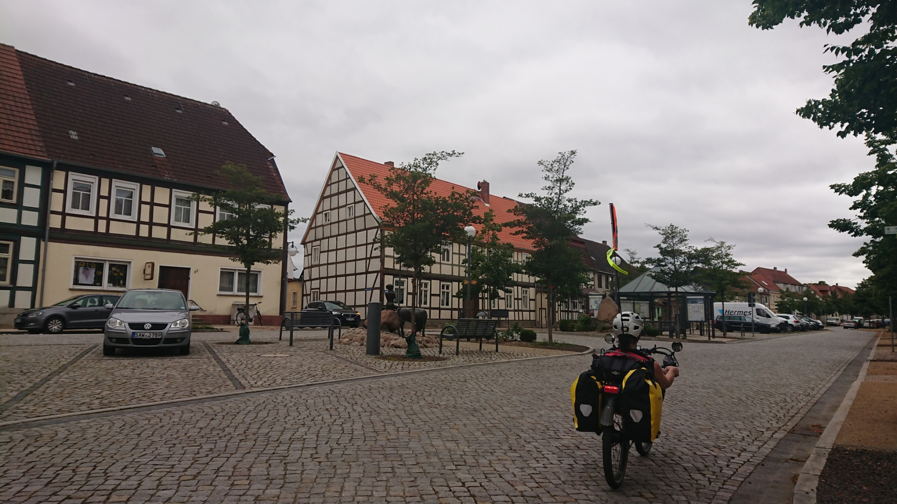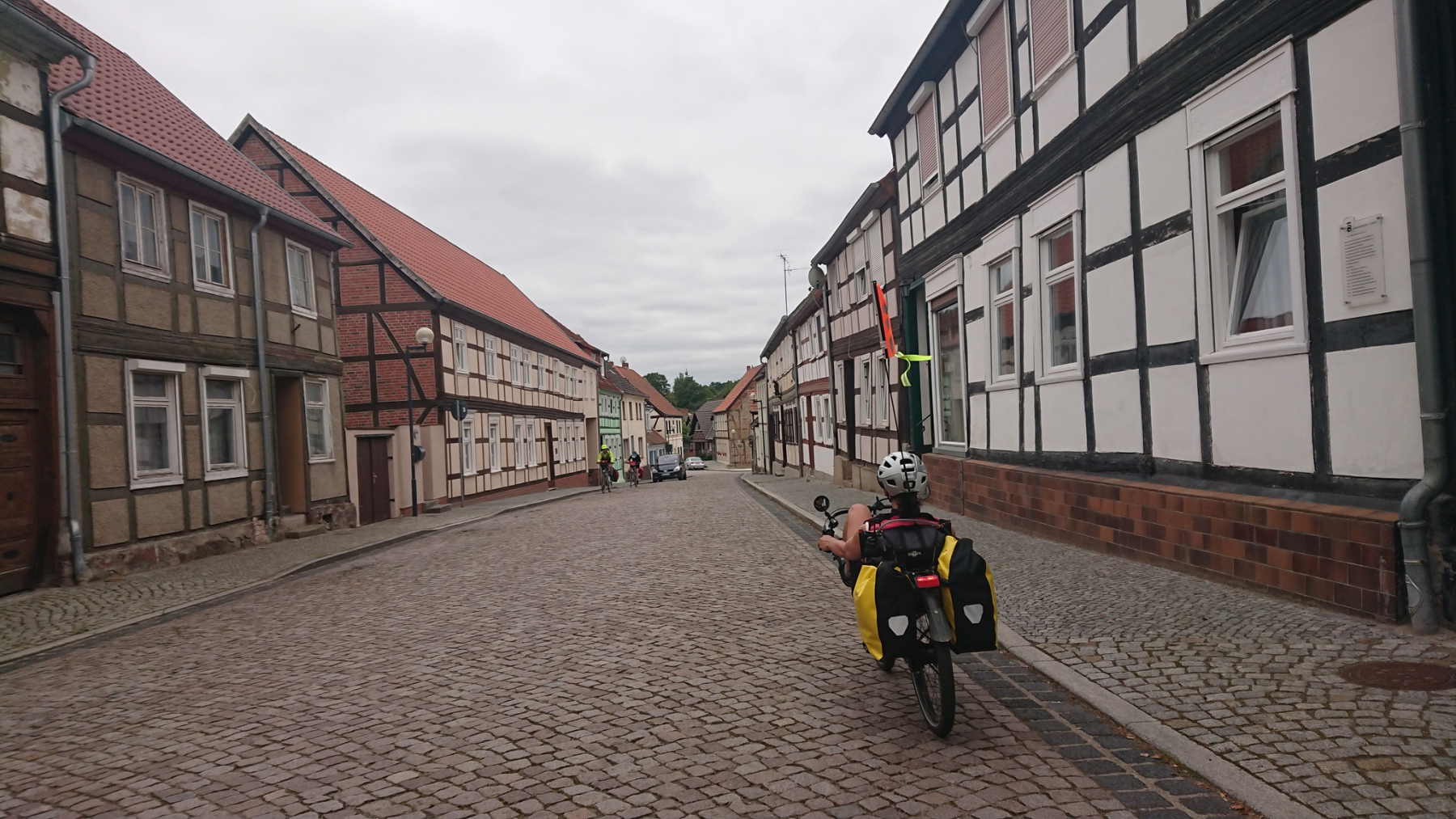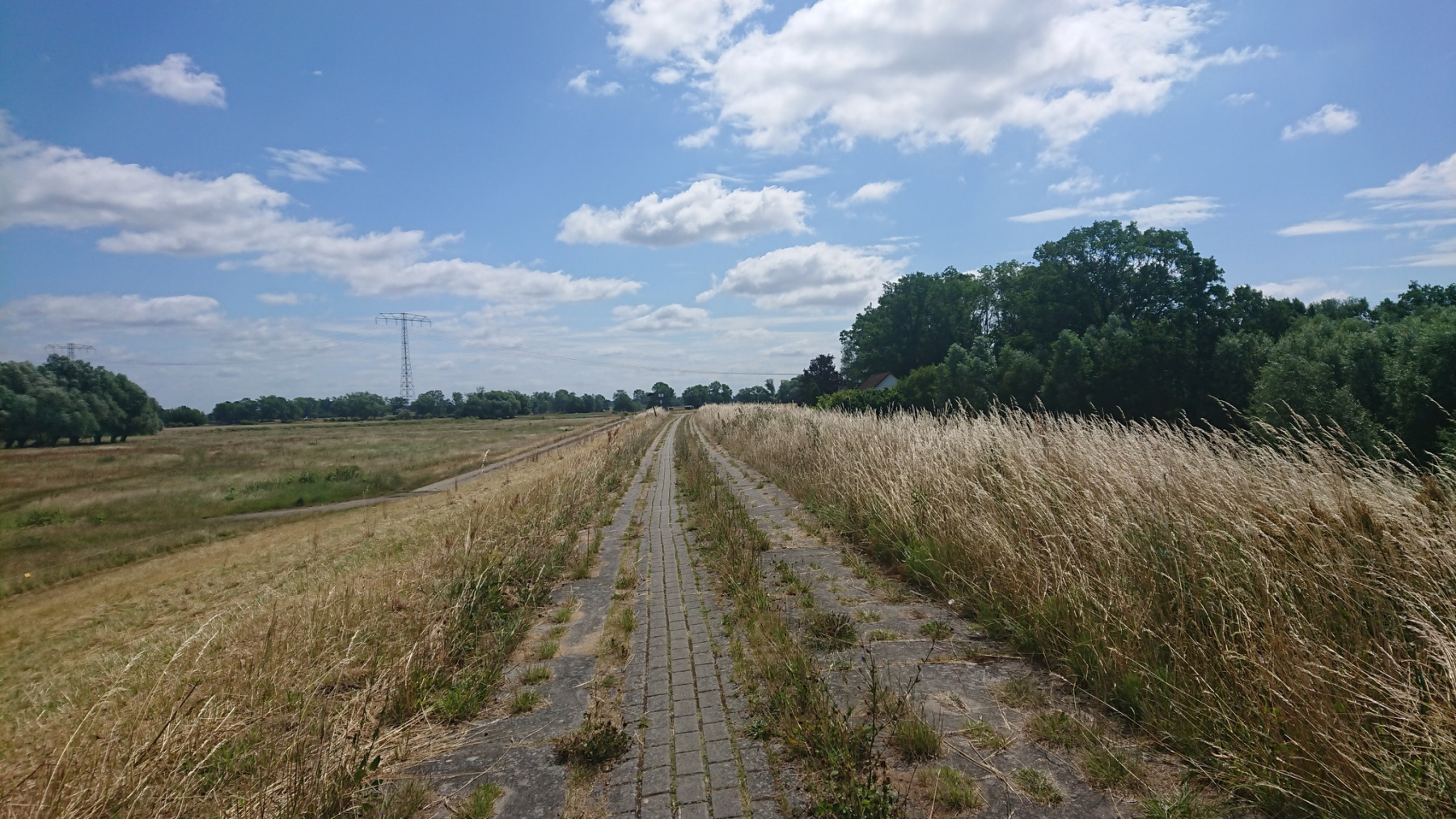 Die Radwege hier sind eine reinste Katastrophe: Kaputt, von tausenden Wurzeln aufgebrochen und nur extrem langsam zu befahren, sonst wirft es einem vom Rad. Auch die Straße ist wegen des starken Schwerverkehrs keine wirkliche Alternative. Wir sind froh, wieder aus diesem Gebiet herauszukommen. Wir durchfahren Arneburg und kommen auf einen gut ausgebauten Radweg, der uns fast bis nach Tangermünde bringen wird.