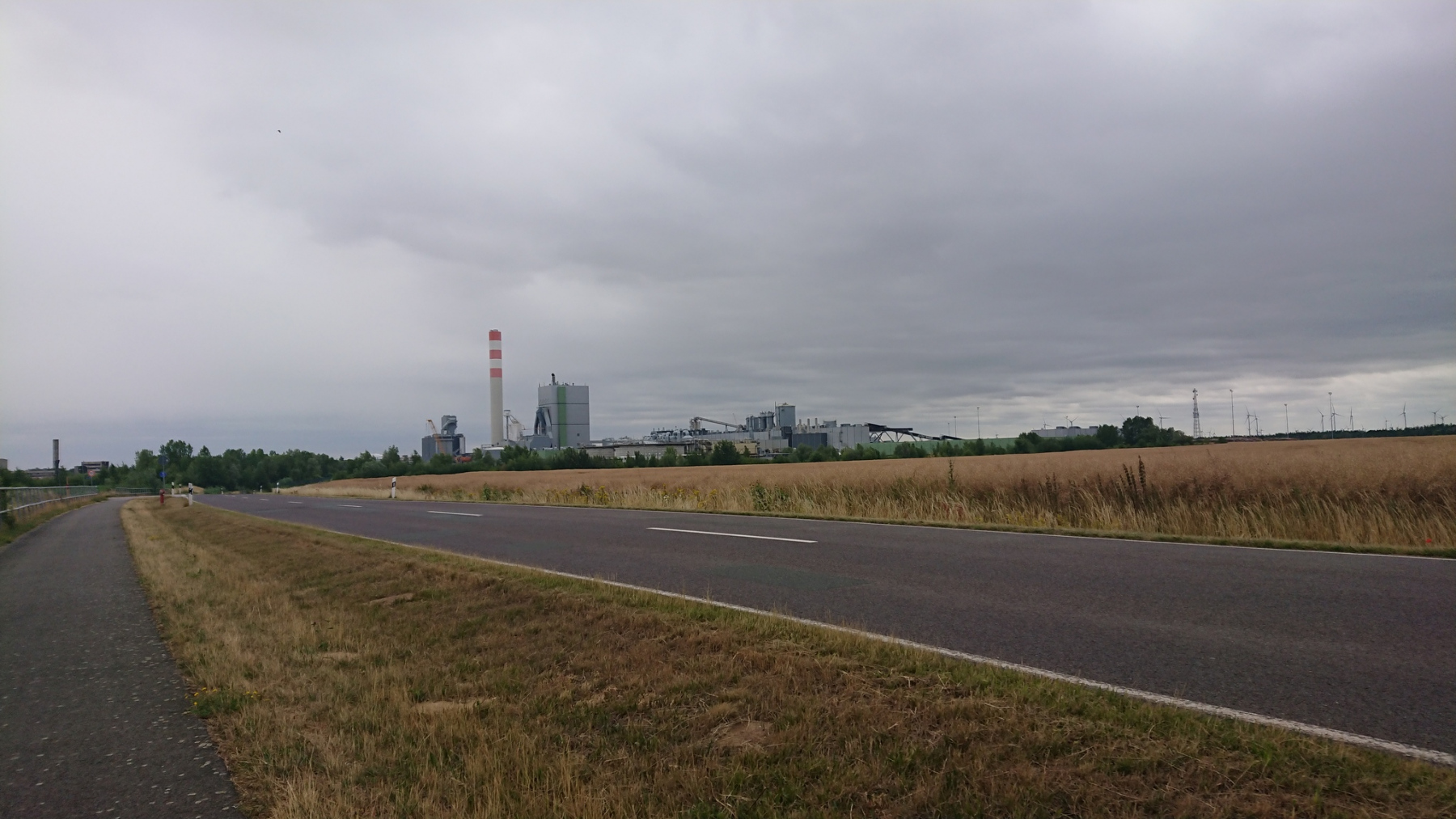 Nach unserem Stop in Werben fahren wir weiter Richtung Tangermünde, bei Altenzaun durchqueren wir den Industrie- und Gewerbepark Altmark. Wo früher einmal das AKW Stendal entstehen sollte, sind heute nur noch einige Ruinen erkennbar und die Flächen werden überwiegend von der nahen Zellulosefabrik als Lagerplatz für Holz und Späne genutzt.