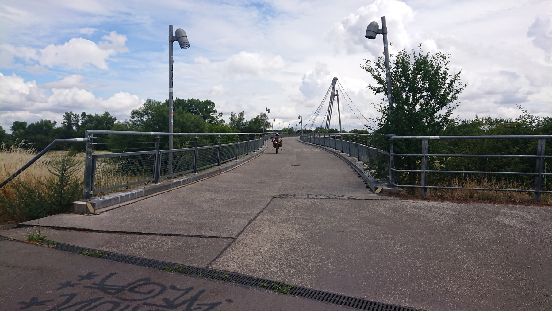Und dann erwartete uns ein langer schmaler Streifen mit Kunststoffplanken neben der eigentlichen Brücke. Beim Rüberfahren bogen sich die Planken und schnellten mit lautem Klappern danach wieder hoch.