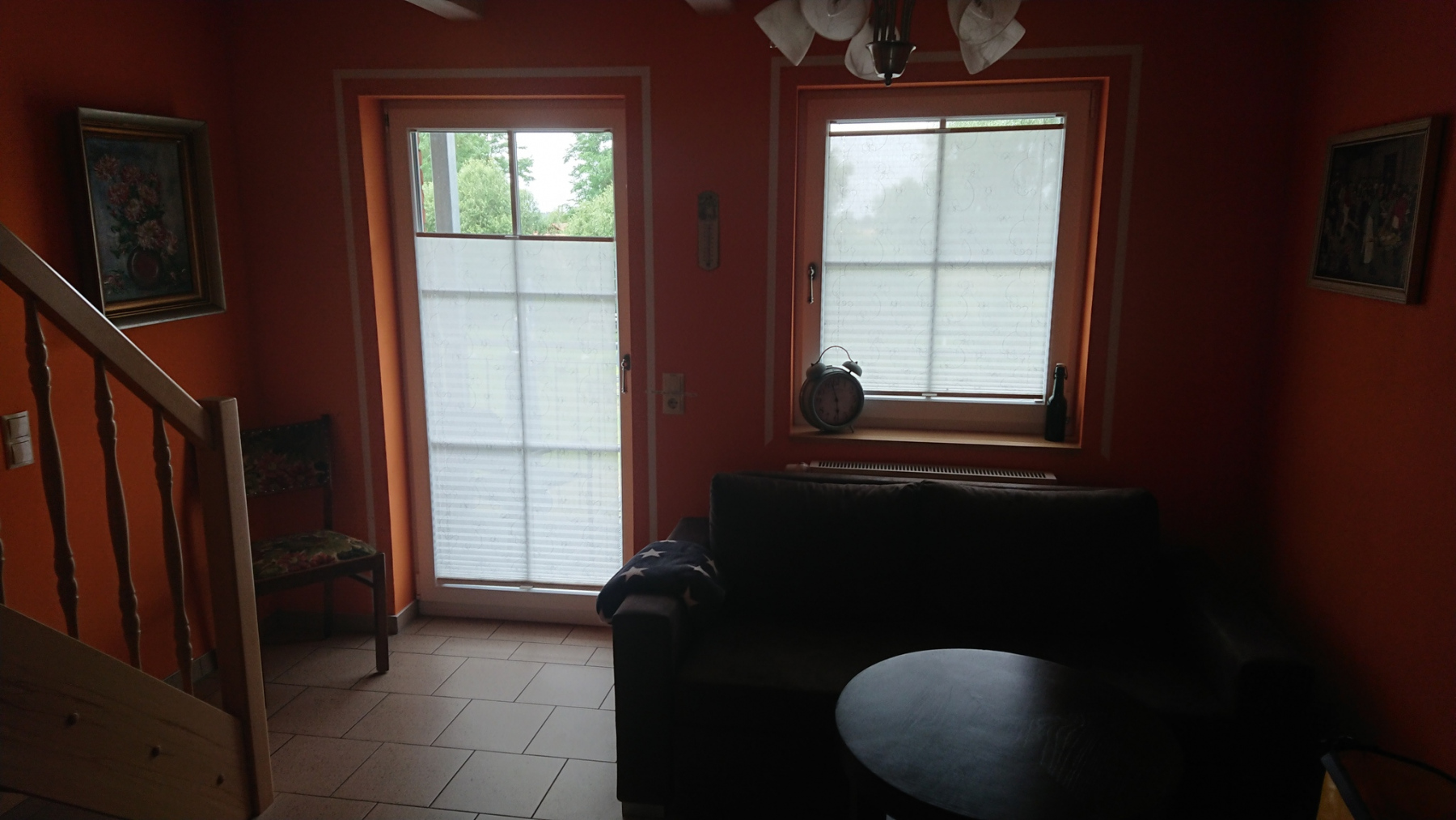 Doch nun zurück zu unserer Übernachtung. Die Webseite sagt nicht viel aus und wir waren gespannt, auf das, was uns dort erwarten würde. Wir wurden auf’s Angenehmste überrascht. Das Zimmer entpuppte sich als kleines Apartment über 2 Etagen. Oben ein geräumiges tolles Schlafzimmer, untern ein kleines Bad und ein netter Wohnraum. Und im Innenhof ein netter Biergarten. Im Außenbereich dann nocht ein großzügiger Garten und darin ein Hasengehege, eine Vogelvoliere mit Sittichen und Canarien etc, dazu ein Spielplatz und Hühner.
