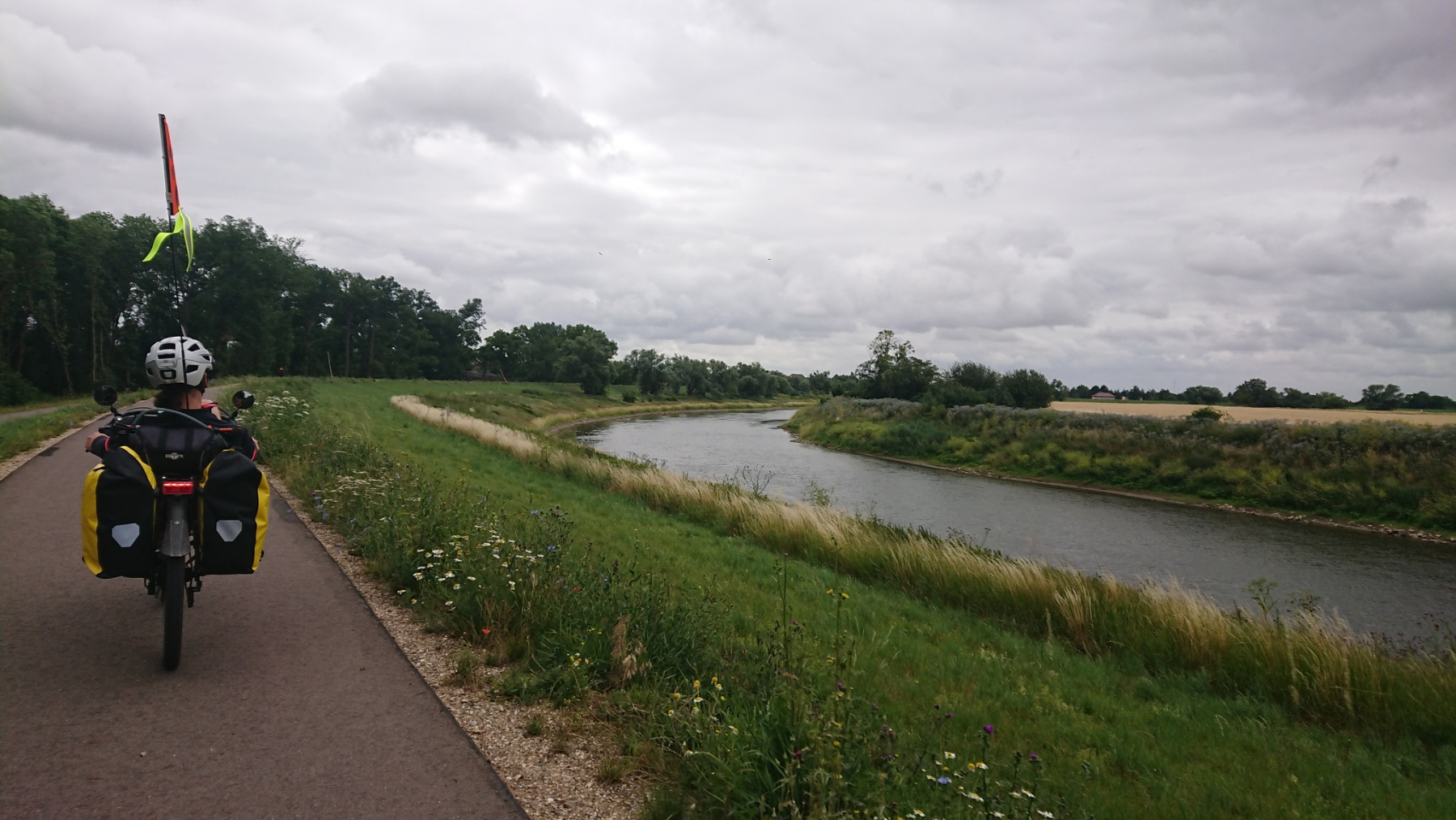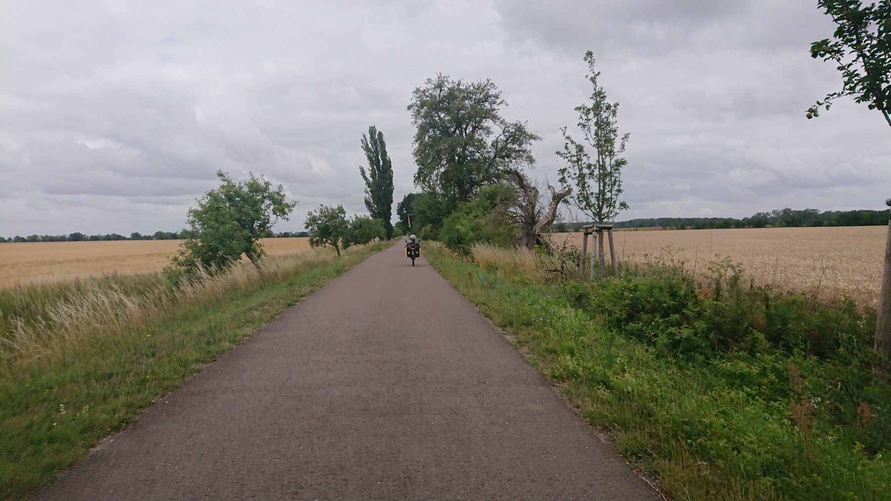 Wir haben die Fähre Breitenhagen gewählt, damit wir nicht auch noch die kleine Fähre an der Saale in Groß Roseburg nutzen müssen. Der Radweg hier entlang der Saale ist neu und gut. Nur der Gegenwind macht uns zu schaffen und drückt das Tempo, Abscnittsweise ist der Radweg auch noch nicht erneuert und zeigt uns, wie zu DDR-Zeiten Betonplattenwege überall ausgesehen haben müssen.