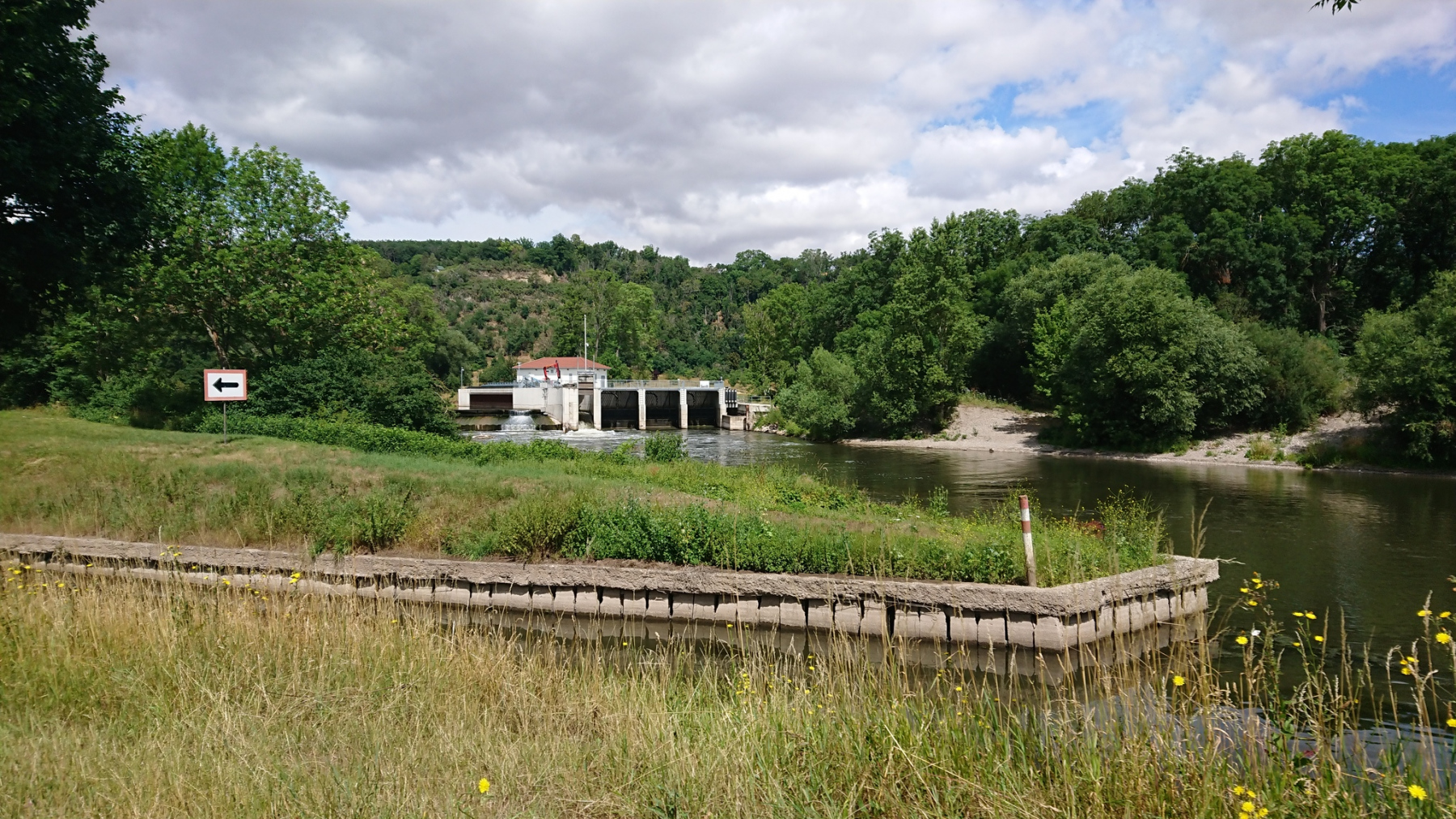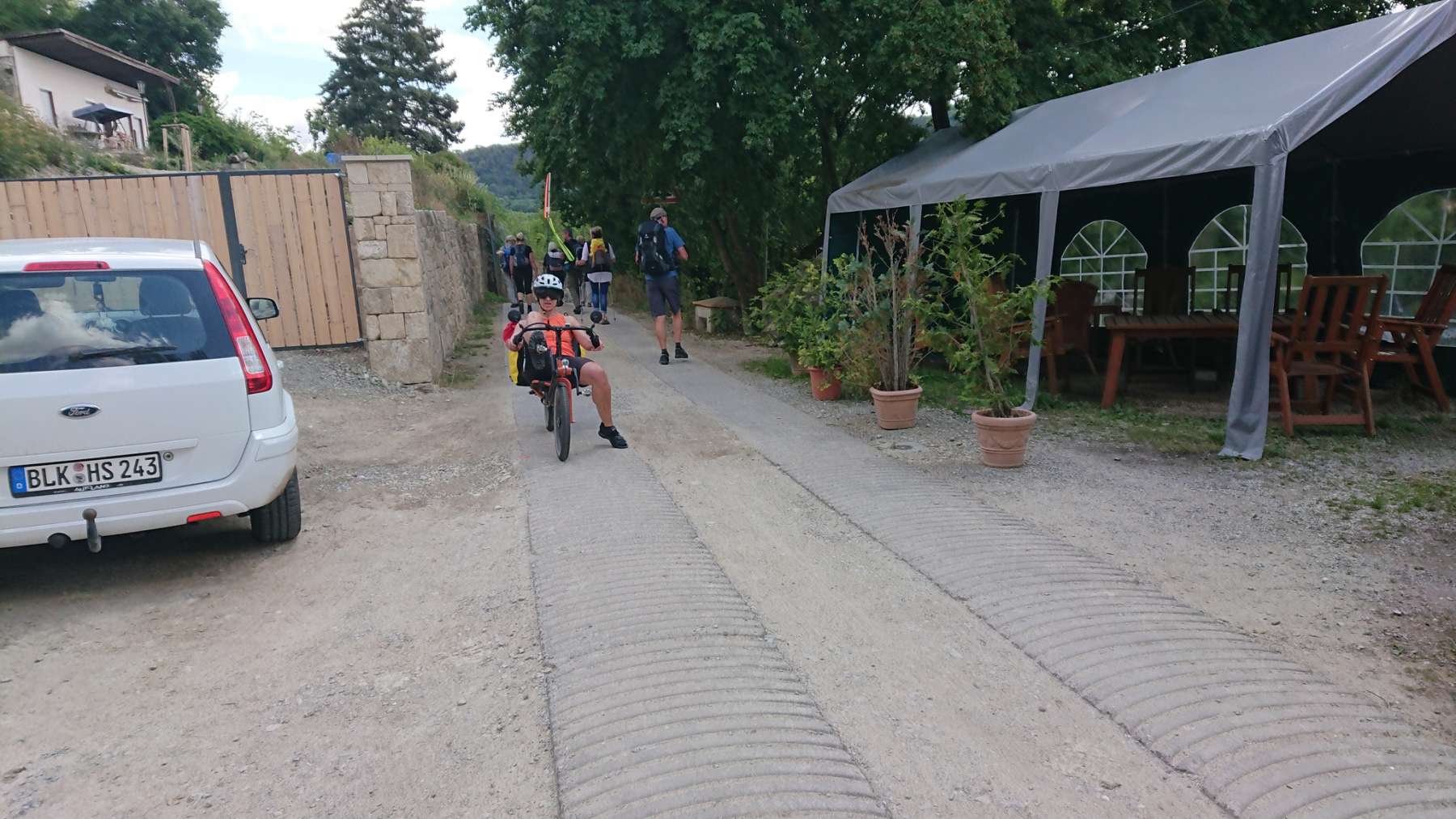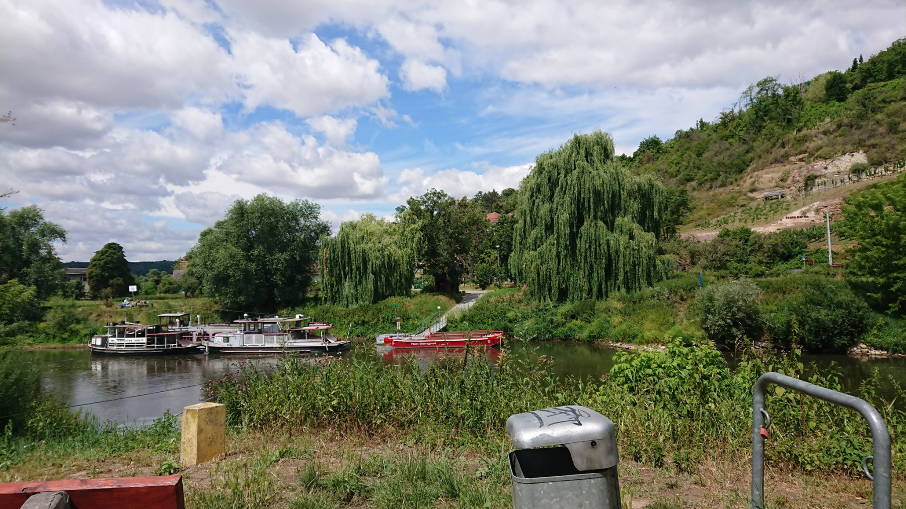 Wir müssen einige merkwürdige Umwege fahren bzw. stellenweise auch schieben, um die Baustelle zu umgehen. Bis nach Naumburg führt der Weg danach dann wieder gut ausgebaut entlang der Saale. Vor uns tauchen die ersten Weinberge der Saale-Unstrut-Region auf. Hinter Naumburg führt der Saaleradweg dann steil innerhalb eines Weinberges bergan, um danach gleich wieder hinunter auf Saaleniveau zurückzugehen.