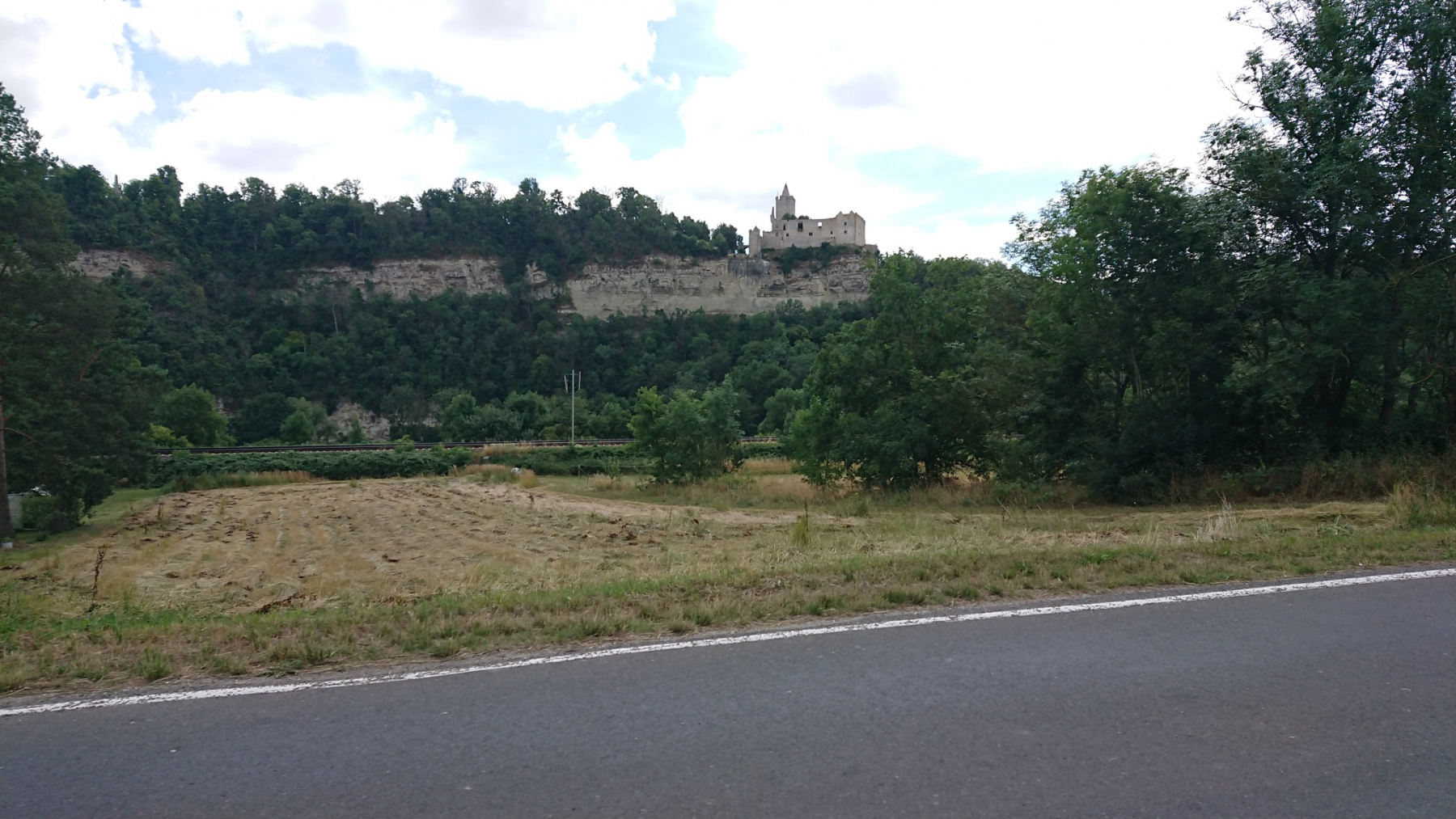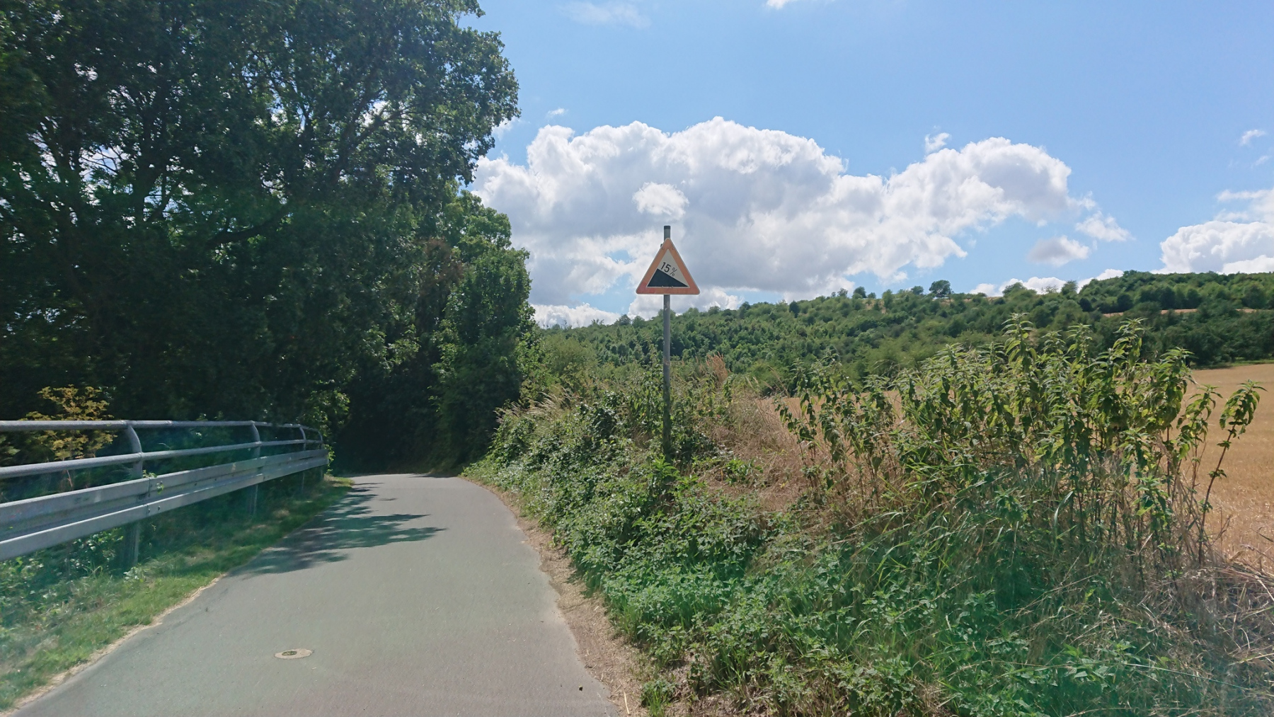 Wir hatten bis dahin schon 112 km absolviert. Nun ging es noch mal bergan. Es galt rund 80 hm auf einer Strecke von etwa 6 km hinaufzufahren. Das ist nicht besonders steil, aber wir merkten es dennoch in den Beinen. Das Navi mißt eine Steigung von etwa 4-5%.