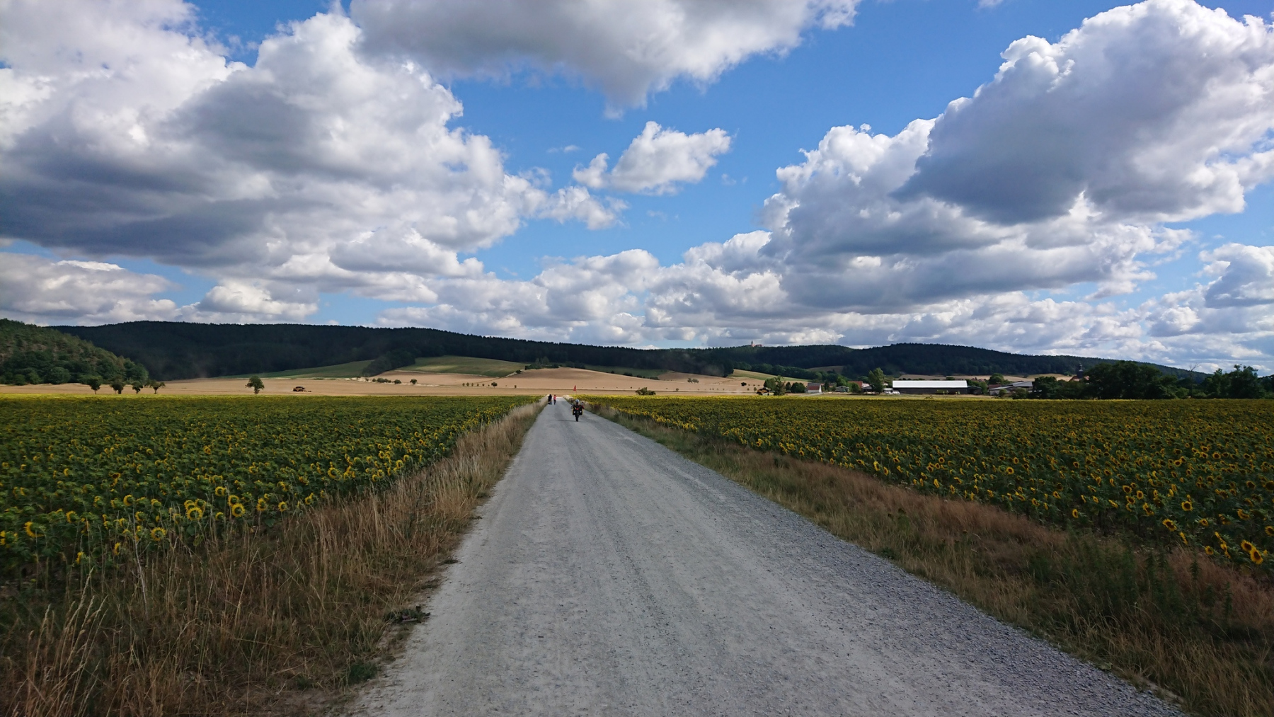 Zunächst geht es leicht bergab, aber wir müssen eine Landstraße queren und können den Schwung nicht mitnehmen, um die nächste Steigung hinaufzukommen. Im kleinsten Gang fahren wir die geschotterte Straße mühsam nach oben. Das Navi erfaßt eine Steigung von etwa 8%. Oben angekommen geht die Schotterpiste noch einige Zeit weiter.