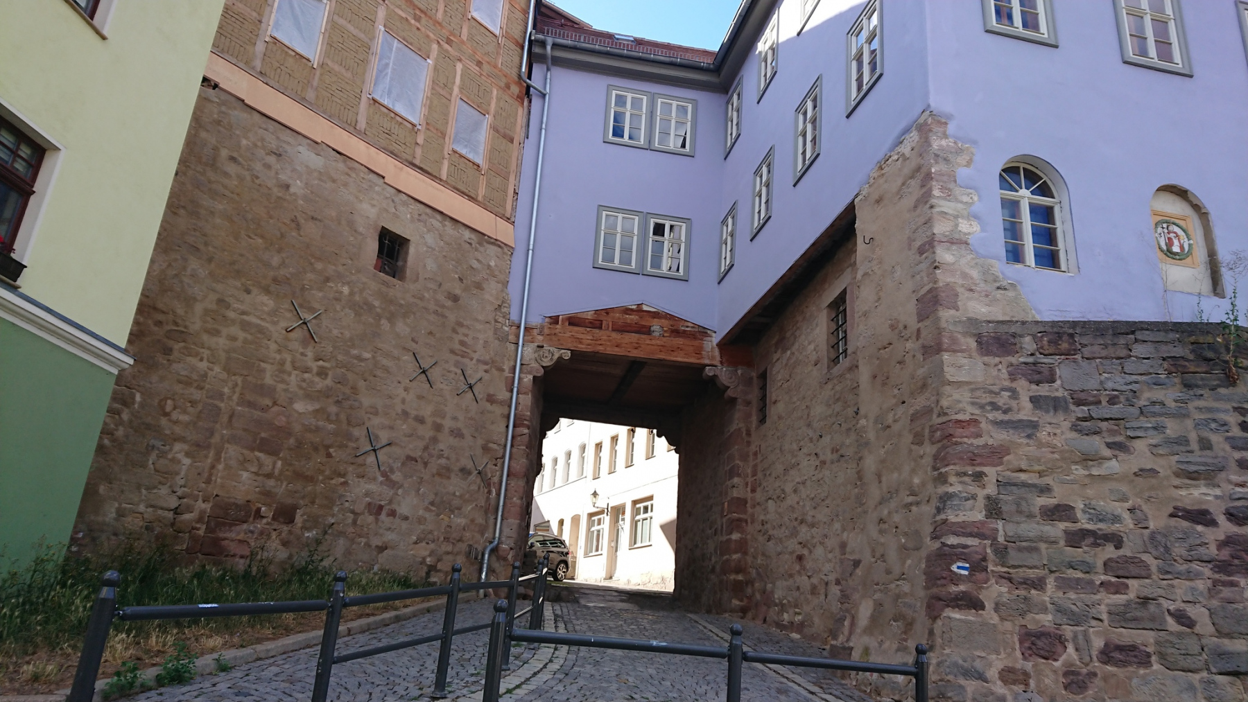 In Camburg wollen wir heute gerne zu Mittag essen. Zunächst versuchen wir es in der Altstadt. Angesprochene Passanten sagten uns, dass es in Camburg kein Lokal oder Bistro mehr gäbe. Lediglich ein Rewe sei noch im Ort. Vielleicht können wir ja dort was zu essen finden. Eine Passantin meinte, beim Fleischer in der Nähe von Rewe gäbe es eine Mittagstisch. Wir machen uns also auf über den Saalesteg Richtung Rewe.