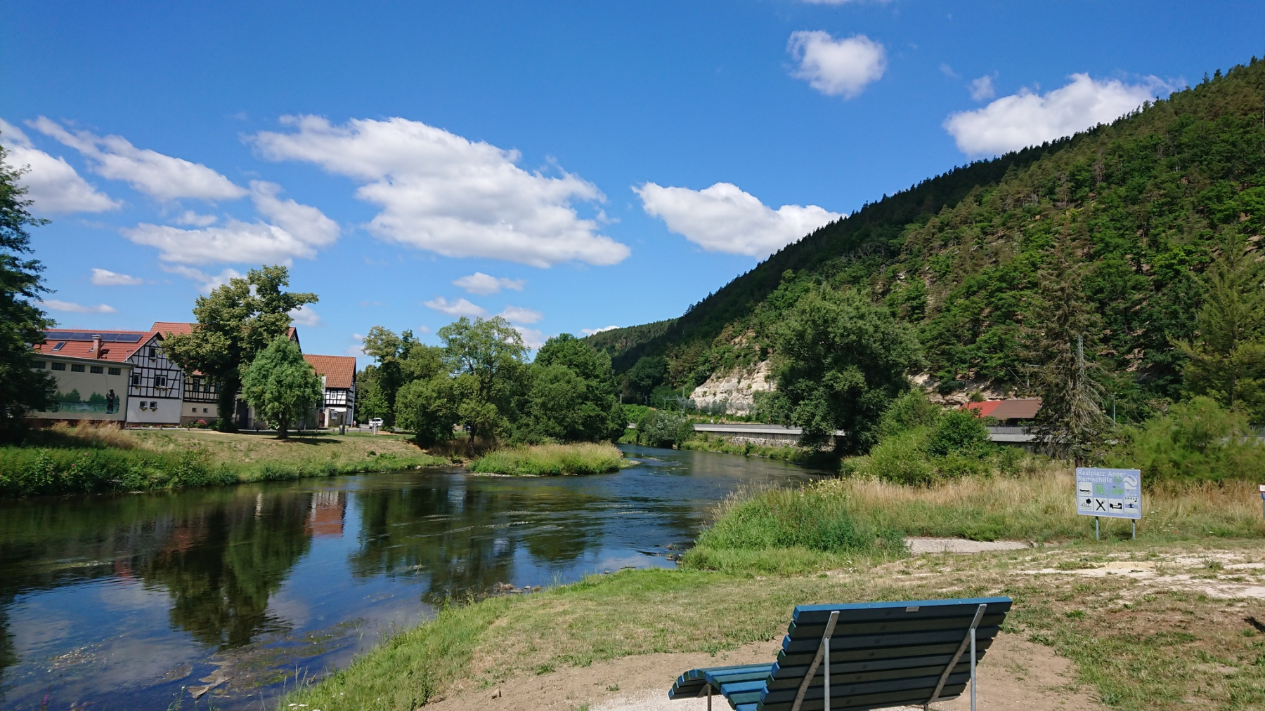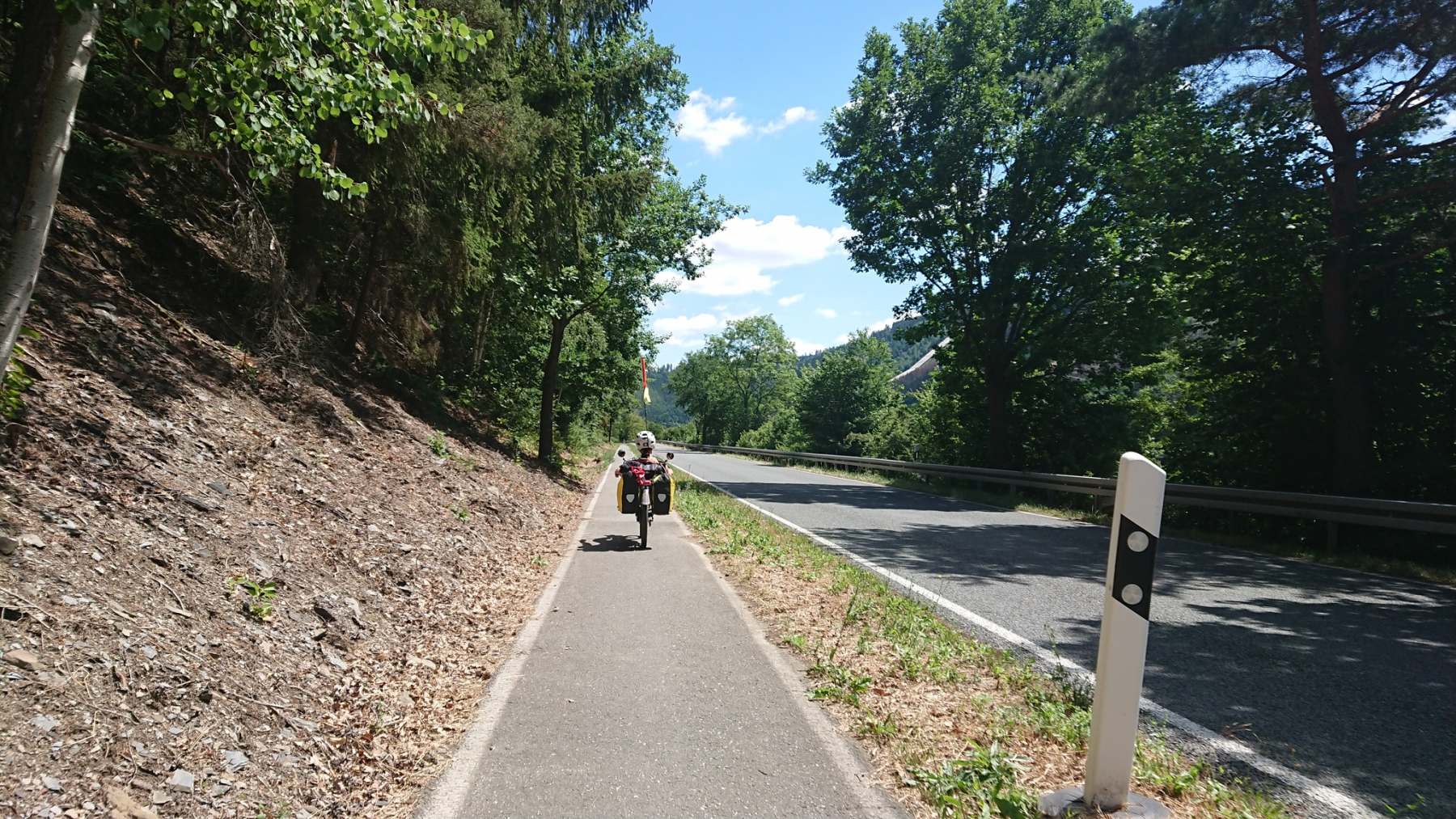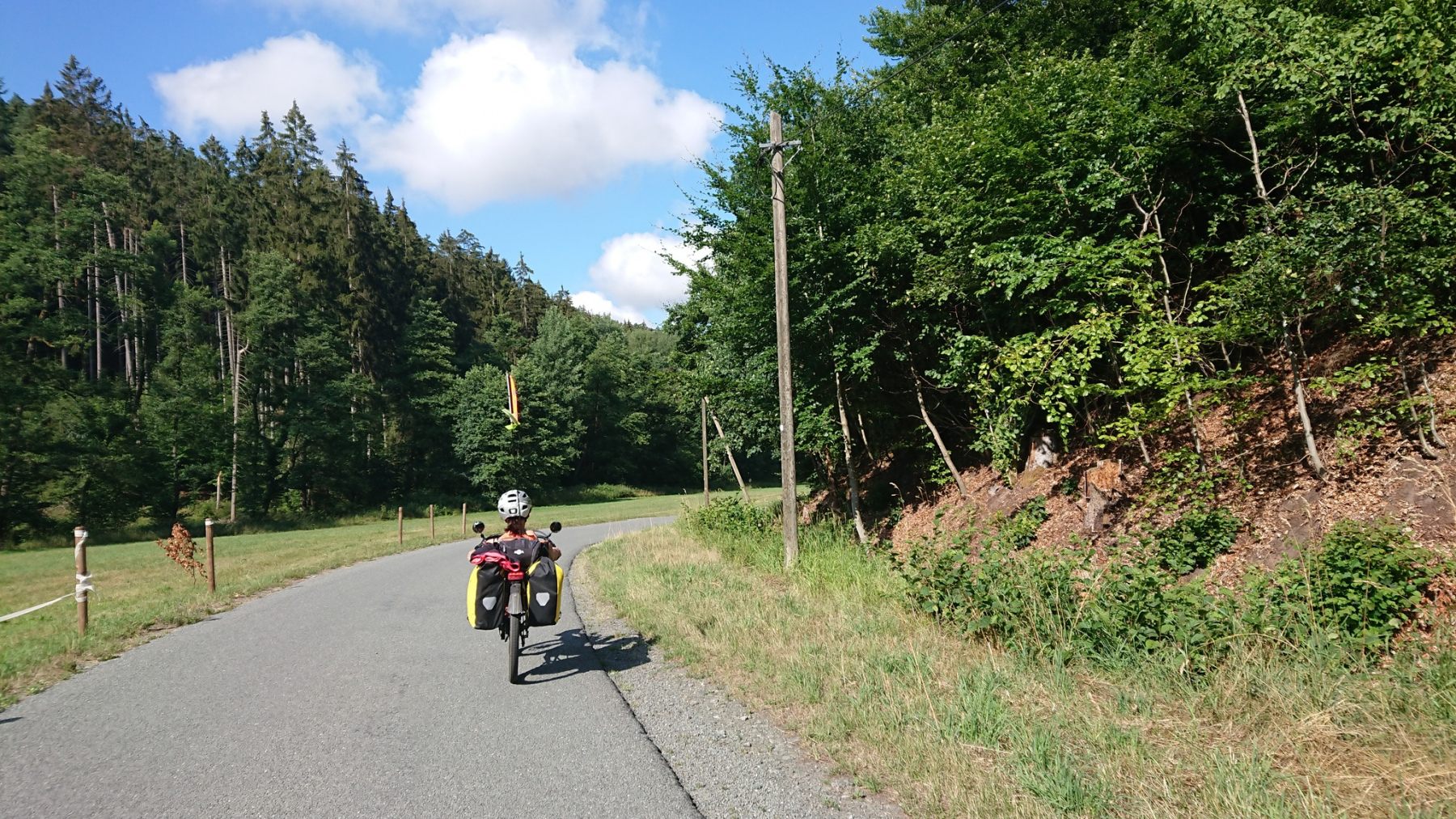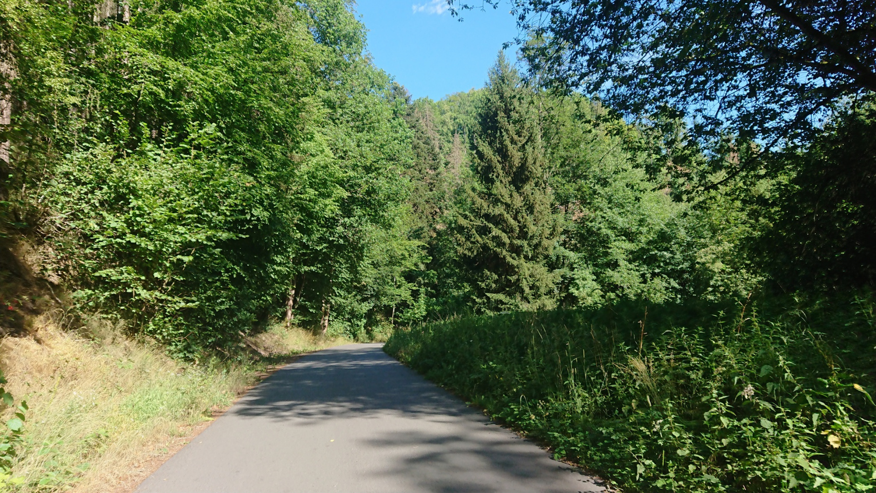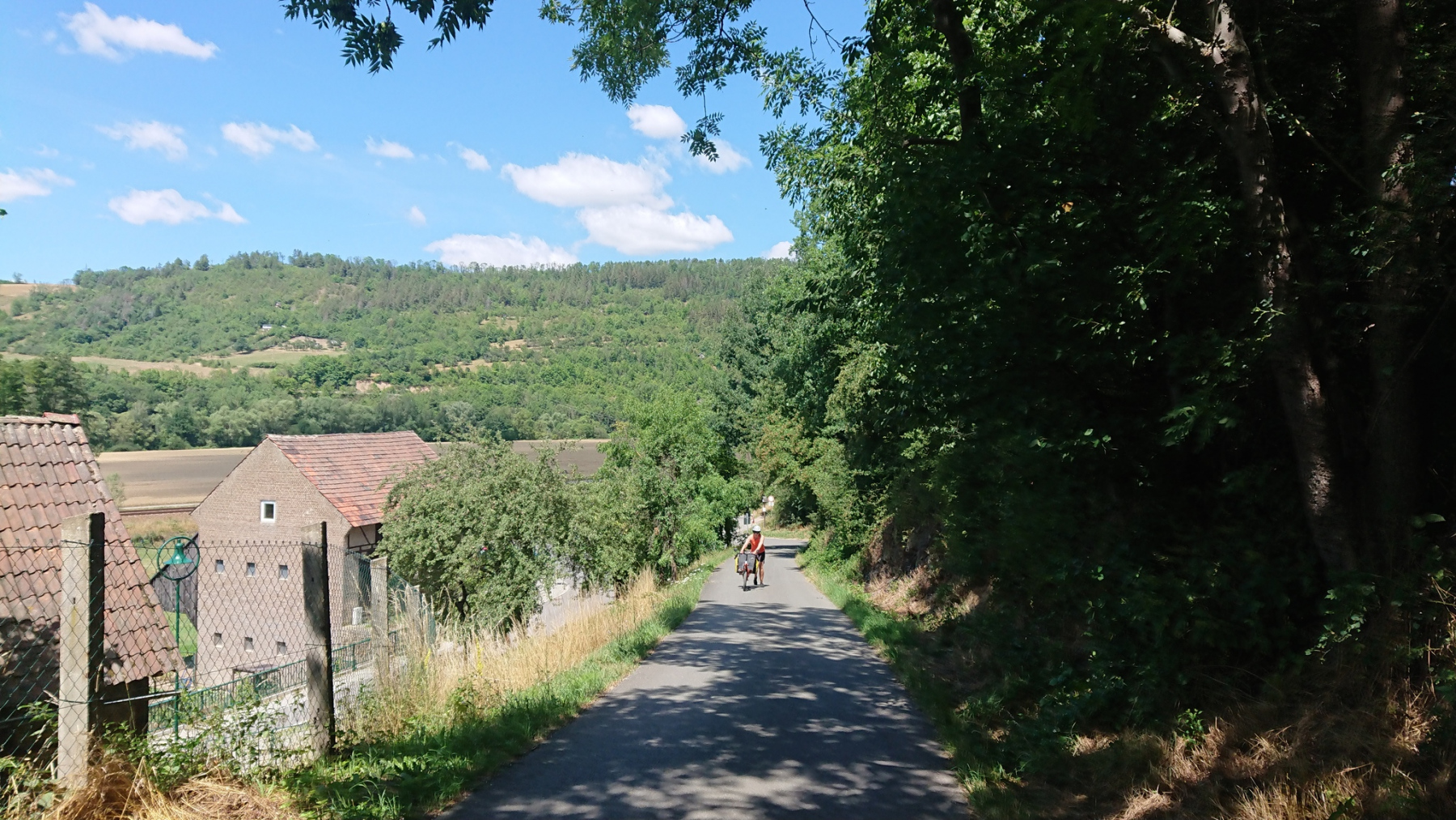 Nach einem guten Früstück machen wir uns wieder auf den Saaleradweg. Um den wieder unter die Räder nehmen zu können, müssen wir wieder durch das Tal zurück an die Saale. Diesmal können wir aber einfach dahinrollen. Die ersten knapp 4km geht es bergab zurück an die Saale. Wie viele Höhenmeter wir heute machen werden, ist uns zu dem Zeitpunkt noch nicht klar. Aber der Tag wird einer der schönsten aber auch einer der anstrengensten der Tour werden.