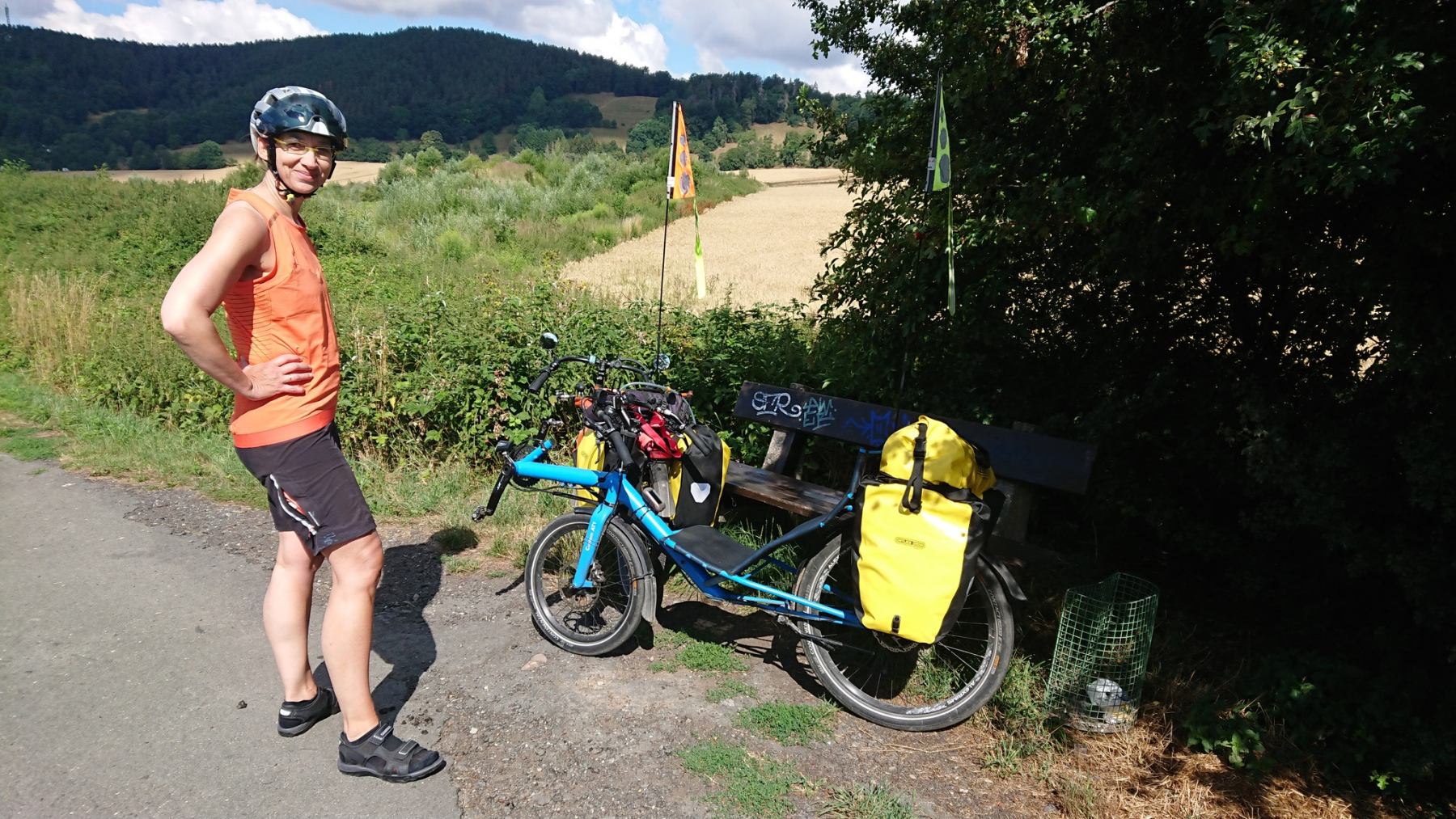 Zunächst gilt es eine Steigung von etwa 100 Höhenmeter mit bis zu 15% zu überwinden. Für uns mit Gepäck auf den Liegerädern einfach nicht möglich. Uns bleibt nur zu schieben.