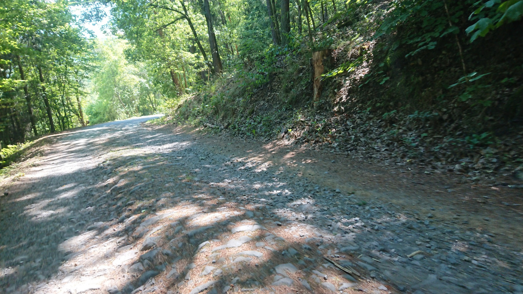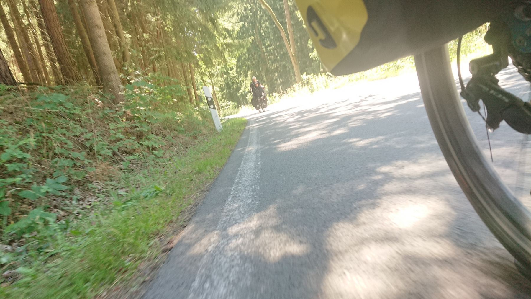 Danach geht es eine lange Abfahrt hinunter durch den Wald. Maximal 7% Gefälle messen wir. Genug, um rollender Weise mühelos auf mehr als 50 km/h zu kommen. Da wir die unübersichtliche Strecke nicht kennen, lassen wir es langsamer angehen und bremsen immer wieder kräftig ab. Und lassen die Geschwindigkeit nur selten über 42km/h ansteigen.