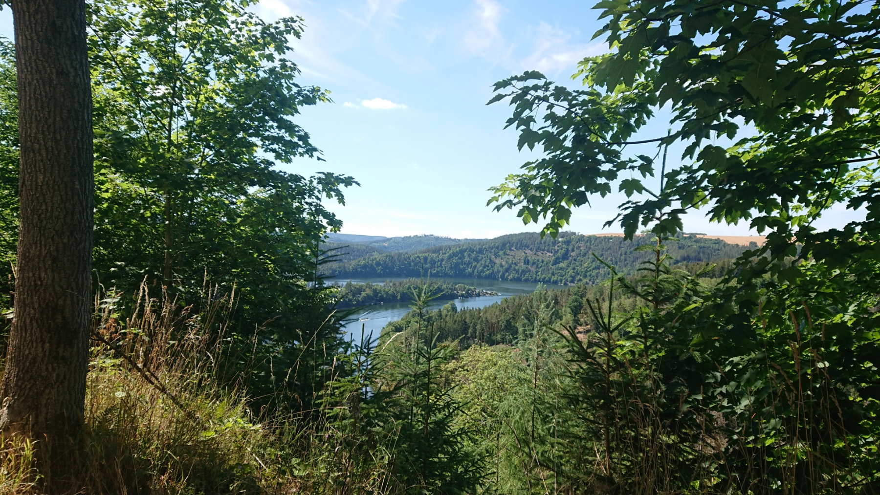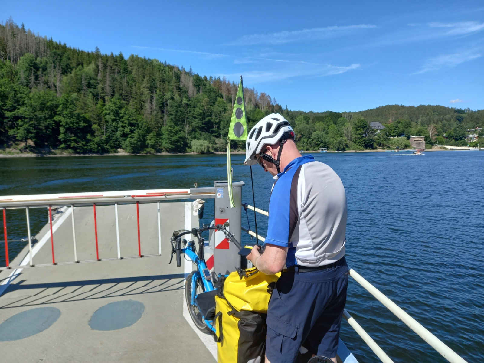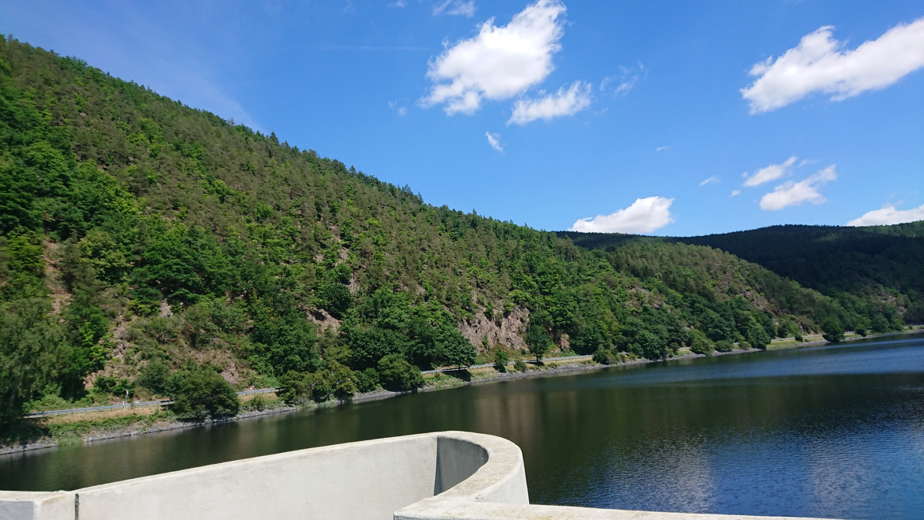 Wir sind am ersten großen Stausee dem Stausee Eichicht angekommen. Über die Staumauer geht es ans andere Ufer der Saale und weiter nach Hohenwarte.