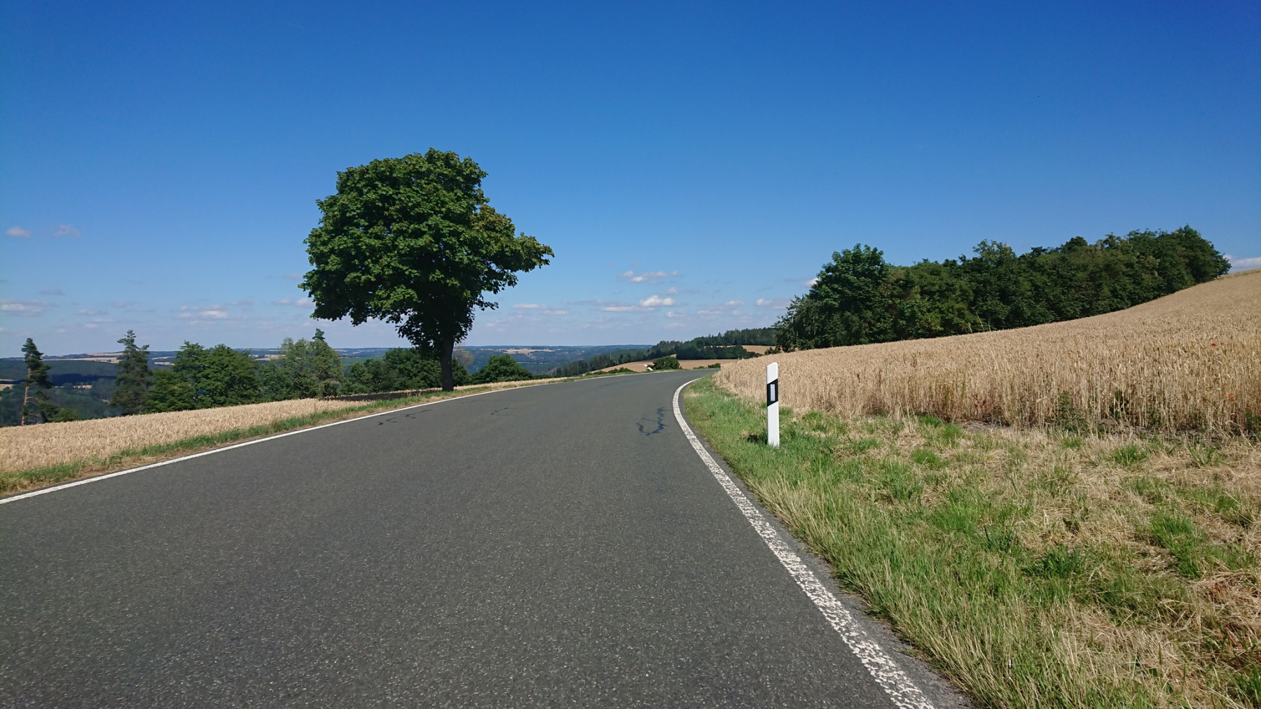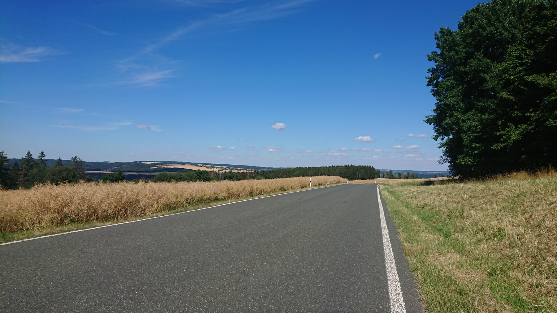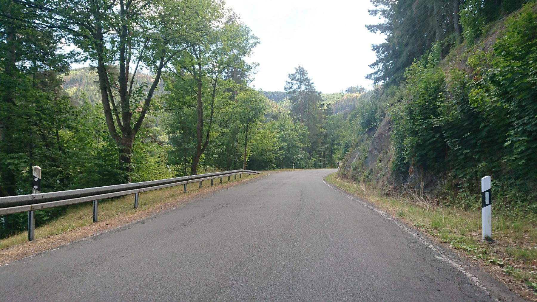 Wir sind nun im Thüringischen Schiefergebirge, es geht nun ein Stück am Stausee entlang, Nach rund 5km verläßt dann die Straße langsam den See und es geht mächtig bergan. Die Straße ist recht eng und unübersichtlich. Es geht nun immer mit 5% – 8% Steigung bergan. Für uns heißt dass, das wir den kleinsten Gang einlegen und mit 6-10 km/h bergan kriechen. Autos, Motorräder und auch Busse müssen uns überholen. Vor Kurven müssen sie auch schon einmal hinter uns herschleichen.