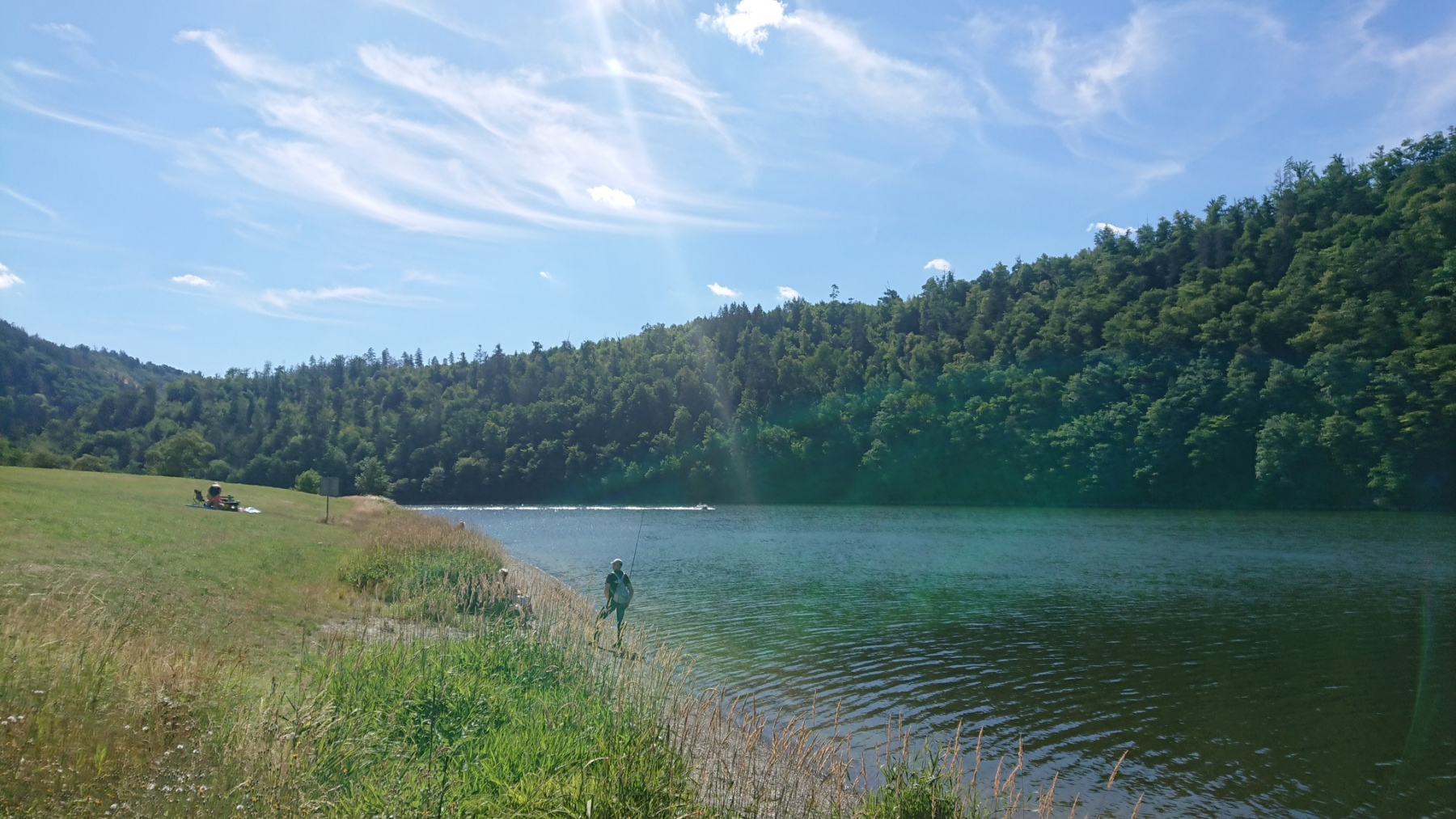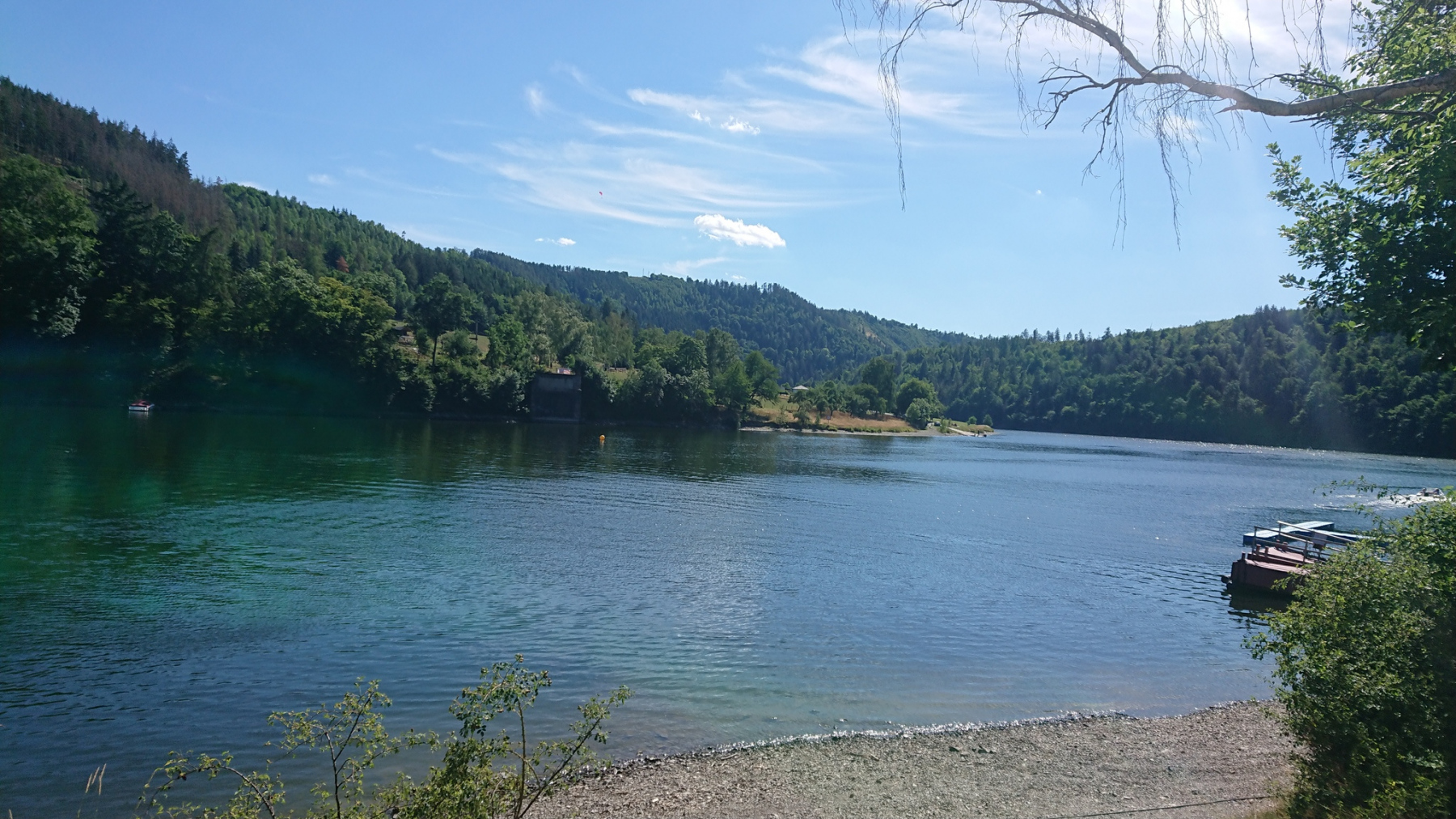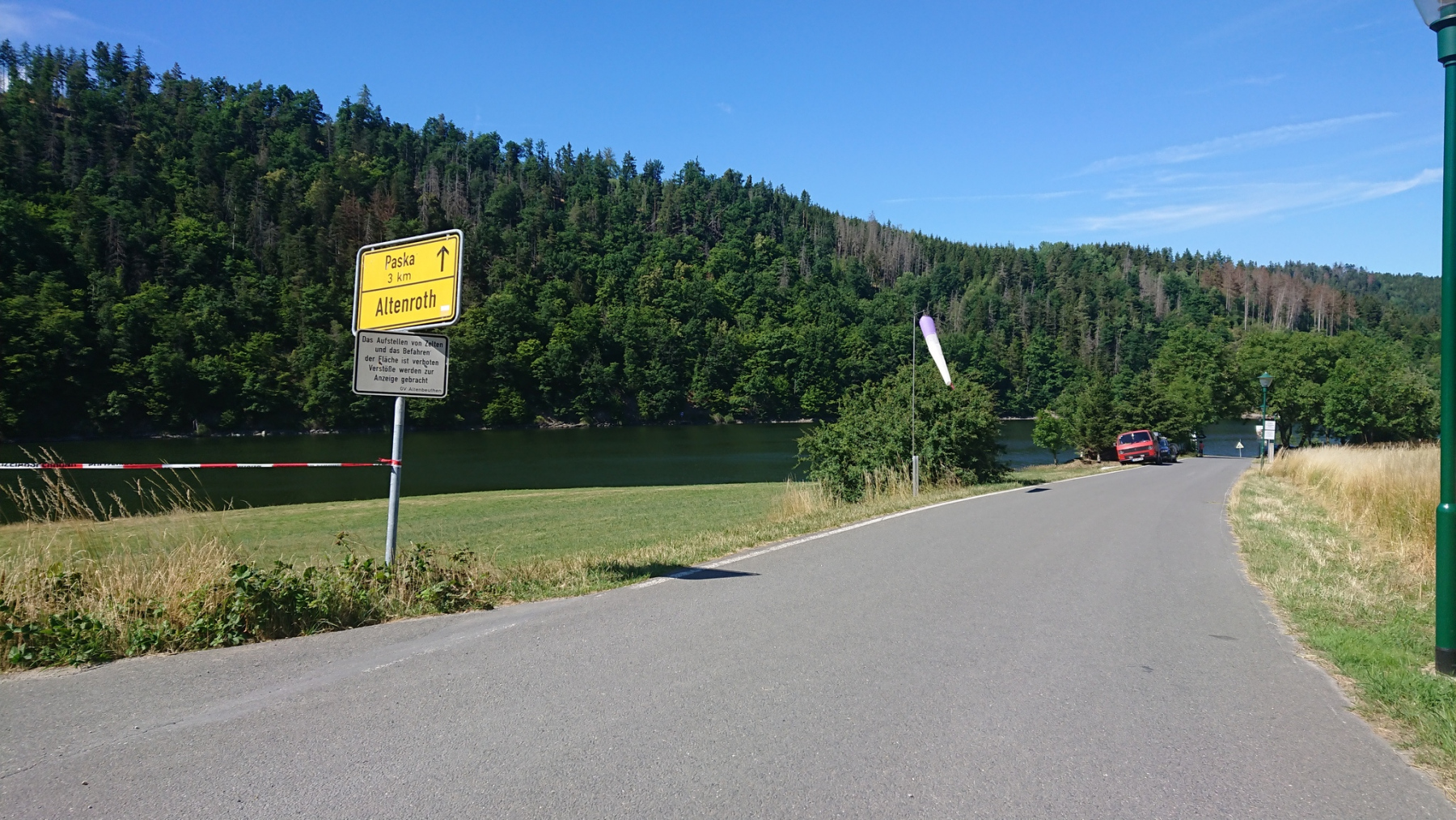 Wir verweilen nur kurz, um uns ein wenig von der letzen Stunde zu erholen. Und dann geht es so, wie wir eben noch bergan gefahren sind, wieder hinunter. Schon 10 Minuten später sind wir wieder am Stausee in Altenroth. 220 Höhenmeter geht es wieder hinunter, dabei sind auch 2 Haarnadelkurven, und einfach laufen lassen können wir es bei 5-8% Gefälle auch nicht. Unsere Bremsen müssen ordentlich arbeiten. Aber das klappt.