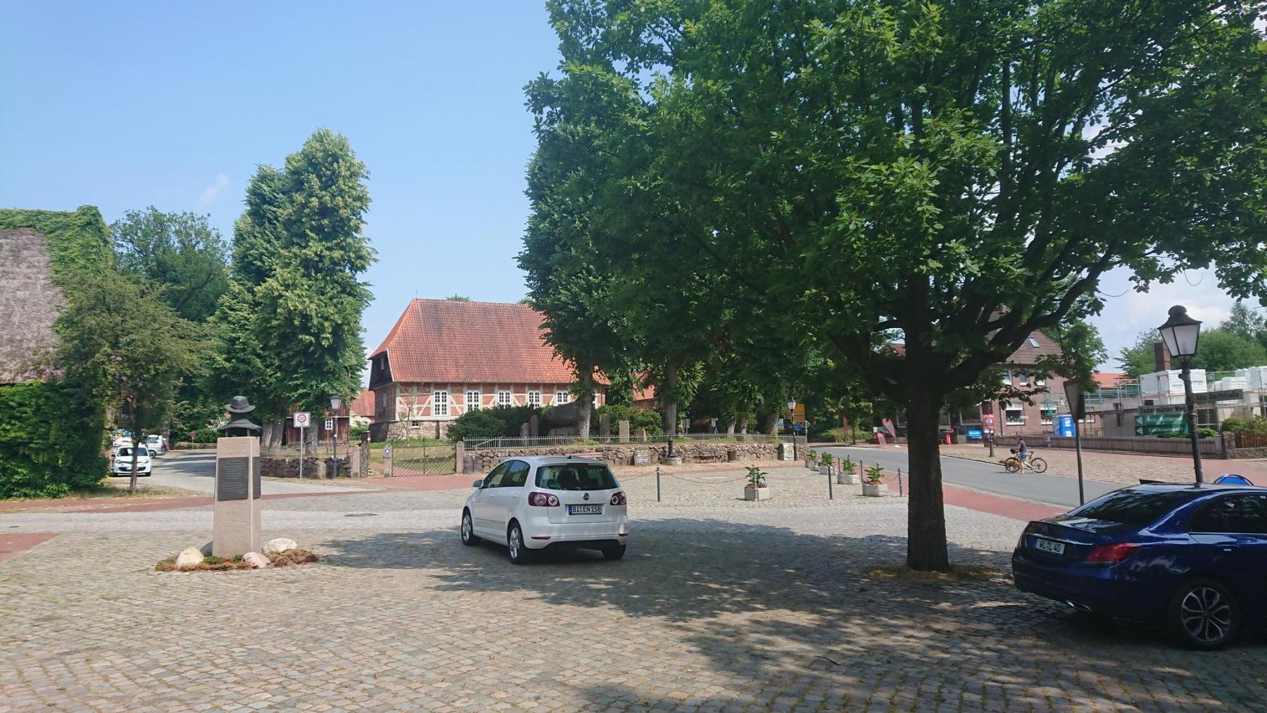 Pause machen wir gegen 12 Uhr in Egestorf am Dorfplatz, verzehren unsere Franzbrötchen und schauen dem Dorfleben zu, das nicht viel zu bieten hat an diesem Donnerstag Mittag.