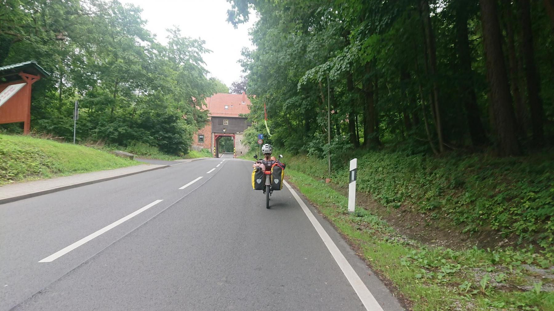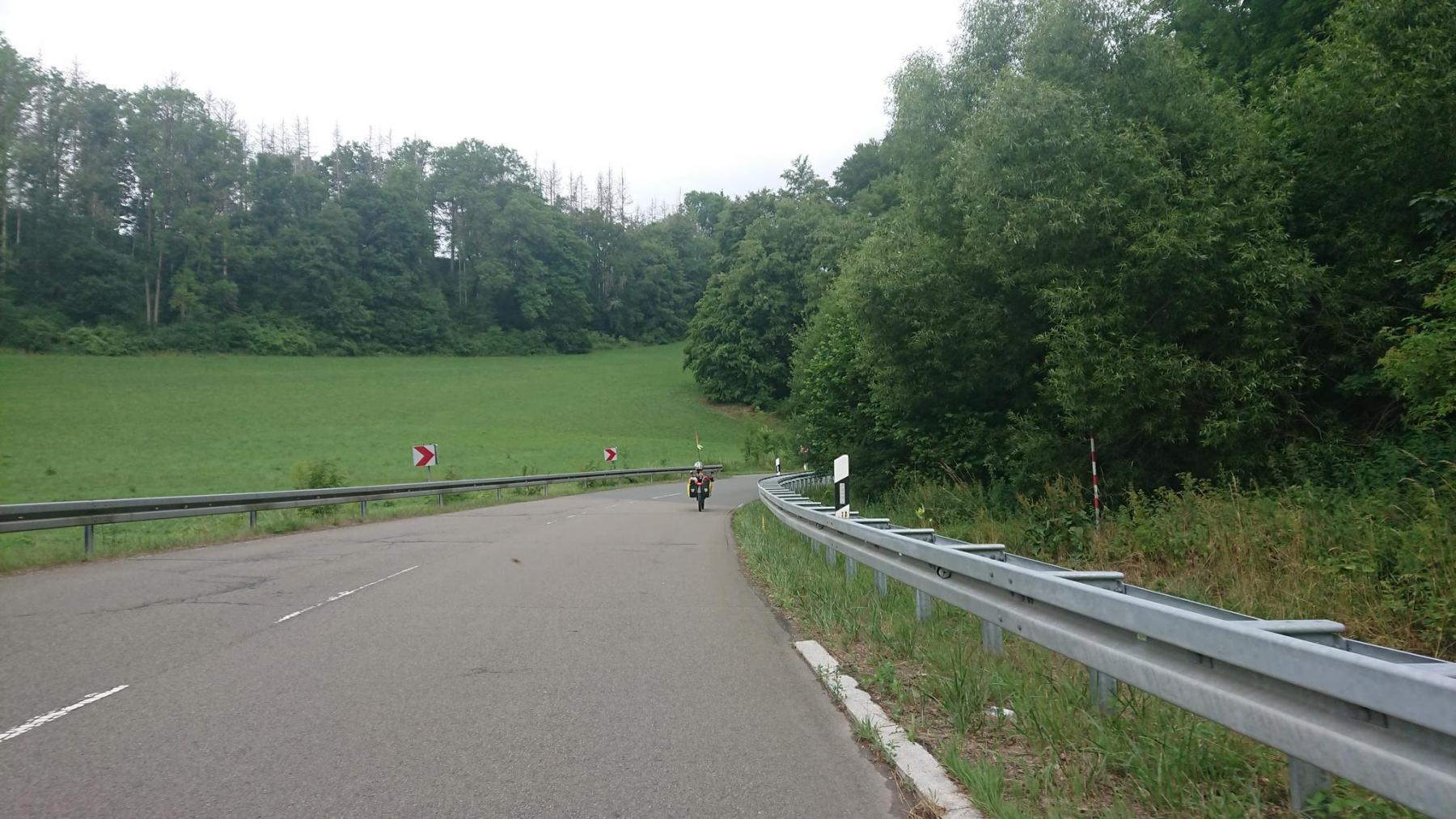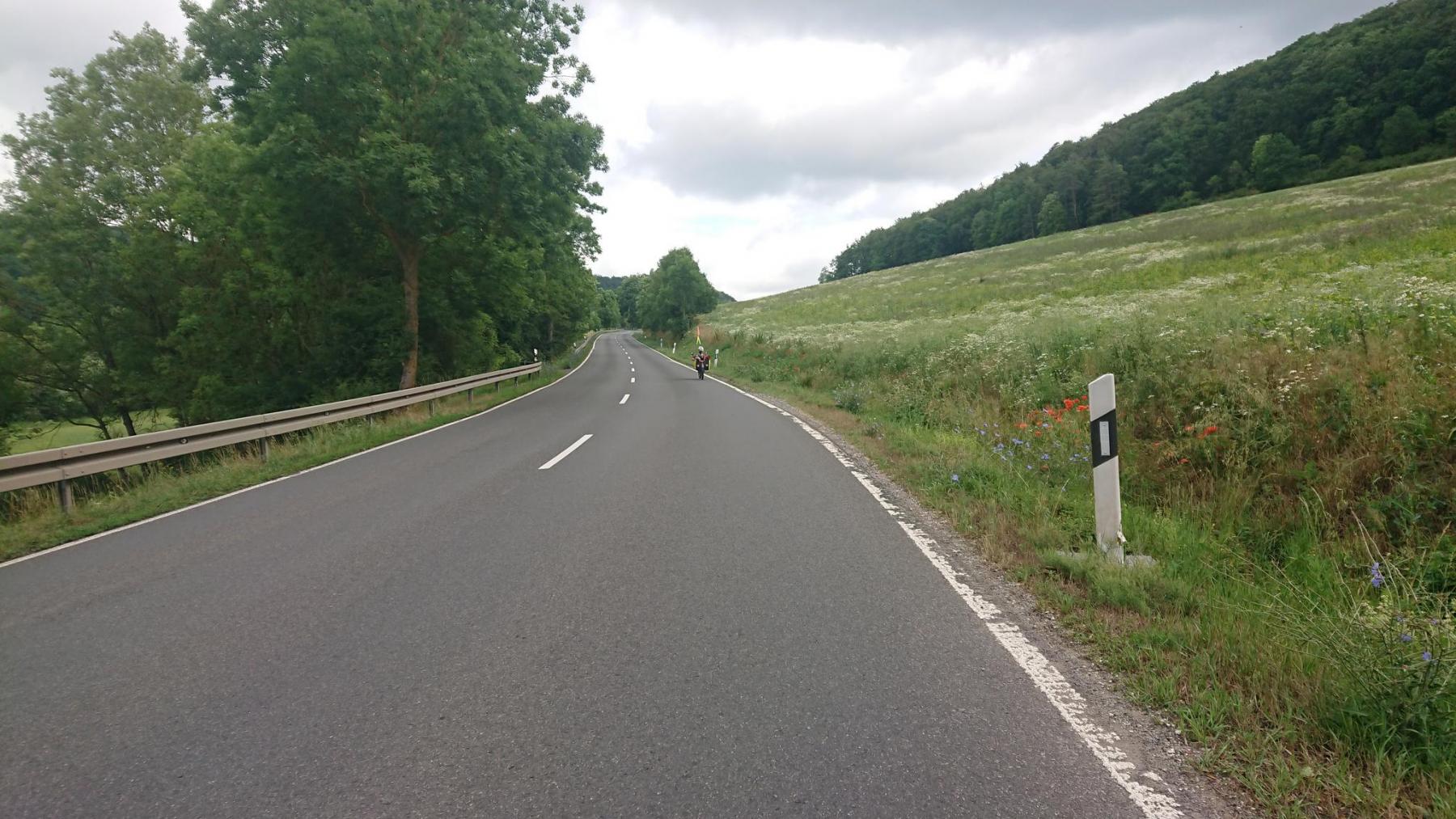 Und dann sind wir oben auf 430 m ü.NN, gestartet an der Werra bei 190 m. Geschafft. Und dann geht es fast genauso steil wieder bergab. Die Strecke ist fast gerade, wir können es rollen lassen, doch bei mehr als 55km/h benutzen wir dann doch mal die Bremsen.