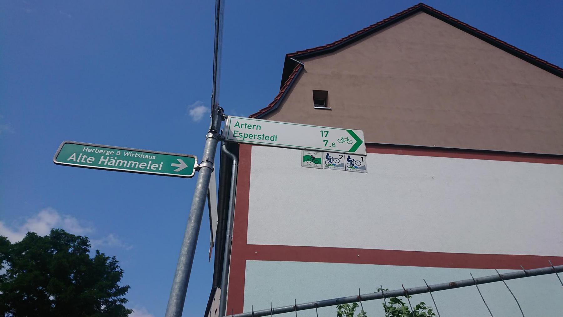 Artern ist erreicht, unser heutige Tagesziel, nun nur noch zum Hotel – äh, wie war der Name ? Hotel am Weinberg – wir müssen den steilen Weg in Artern schieben. 8% auf alten bröckeligen DDR-Betonplatten das schaffen wir nicht mehr fahrend. 111 km haben wir hinter uns.