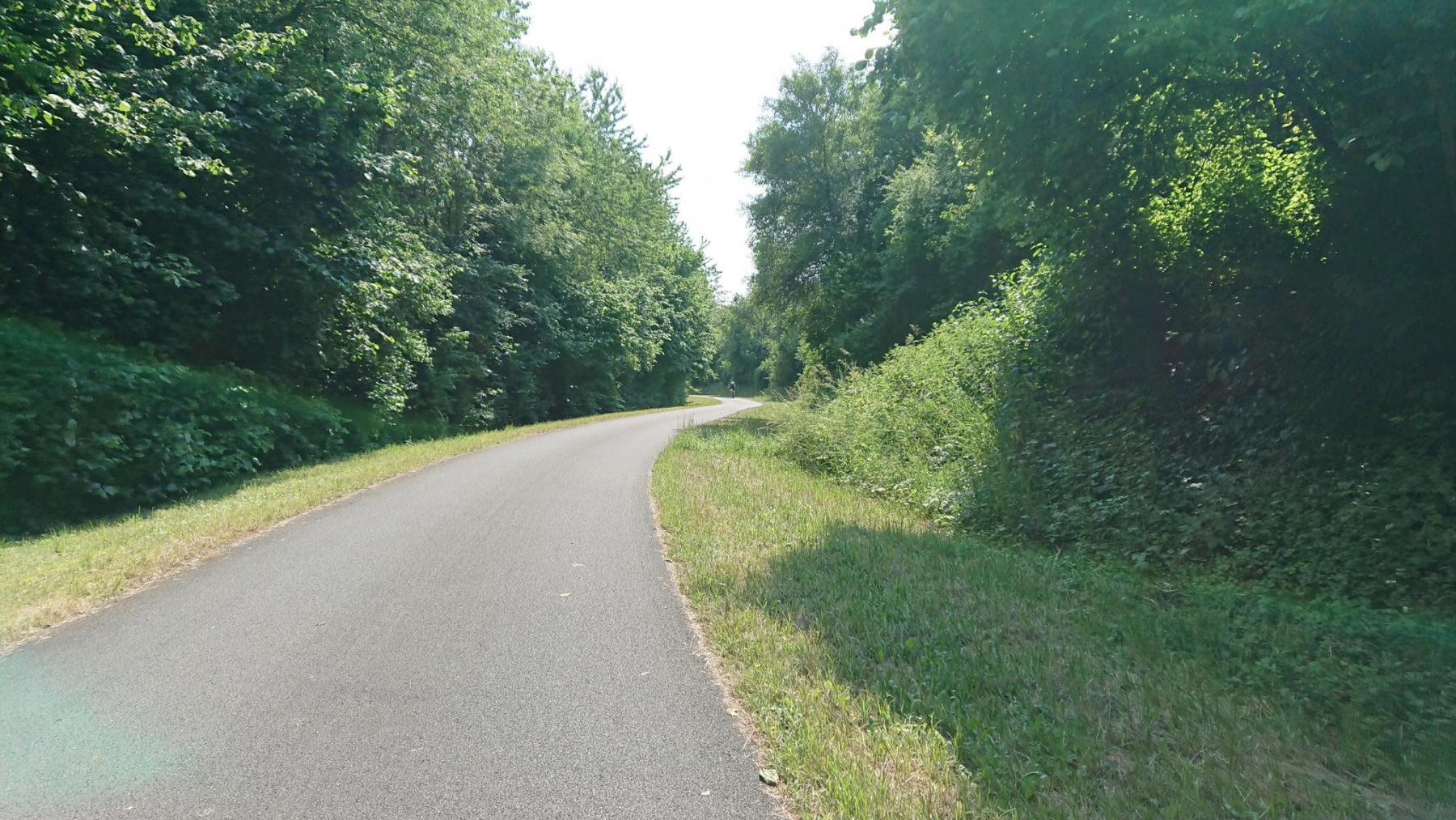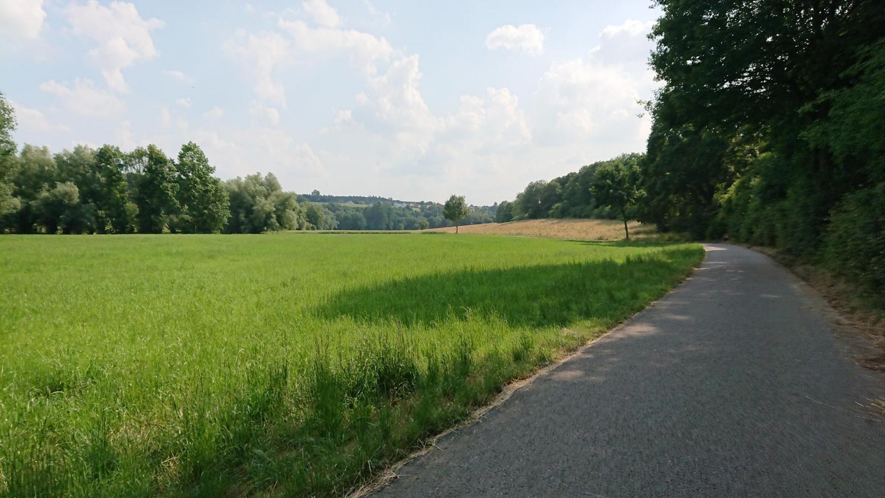 Zurück auf dem Alme-Radweg kommen wir gut voran. Der Weg ist gut ausgebaut und führt meist nah an der Alme entlang, so daß größere Steigungen ausbleiben, aber es geht immer ein wenig bergan, was wir aber kaum merken. Allerdings merken wir, dass er recht warm ist – Das Navi zeichnet Temperaturen von bis zu 32 °C auf – und so werden unsere Trinkflaschen bald leer.
