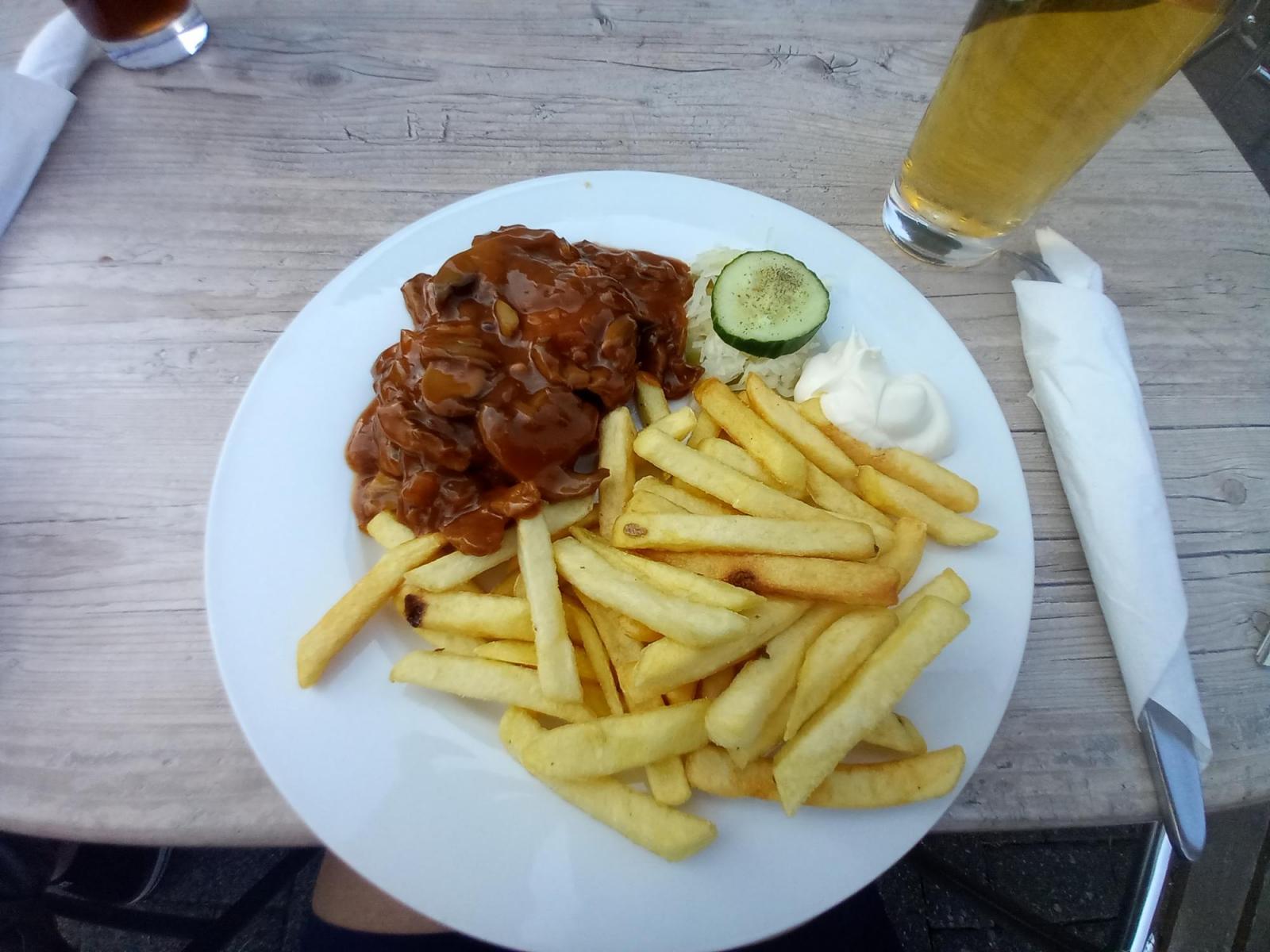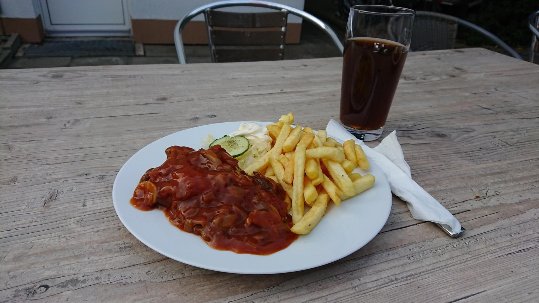 Wir bekommen sogar noch Abendessen im Tannenhof, die Karte ist einfach: Schnitzel in vielen Variationen, dazu gibt es Pommes. Nachdem die geschlossene Gesellschaft ihr Abendessen bekommen hat, können auch wir bestellen und dann draußen immer noch mehr als 24°C essen.
