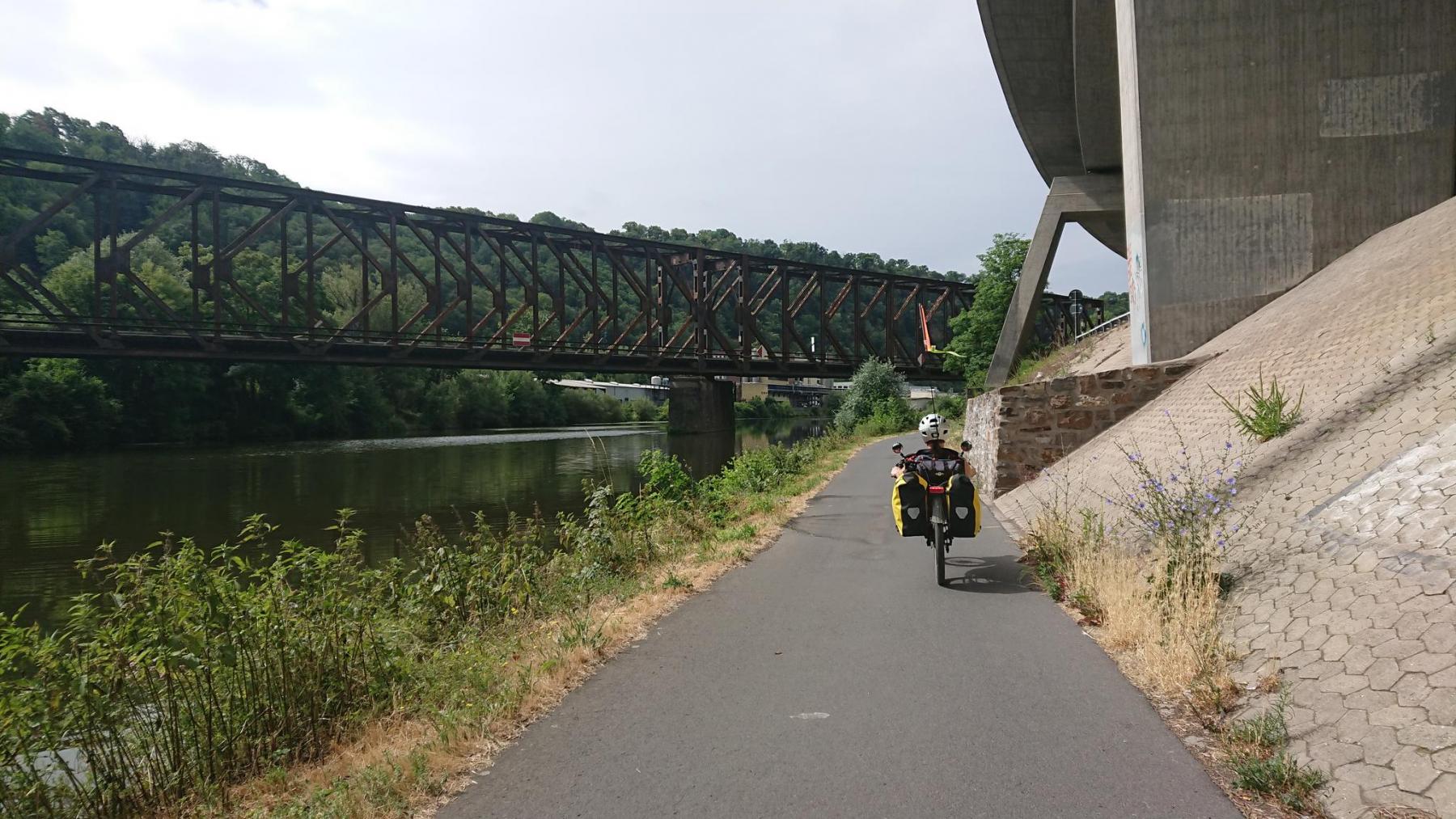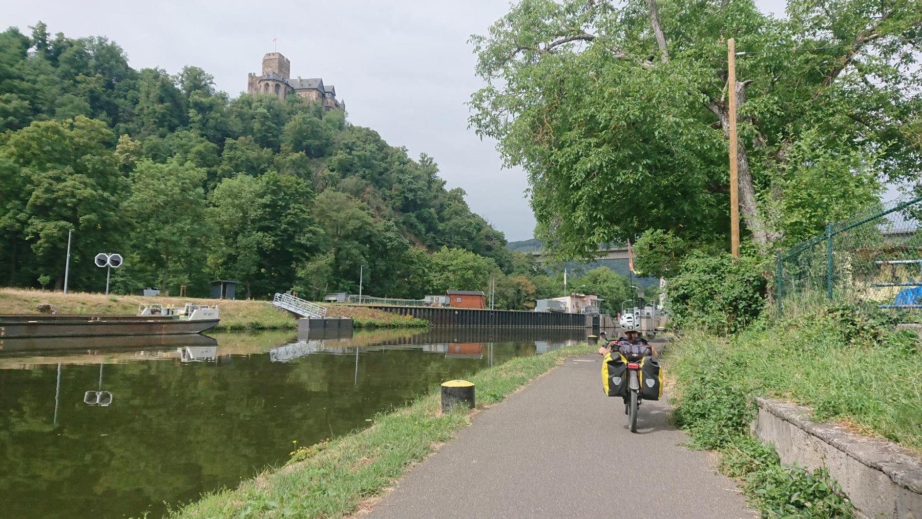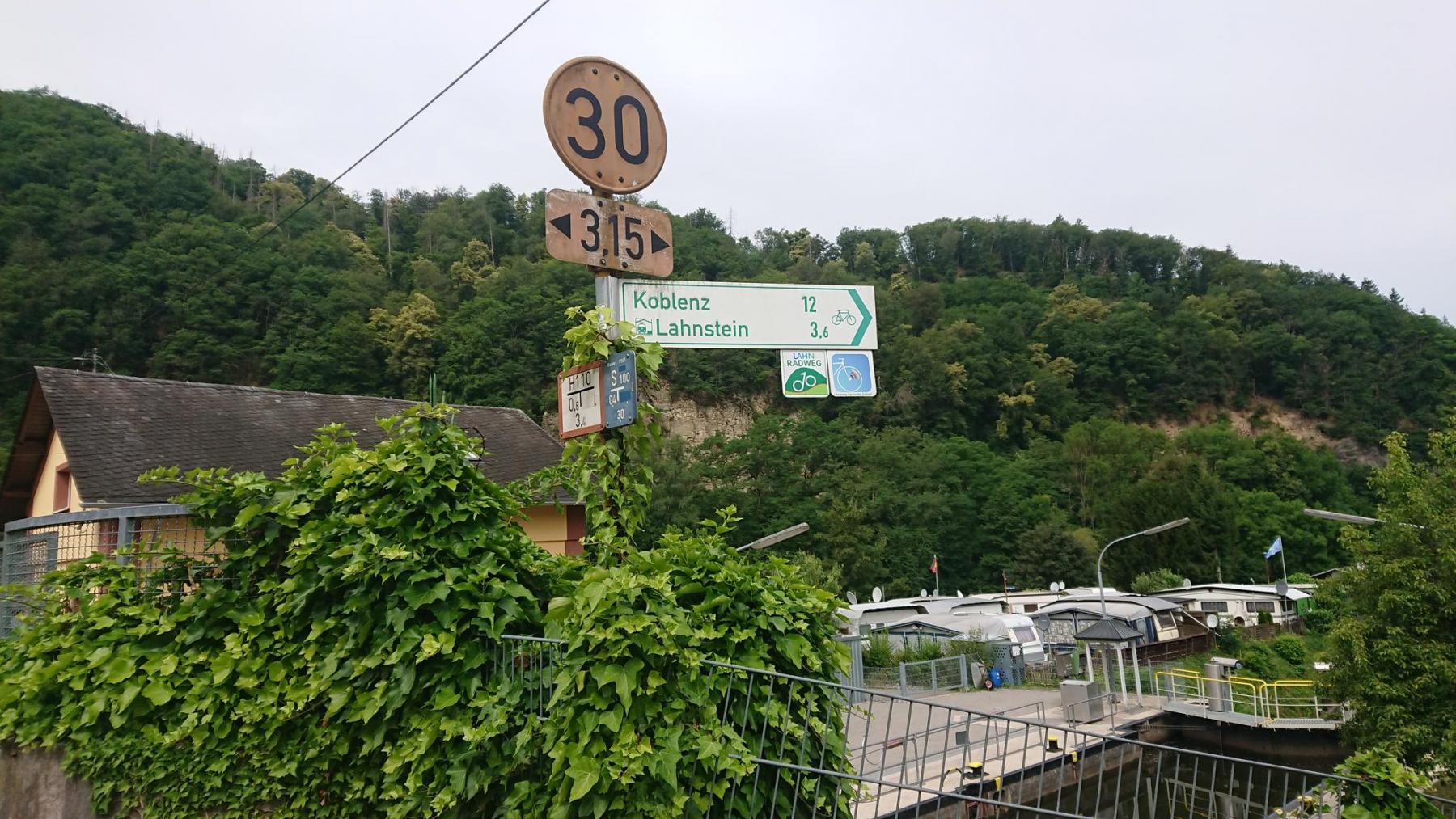 Mit 8-9 % geht es hinauf und der Bauch ist auch noch voll. Danach geht es wie auf einer Berg- und Talbahn bis nach Nassau – runter und rauf, runter und rauf. Auf den Abfahrten über 40km/h stellenweise über 50km/h, an den Anstiegen schaffen wir grad mal noch so 6-8 km/h. Auf dieser Seite der Lahn ist halt nicht mehr Platz. Ab Nassau wird er besser – schnell ist Bad Ems erreicht.