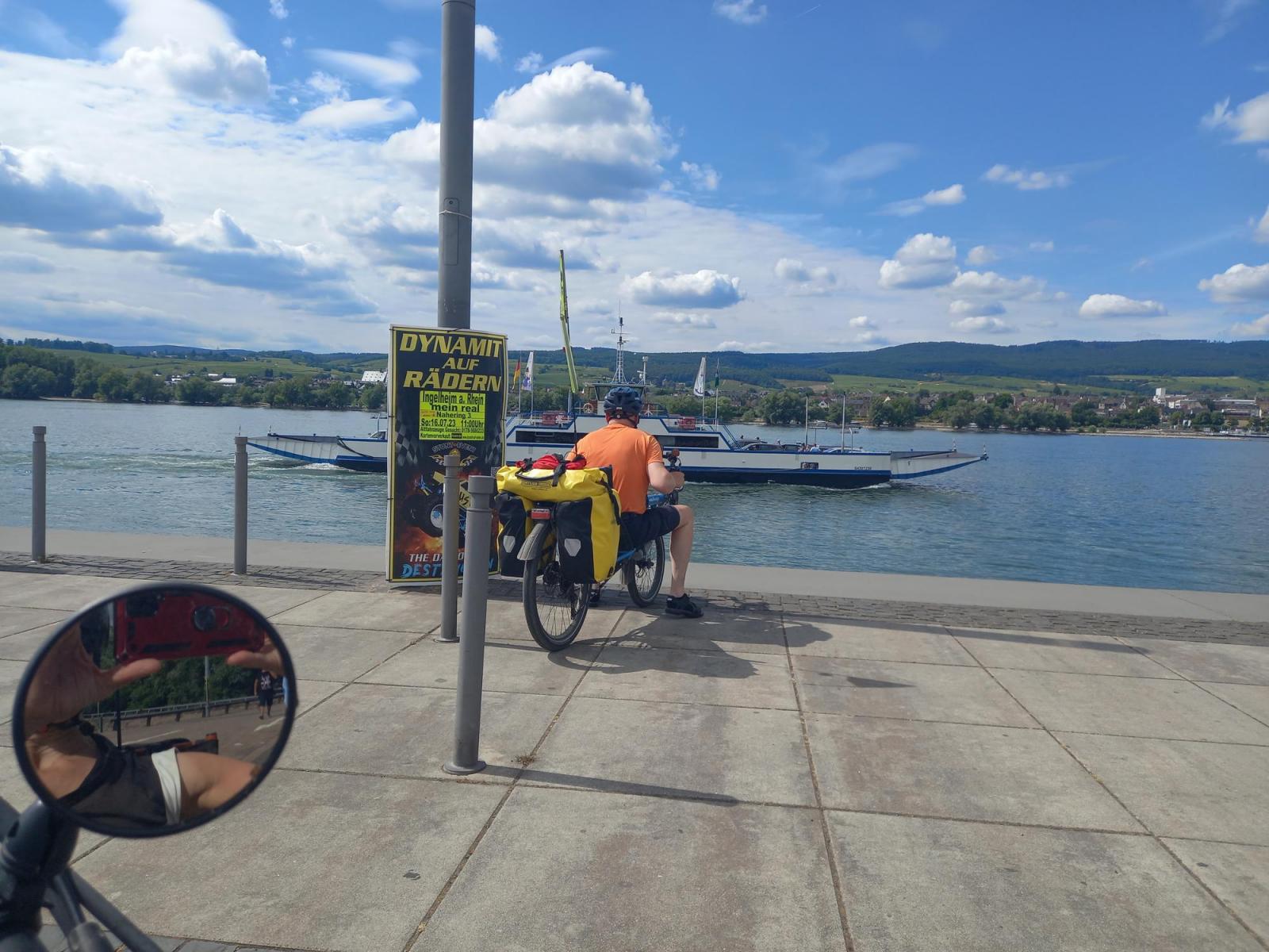 In Ingelheim fährt uns die Fähre grade vor der Nase weg und wir haben das Nachsehen. Aber nach rund 20 Minuten Wartezeit ist sie zurück und bringt uns auf die andere Rheinseite.
