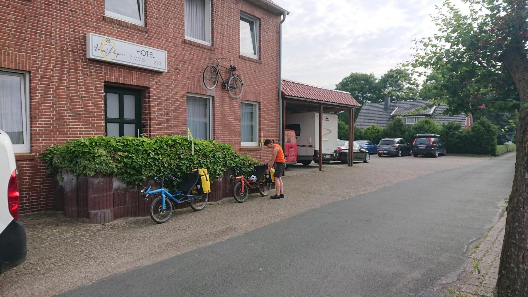 Und der Wind wird immer mehr. Nach 108 km erreichen wir das Hotel in Rodenkirchen. Es ist alt, die Zimmer sind genauso alt. Der Eingang zu den Hotelzimmern könnte mal gefegt und gereinigt werden, aber das Zimmer zumindest ist sauber. Ingesamt macht es aber eine lieblosen Eindruck. Vermutlich machen die Betreiber das noch so lange wie sie es körperlich können, aber investieren werden sie vermutlich nichts mehr in das Haus. Das Frühstück am nächsten Morgen ist sehr einfach gehalten. Für den Preis von annähernd 100€ ist die Leistung nicht angemessen.