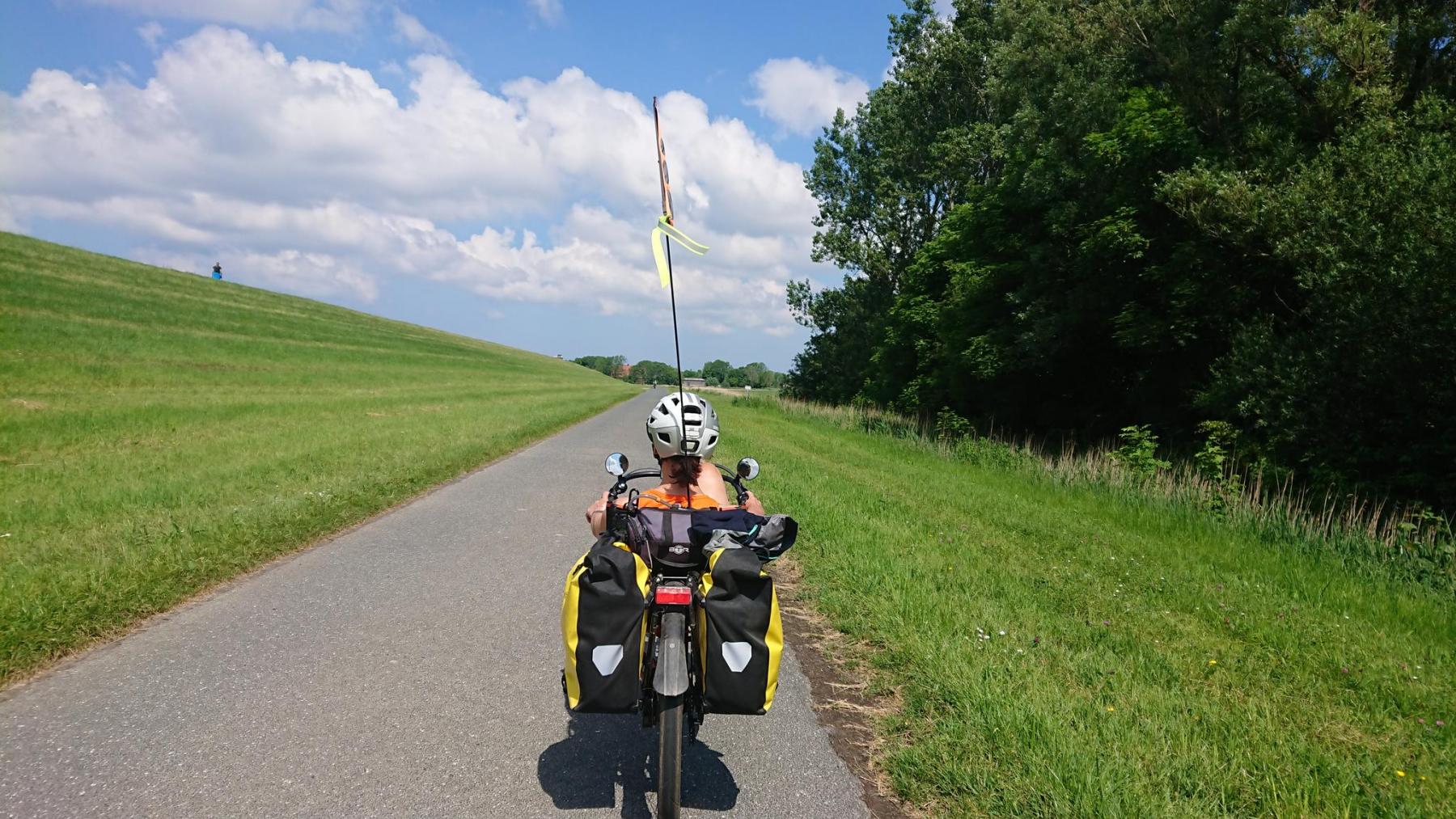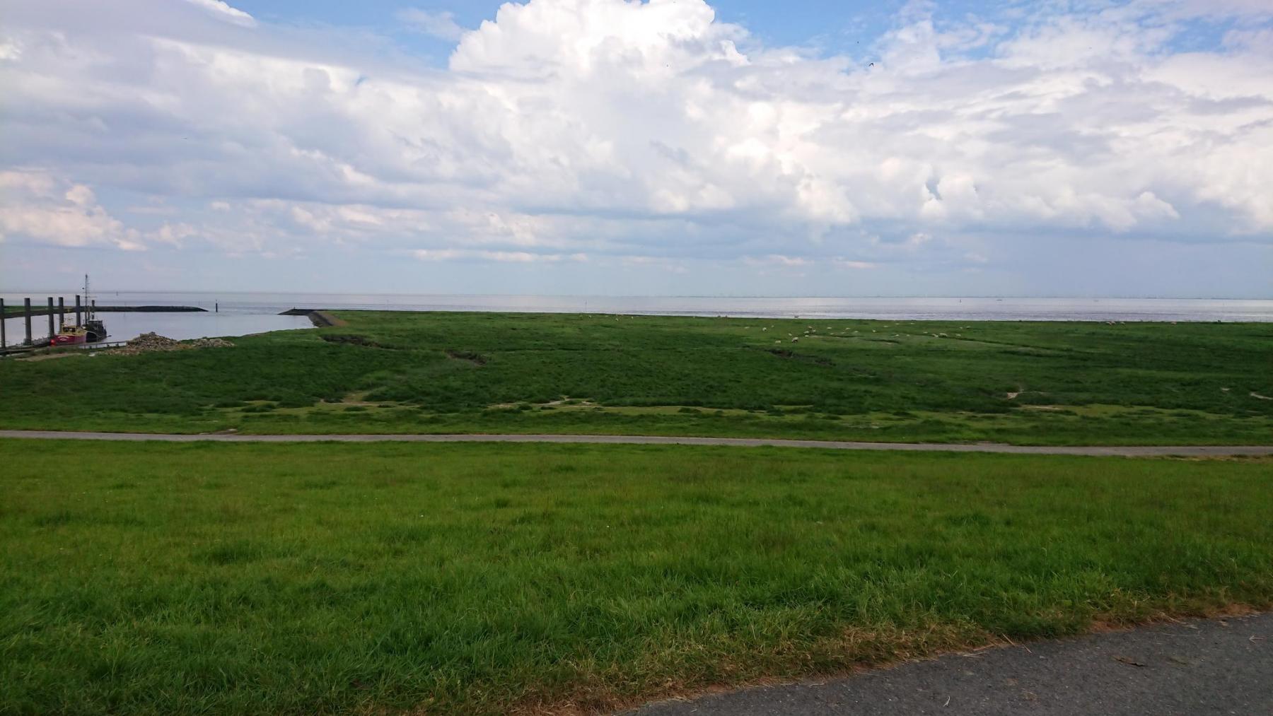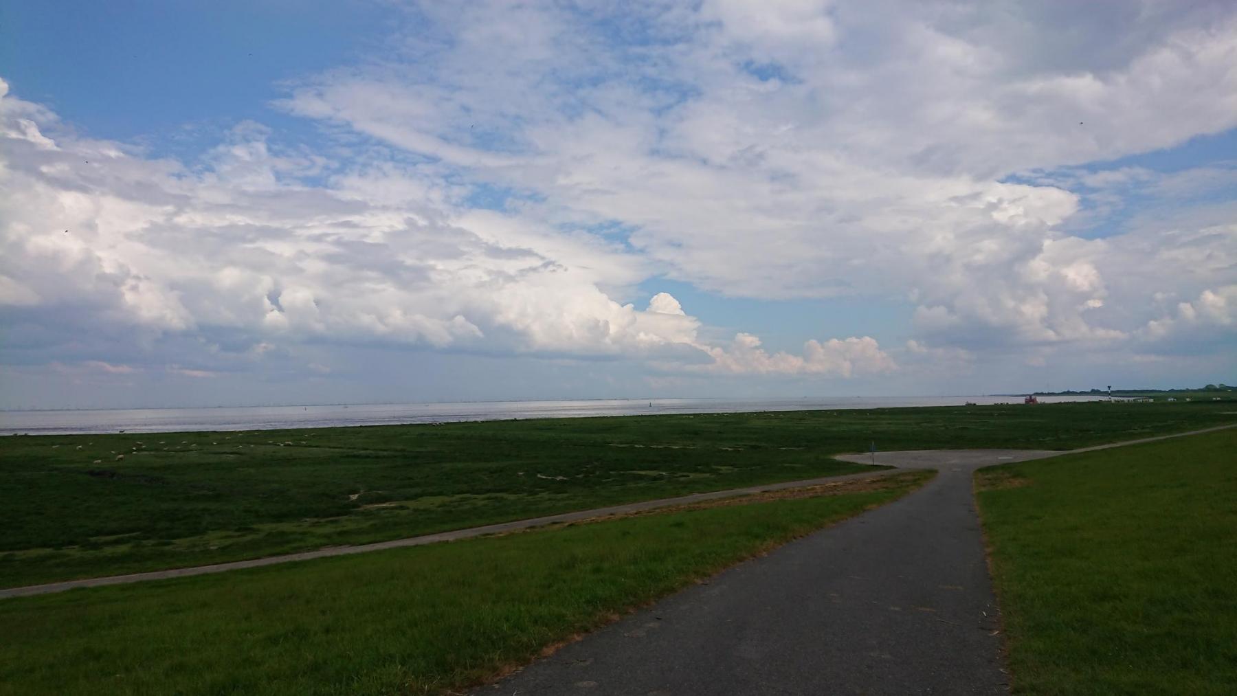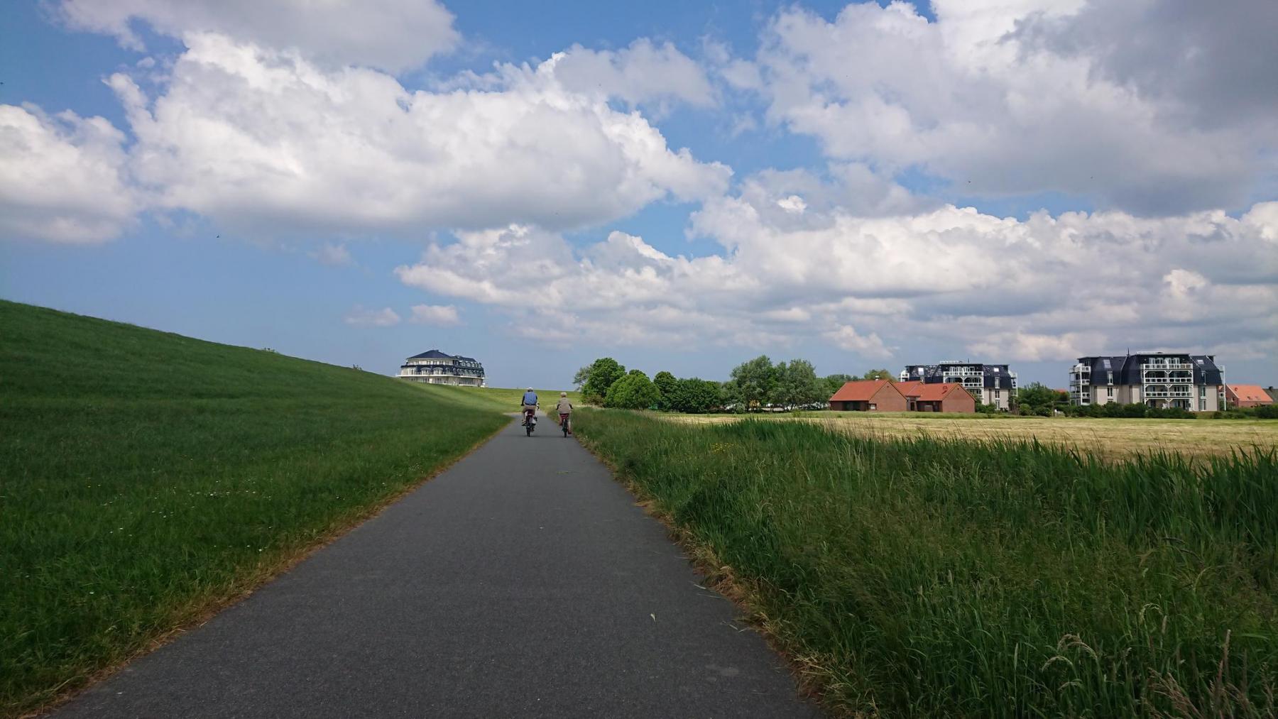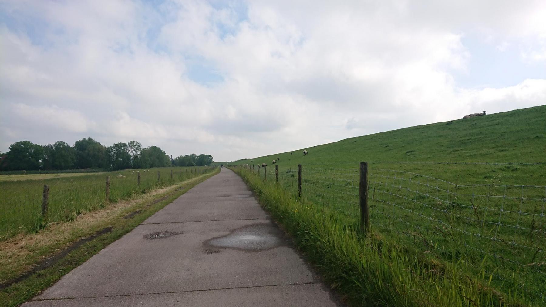 Von nun an geht es immer am Deich entlang nach Norden. Zwischendurch ein paar kleine Orte, Dorum-Neufeld, Cappel-Neufeld, Spieka-Neufeld, überall viele Touristen, die am Pfingstmontag sich mit Wohnmobilen und Campinganhängern wieder auf die Heimreise machen.