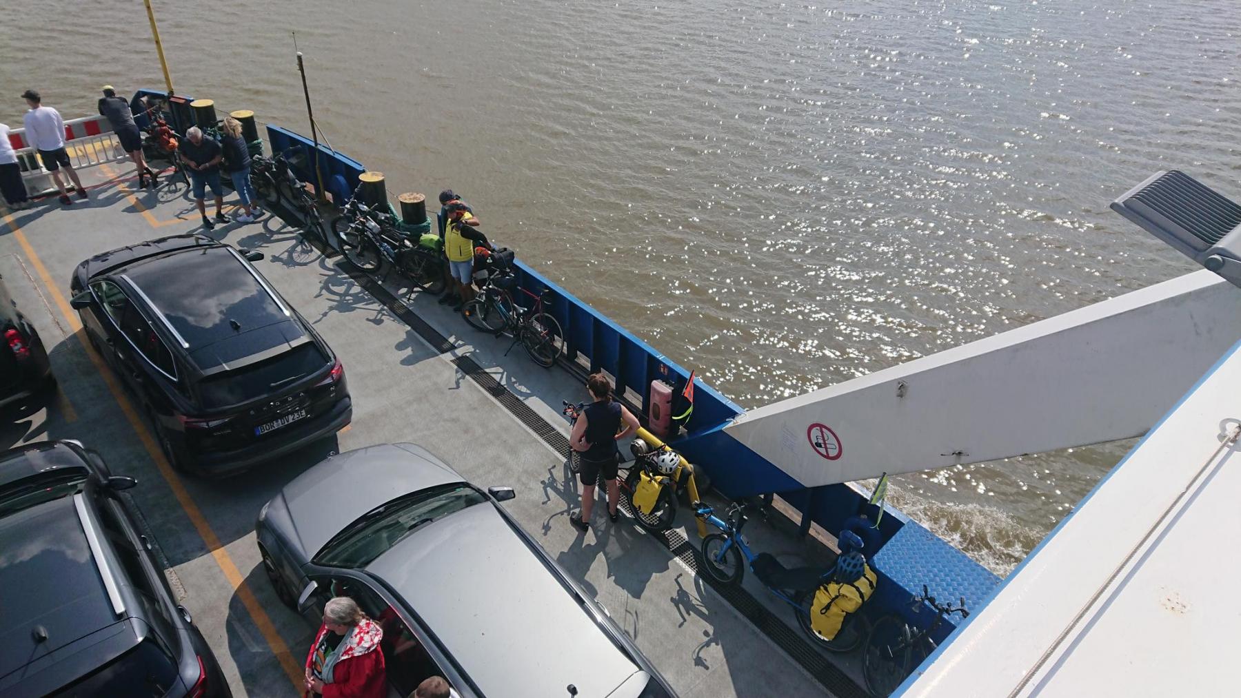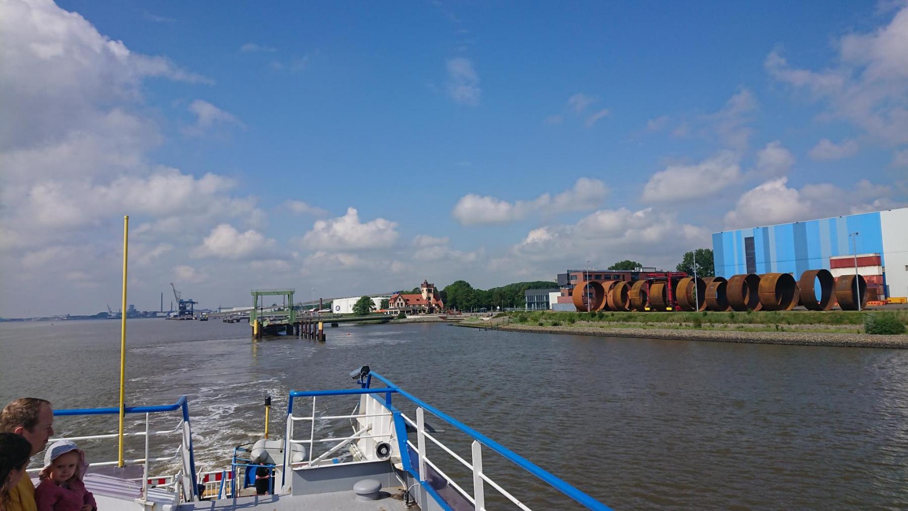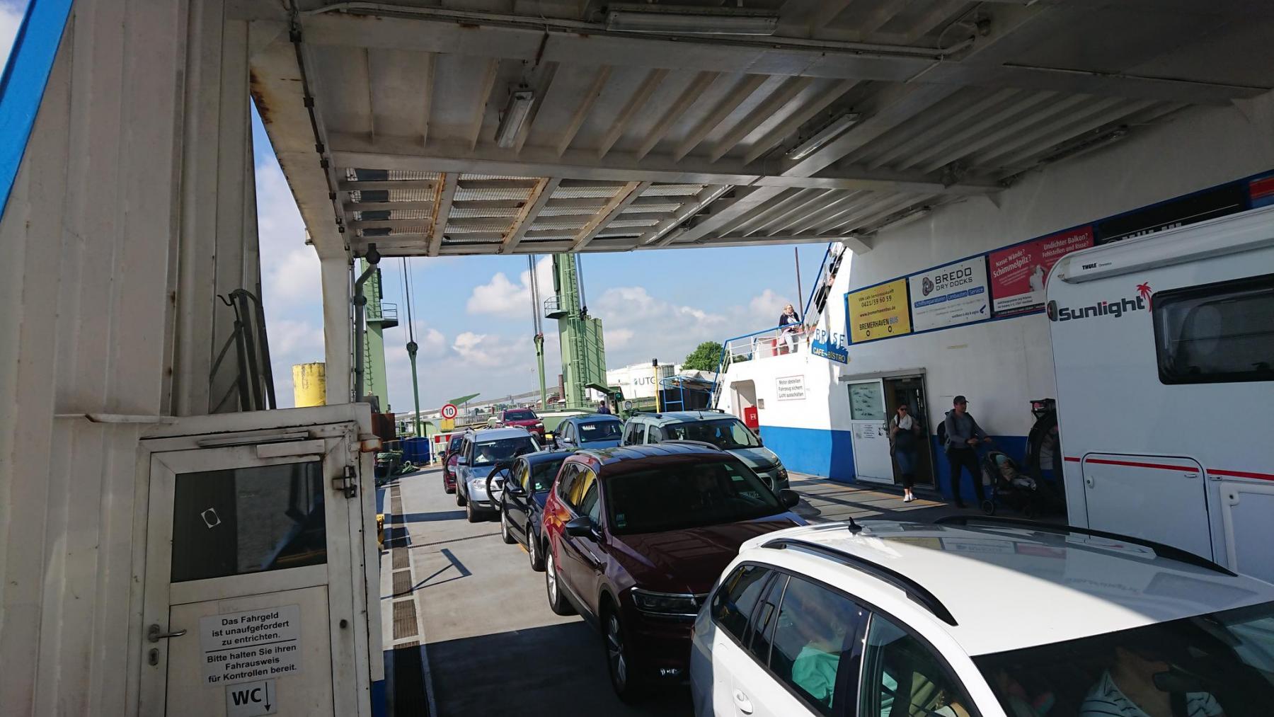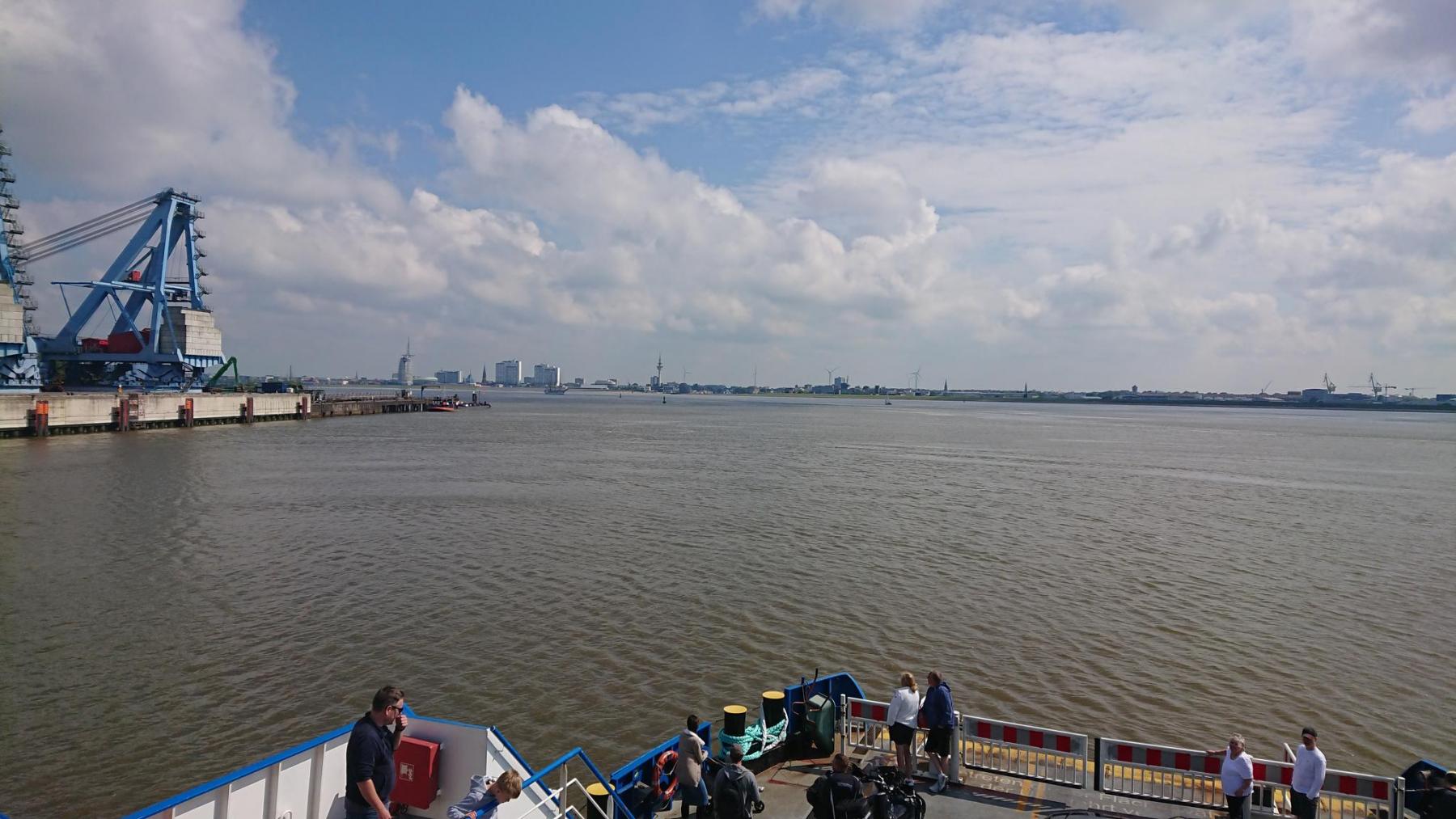 Leider ist die Weserfähre gerade weg – sie hat schon abgelegt, als wir ankommen. Also müssen wir 40 min warten. Leider fährt heute nur eine Fähre.