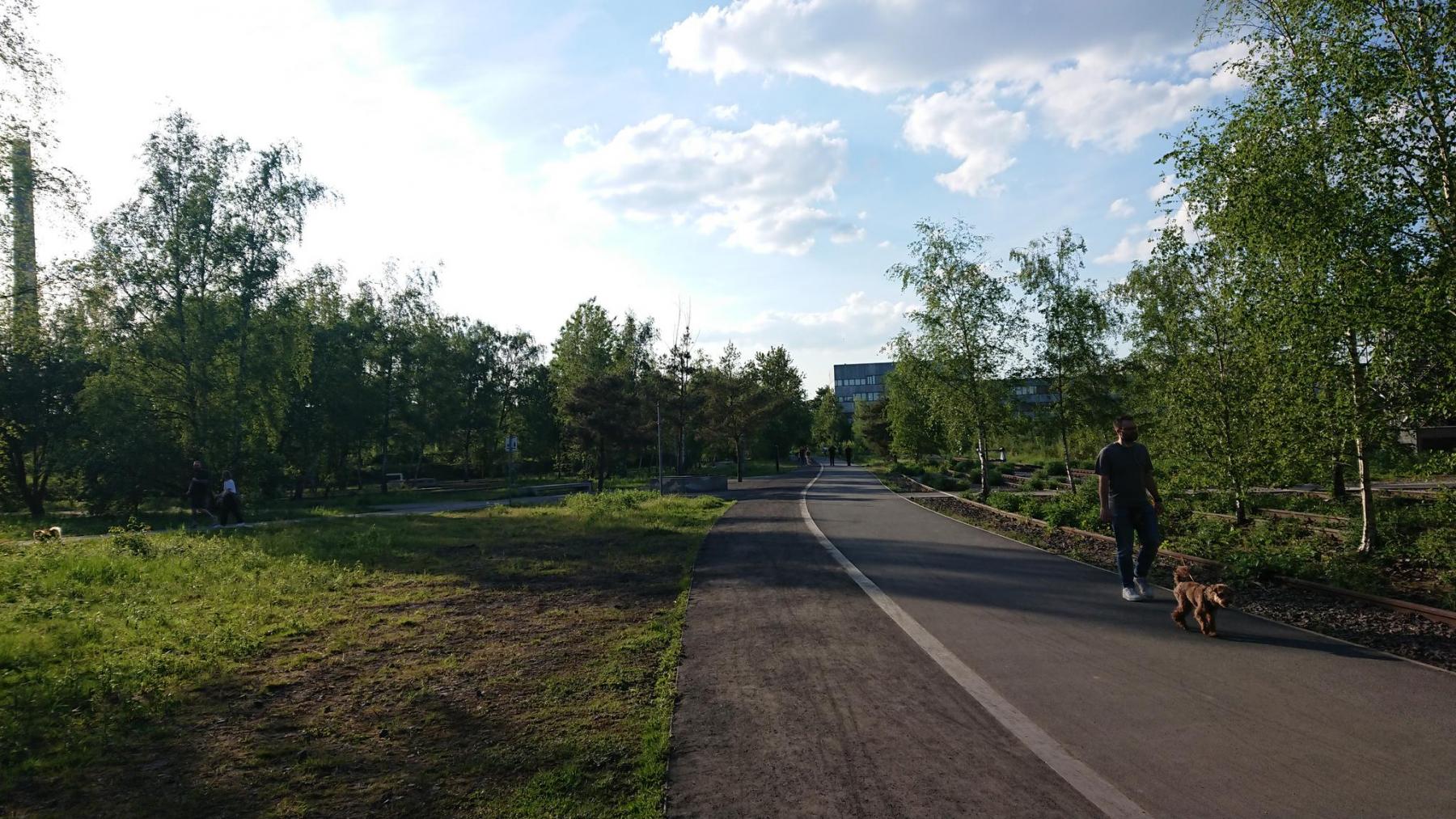 Dann noch ein Stück durch Gelsenkirchener Wohngebiete – meist ohne Radinfrastuktur – es geht so, bis wir dann beim Revierpark Nienhausen auf die alte Bahnstrecke zur Zeche Zollverein stoßen und diese zur alten Zeche folgen.