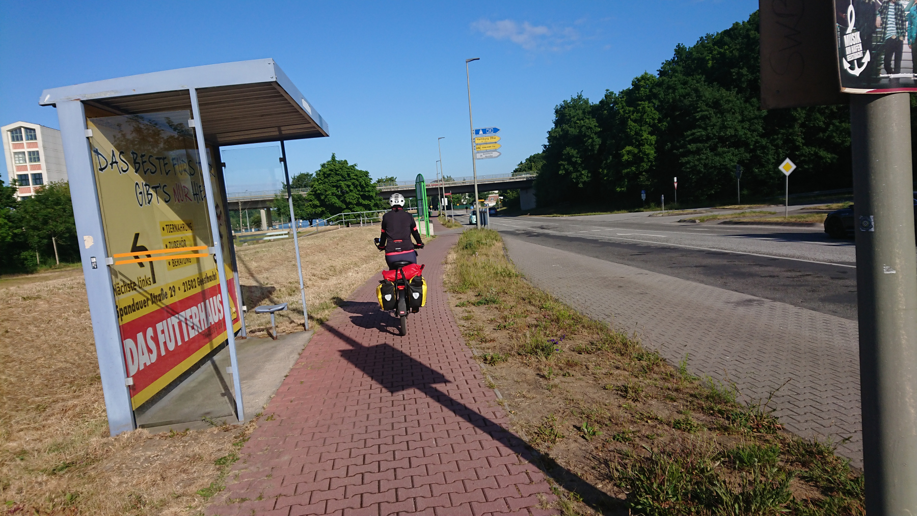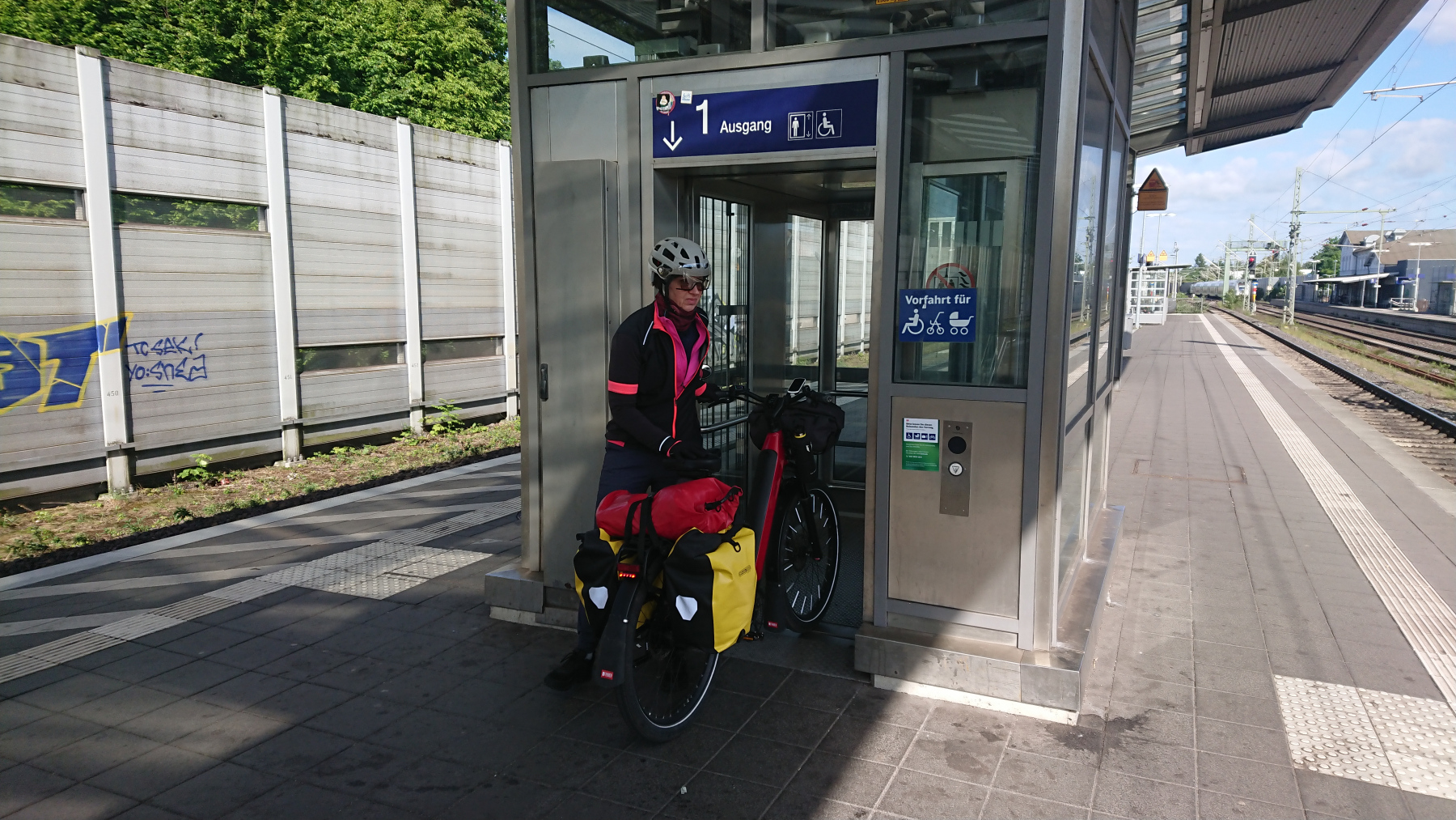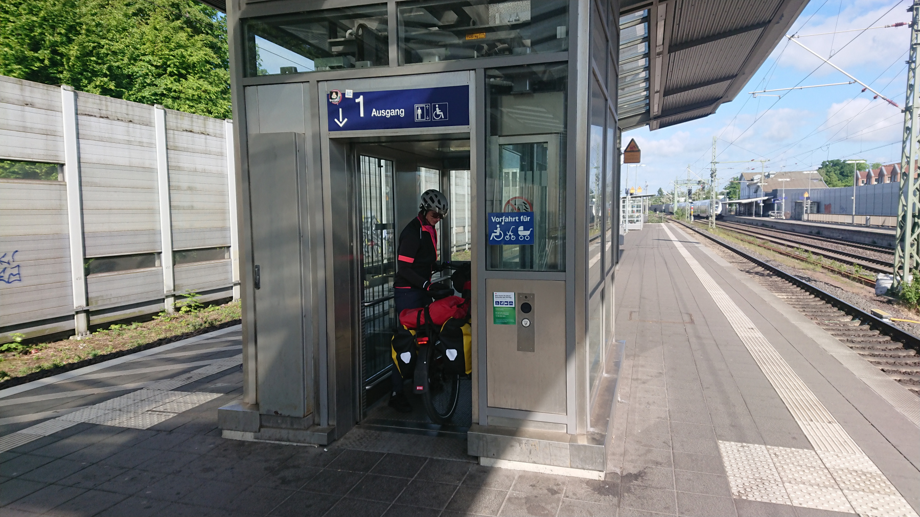 Chaotisch wird es dann in Hannover. Es ist Mittagszeit, der Bahnhof und die Bahnsteige gerammelt voll. Wir müssen mit den Rädern von einem Bahnsteig zum anderen – haben aber genug Zeit zum Umsteigen – nur die Aufzüge sind stark frequentiert und es geht auch immer nur ein Rad rein. Für die Auffahrt zum anderen Bahnsteig nehmen wir dann kurzentschlossen die Rolltreppe, da müssen wir nicht weiter warten.