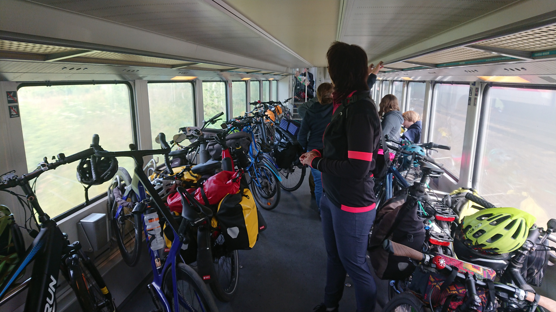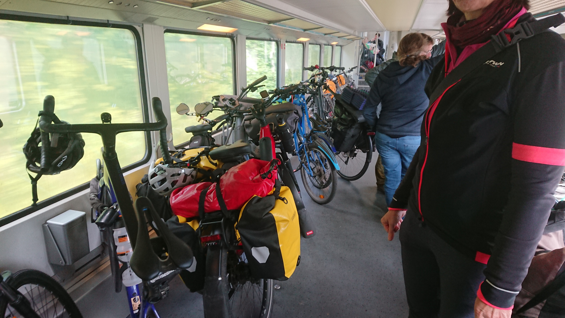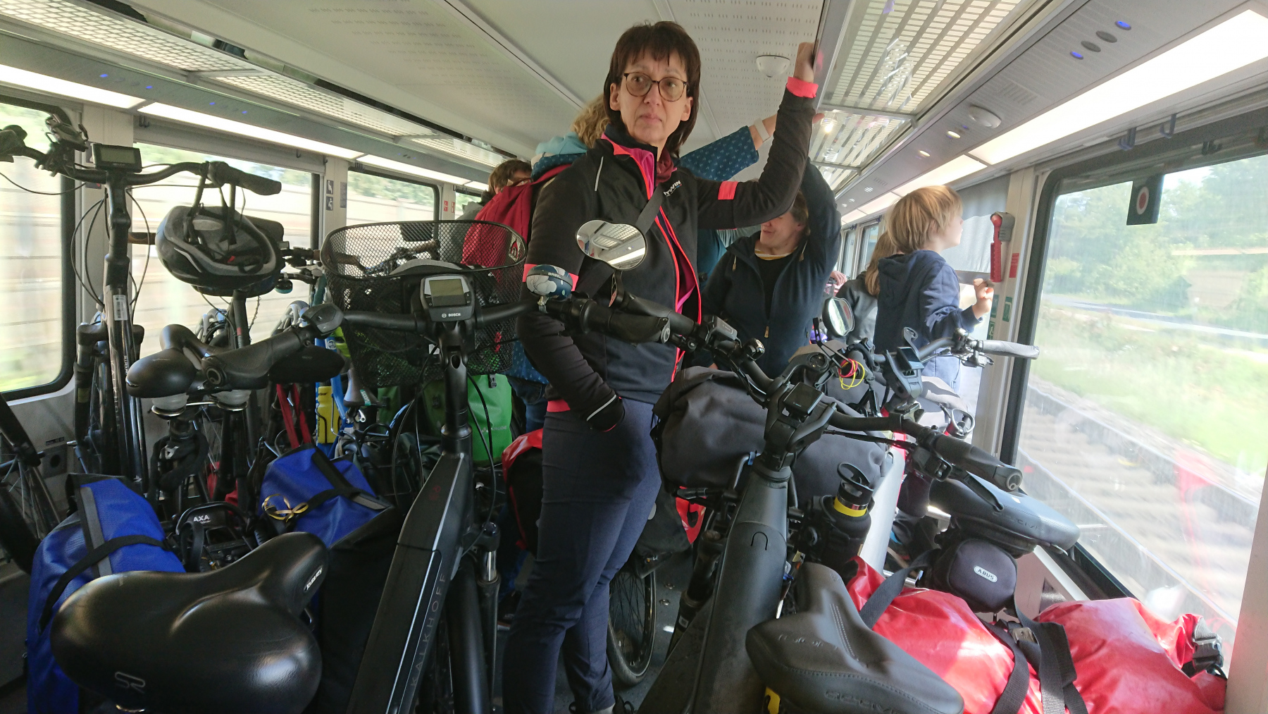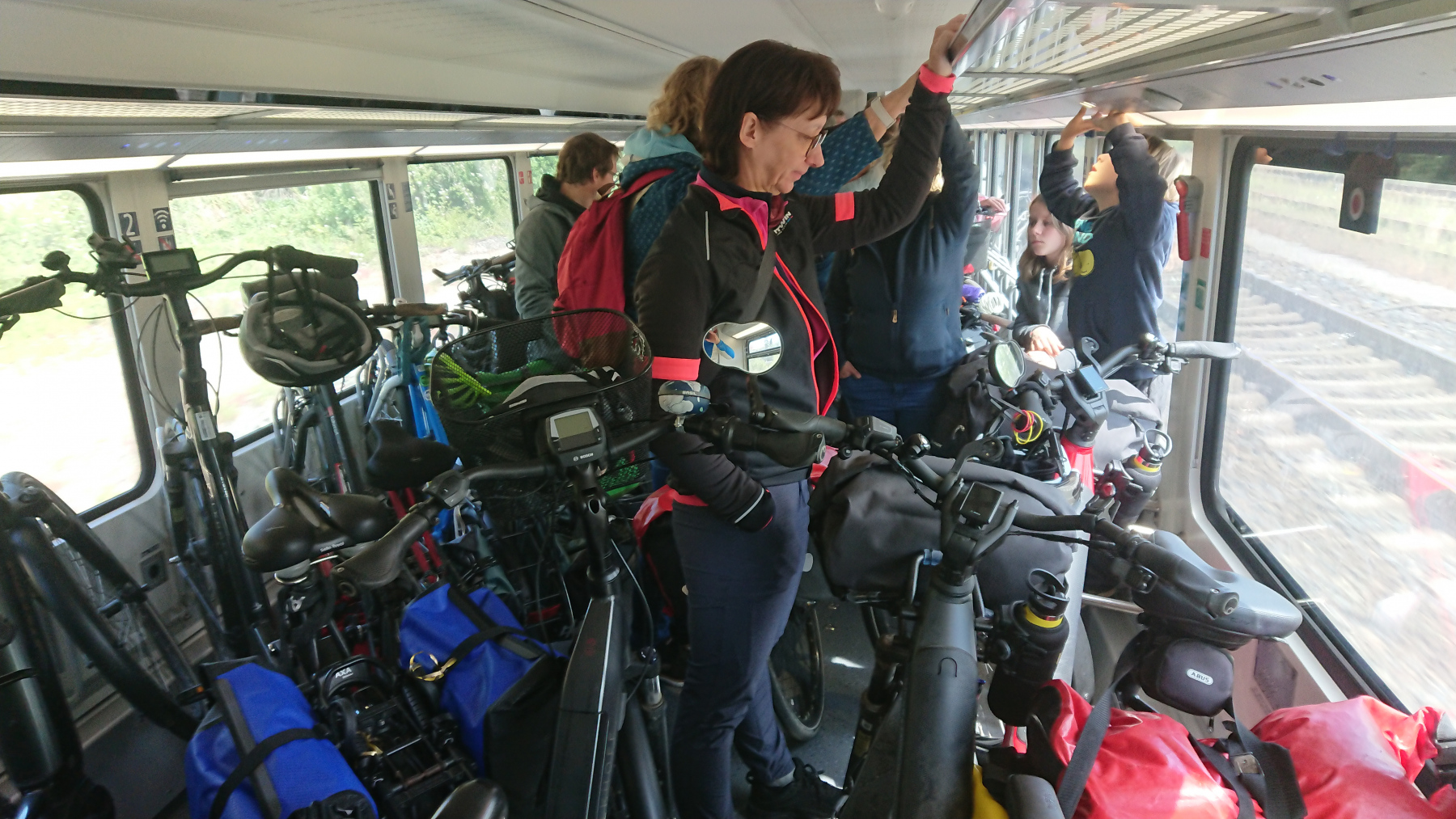 Der Zug aus Hamburg ist schon recht voll. Im Fahrradabteil ist noch ein wenig Platz für uns und die Räder, aber einer Sitzplatz gibt es nicht mehr.
