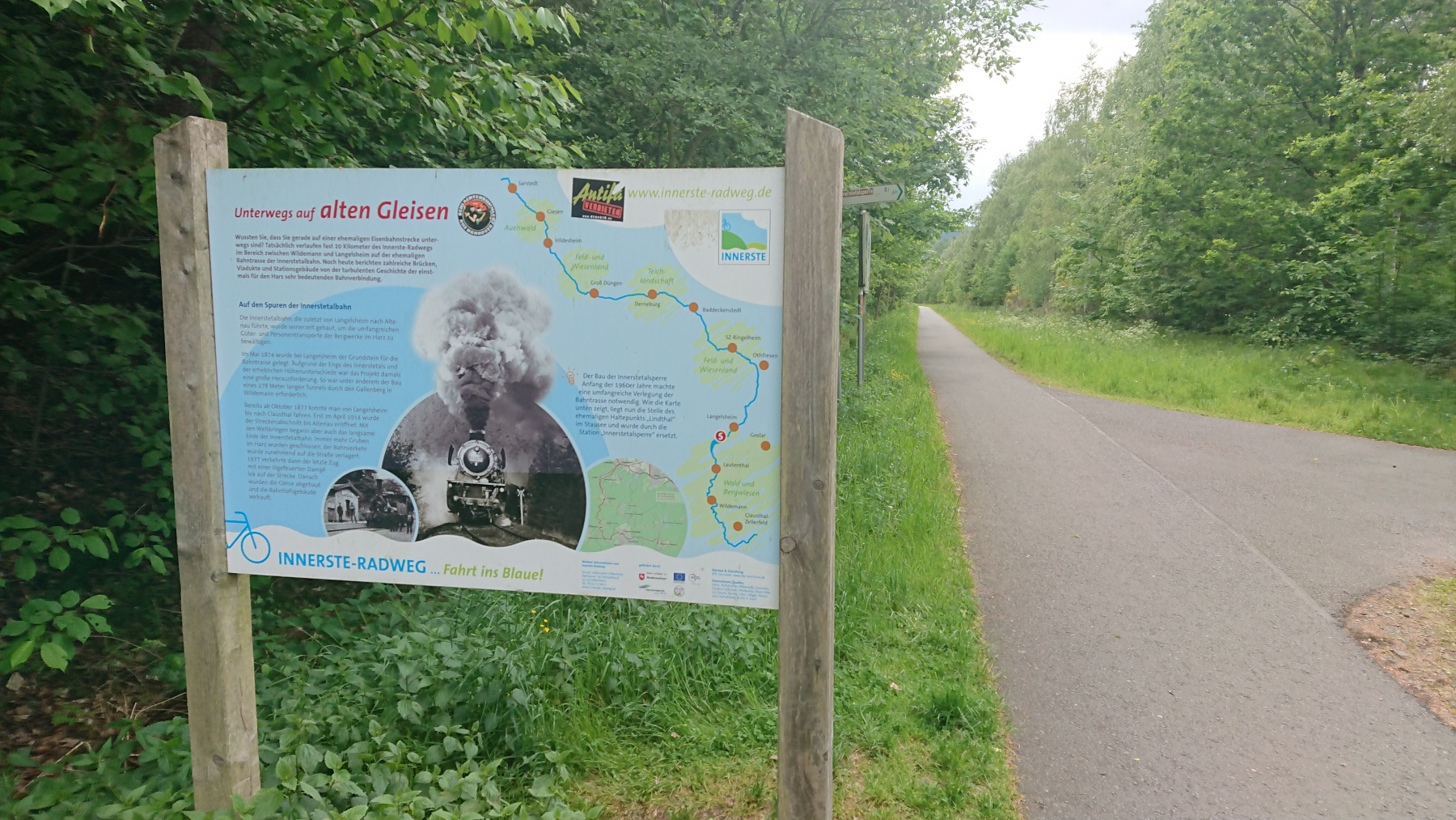 In Langeslheim verlassen wir dann den D3 und fahren auf dem Innerste-Radweg weiter. Vor uns beginnt der Harz, gedanklich haben wir uns auf einen kräftigen Anstieg eingestellt, und ja es geht auch bergan rund 200 Höhenmeter sind noch zu überwinden. Aber das alles auf einer alten Bahntrasse mit gemütlicher Steigung von meist 2-4 %.