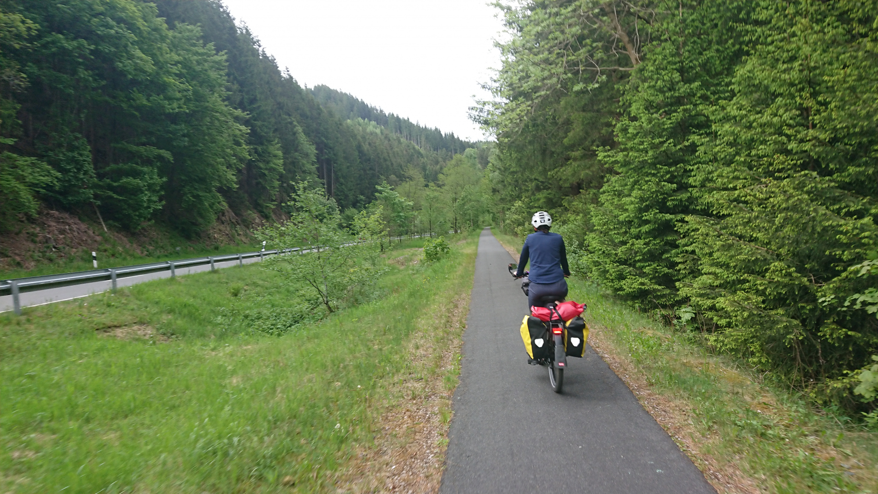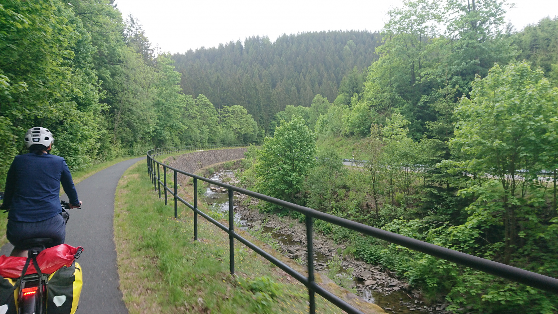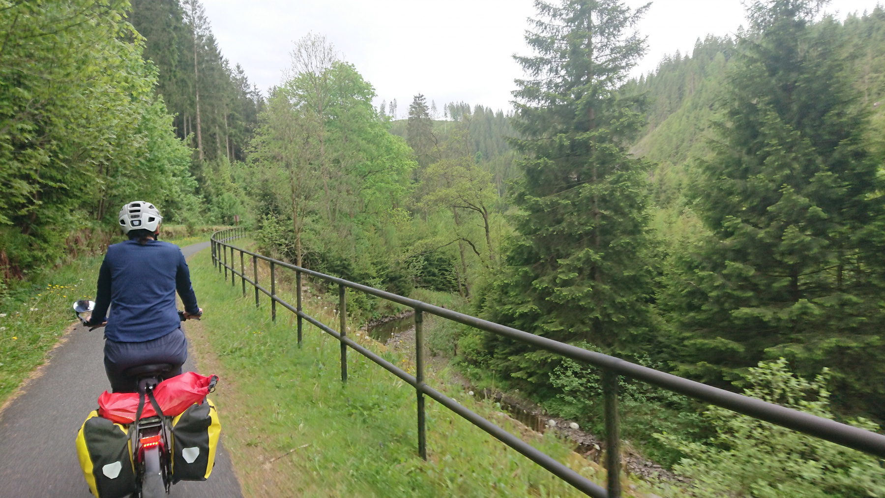 Und dann geht es auf dem Bahndamm weiter hinauf bis nach Wildemann. Unterwegs kommen die Berge der Innerste recht nah und der alte Bahndamm und Fahrradweg liegt eingequetscht zwischen Stein und Fluss.