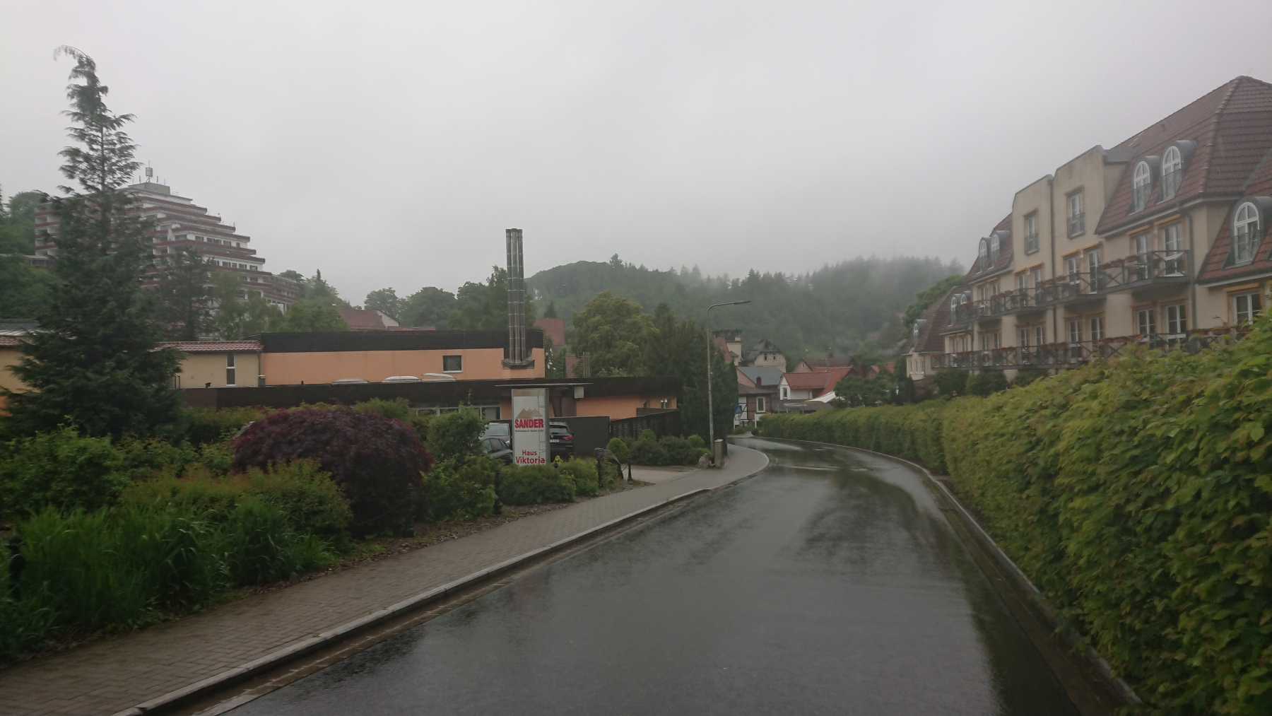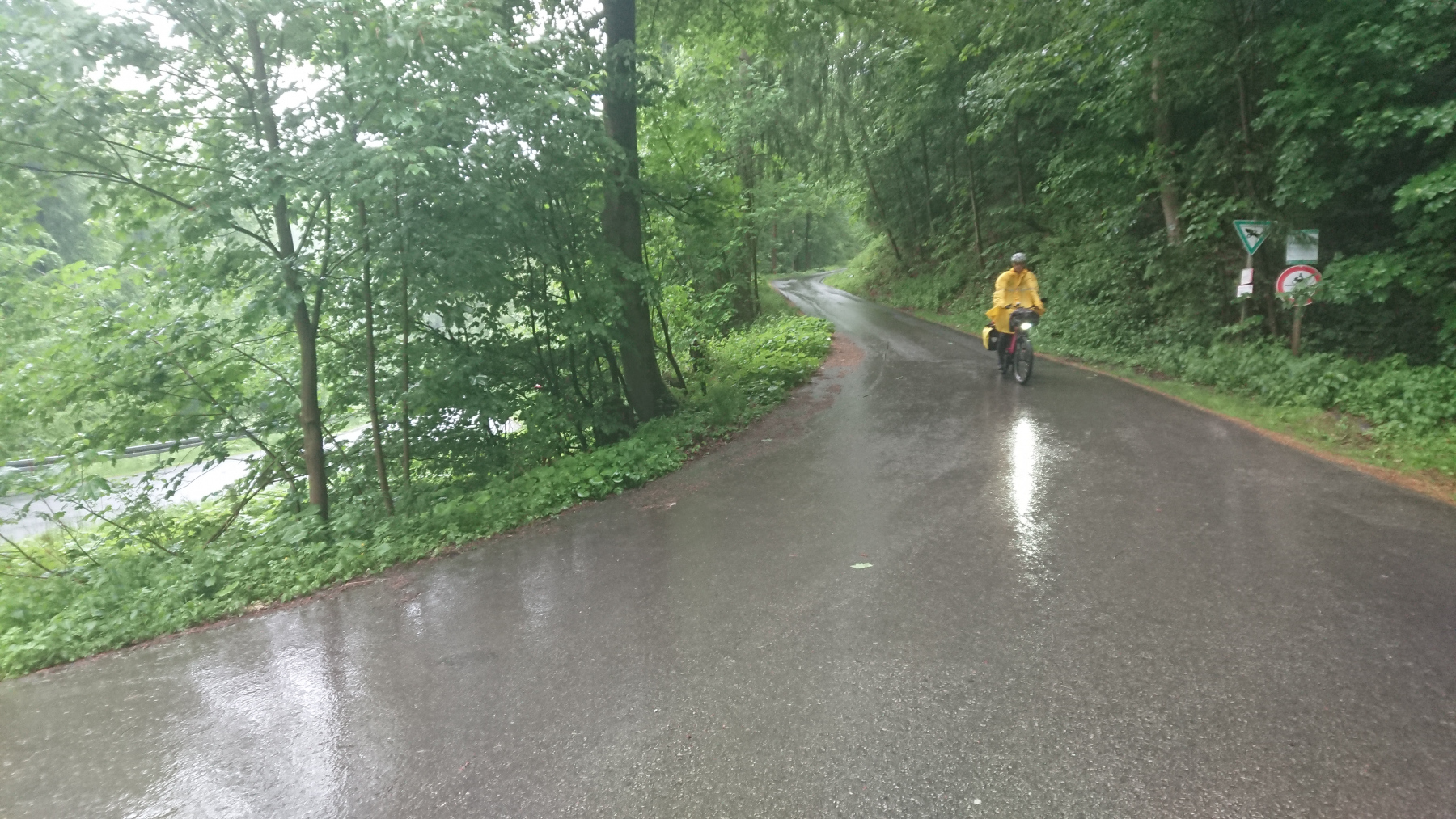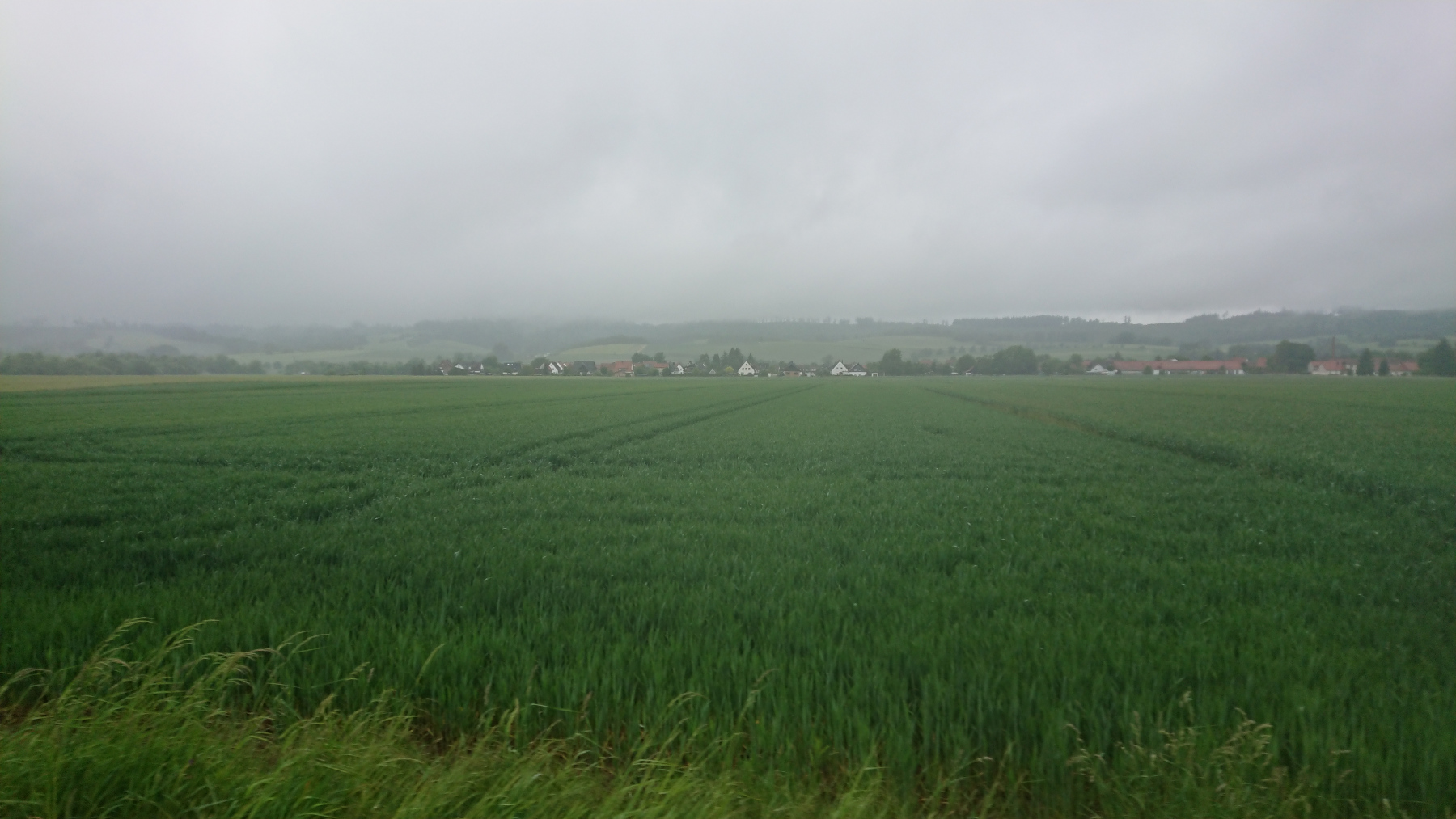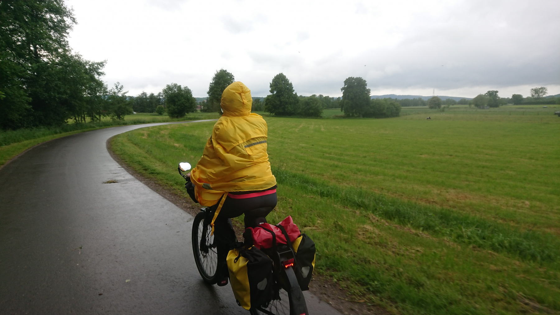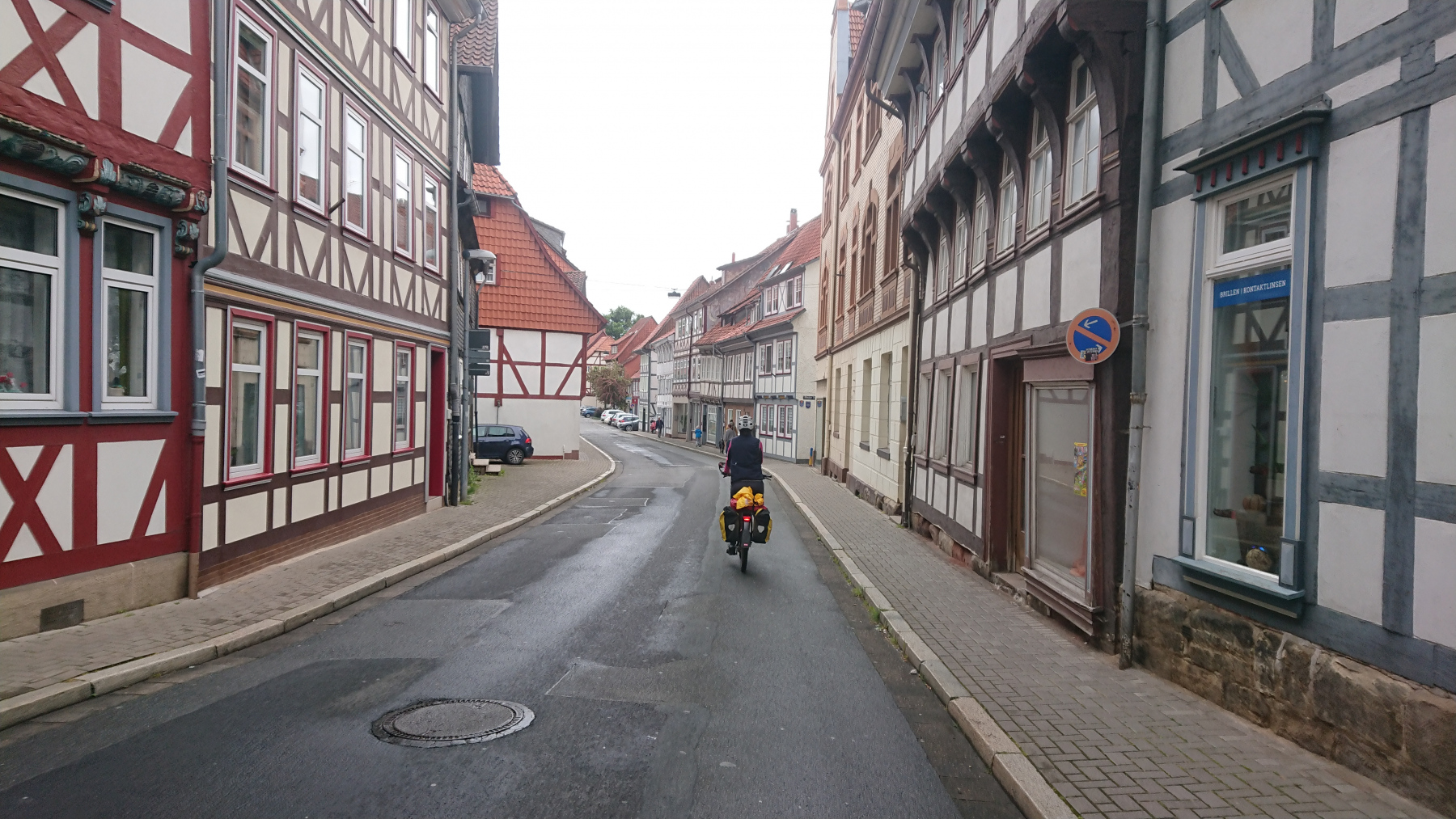 Durch Bad Grund und Windhausen fahren wir wieder aus dem Harz hinaus. Bergab bei Regen ist auch nicht grad toll. Man kann das Gefälle nicht in Geschwindigkeit umsetzen, sieht nur wenig, ständig läuft einem Wasser in die Augen und bremsen sollte man mit viel Gefühl.